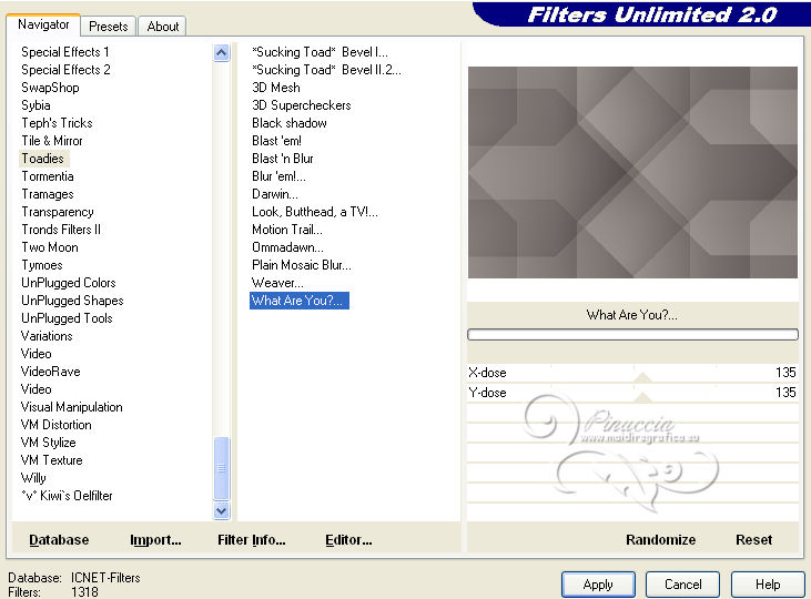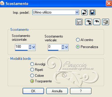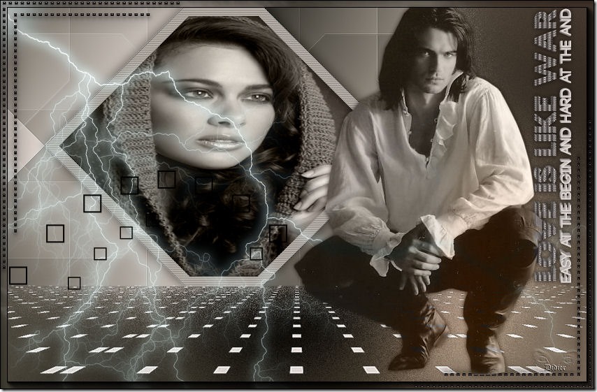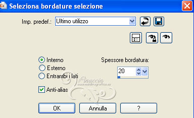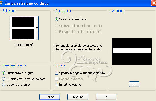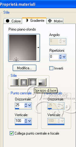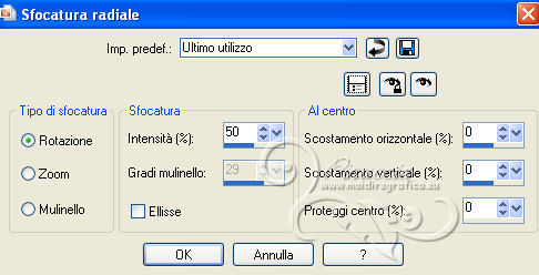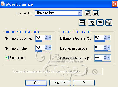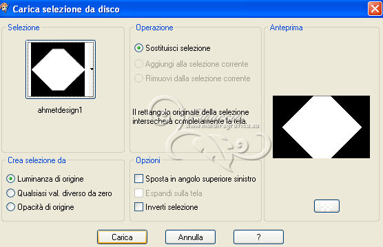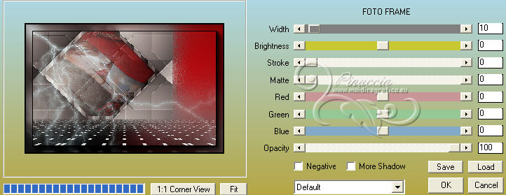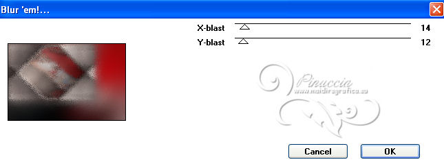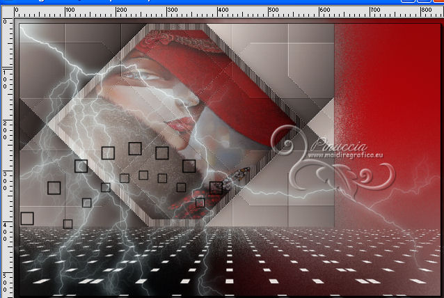 qui puoi trovare qualche risposta ai tuoi dubbi. Se l'argomento che ti interessa non è presente, ti prego di segnalarmelo. Questo tutorial è stato creato con PSP X2 e tradotto con PSPX, ma può essere eseguito anche con le altre versioni. Dalla versione X4, il comando Immagine>Rifletti è stato sostituito con Immagine>Capovolgi in orizzontale, e il comando Immagine>Capovolgi con Immagine>Capovolgi in verticale. Nelle versioni X5 e X6, le funzioni sono state migliorate rendendo disponibile il menu Oggetti. Con la nuova versione X7, sono tornati Rifletti>Capovolgi, ma con nuove varianti. Vedi la scheda sull'argomento qui Occorrente: Materiale qui Il tube dell'uomo è di Hazal Filtri in caso di dubbi, ricorda di consultare la mia sezione filtri qui Filters Unlimited 2.0 qui Simple - Diamonds qui Alien Skin Xenofex 2.0 - Lightning qui Toadies - What are you qui AAA Frames - Foto Frame qui I filtri Simple e Toadies si possono usare da soli o importati in Filters Unlimited Come importare un filtro in Unlimited vedi qui). Se un filtro fornito appare con questa icona ![]() Metti le selezioni nella cartella Selezioni. Apri la maschera in PSP e minimizzala con il resto del materiale. 1. Imposta il colore di primo piano con #e0d7d2, e il colore di sfondo con #231d1d. Passa il colore di primo piano a Gradiente, stile Sprazzo di luce. ![]() 2. Apri una nuova immagine trasparente 850 x 550 pixels, e riempila con il gradiente.3. Effetti>Plugins>Simple - Diamonds. 4. Effetti>Effetti di bordo>Aumenta. Livelli>Duplica. 5. Effetti>Plugins>Toadies - What are you. ![]() Cambia la modalità di miscelatura di questo livello in Sovrapponi, e abbassa l'opacità al 70%. 6. Effetti>Effetti di bordo>Aumenta. Livelli>Unisci>Unisci tutto. 7. Selezione>Carica/Salva selezione>Carica selezione da disco. Cerca e carica la selezione ahmetdesign1. ![]() Livelli>Nuovo livello raster. Apri l'immagine ahmetpsp_picture1 e vai a Modifica>Copia. Torna al tuo lavoro e vai a Modifica>Incolla nella selezione. 8. Selezione>Modifica>Seleziona bordature selezione. ![]() Riporta il colore di primo piano da Gradiente al colore iniziale. Riempi con il colore di primo piano.9. Effetti>Effetti di trama>Veneziana - colore #000000. ![]() 10. Effetti>Effetti 3D>Sfalsa ombra, con il colore nero #000000. ![]() Selezione>Deseleziona. 11. Cambia la modalità di miscelatura di questo livello in Luce diffusa. Livelli>Unisci>Unisci tutto. 12. Immagine>Aggiungi bordatura, 1 pixel, simmetriche, con il colore di sfondo. Immagine>Aggiungi bordatura, simmetriche non selezionato, con il colore bianco #ffffff. ![]() 13. Immagine>Ridimensiona, a 850 pixels di larghezza, tutti i livelli selezionato. ![]() Attiva lo strumento Bacchetta magica ![]() ![]() e clicca nel bordo bianco per selezionarlo. 14. Apri nuovamente l'immagine ahmetpsp_picture1 e vai a Modifica>Copia. Torna al tuo lavoro e vai a Modifica>Incolla nella selezione. Mantieni selezionato. 15. Regola>Sfocatura>Sfocatura radiale. ![]() 16. Regola>Sfocatura>Sfocatura gaussiana - raggio 20. ![]() 17. Effetti>Effetti di trama>Mosaico Antico. ![]() 18. Effetti>Plugins>Toadies - Blur'em, con i settaggi standard. ![]() Selezione>Deseleziona. 19. Livelli>Nuovo livello raster. Riempi con il colore di primo piano.Livelli>Nuovo livello maschera>Da immagine. Apri il menu sotto la finestra di origine e vedrai la lista dei files aperti. Seleziona la maschera 0_5e3a2_6e7ebc95_XL, con i seguenti settaggi. ![]() Premi il tasto K per attivare lo strumento Puntatore ![]() se stai usando PSP 9 il tasto D (valido per tutte le versioni) per attivare lo strumento Deformazione ![]() sposta la maschera sul bordo inferiore, e in modalità Scala spingi il nodo centrale superiore fino al bordo del rombo centrale. ![]() Livelli>Unisci>Unisci gruppo. Effetti>Effetti di bordo>Aumenta. 20. Selezione>Carica/Salva selezione>Carica selezione da disco. Cerca e carica la selezione ahmetdesign2. ![]() Premi sulla tastiera il tasto CANC ![]() Selezione>Deseleziona. Livelli>Unisci>Unisci tutto. 21. Effetti>Plugins>Alien Skin Xenofex 2.0 - Lightning. ![]() 22. Effetti>Plugins>AAA Frames - Foto Frame. ![]() 23. Apri ahmetpsp3 e vai a Modifica>Copia. Torna al tuo lavoro e vai a Modifica>Incolla come nuovo livello. Spostalo in basso a sinistra.![]() Cambia la modalità di miscelatura di questo livello in Luce diffusa. 24. Apri ahmetpaspimage2 e vai a Modifica>Copia. Torna al tuo lavoro e vai a Modifica>Incolla come nuovo livello. Spostalo nell'angolo in alto a sinistra.25. Effetti>Effetti 3D>Sfalsa ombra, con il colore nero #000000. ![]() Livelli>Duplica. Immagine>Rifletti. Immagine>Capovolgi. Apri LoveisLikeWar e vai a Modifica>Copia. Torna al tuo lavoro e vai a Modifica>Incolla come nuovo livello. Spostalo a destra.Effetti>Effetti 3D>Sfalsa ombra, con il colore nero #000000. ![]() Apri il tube Mantubes19-HaZaL e vai a Modifica>Copia. Torna al tuo lavoro e vai a Modifica>Incolla come nuovo livello. Effetti>Effetti di immagine>Scostamento. ![]() Regola>Messa a fuoco>Metti a fuoco. Effetti>Effetti 3D>Sfalsa ombra, con il colore nero #000000. ![]() Aggiungi il tuo nome e/o il tuo watermark su un nuovo livello. Livelli>Unisci>Unisci tutto e salva in formato jpg. Per questi esempi ho usato tubes di Anna.br ![]() ClaudiaViza ![]() ![]() Le vostre versioni. Grazie ![]() Didier ![]() Se hai problemi o dubbi, o trovi un link non funzionante, scrivimi. 18 Aprile 2013 |