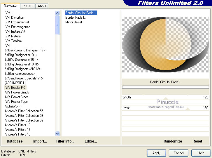 5. Effets>Modules Externes>Filters Unlimited 2.0 - Alf's Border FX - Border Circular Fade, default settings.