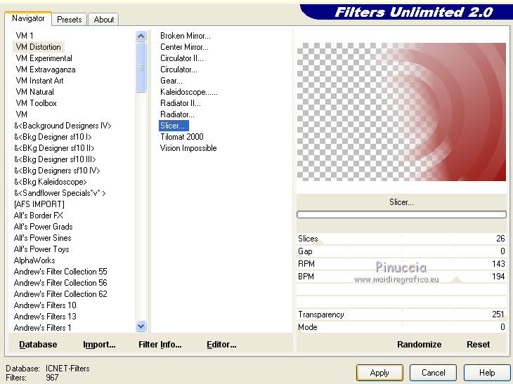 3. Effects>Plugins>Filters Unlimited 2.0 - VM Distortion - Slicer, default settings.