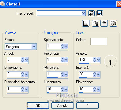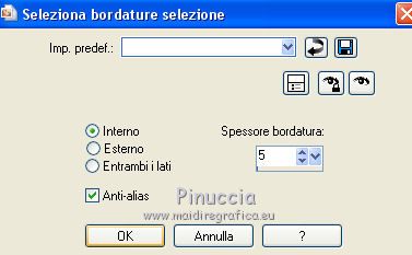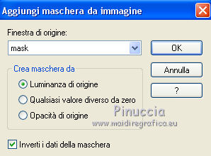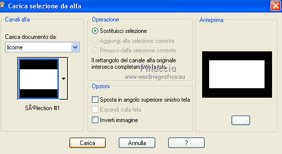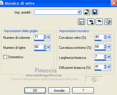 qui puoi trovare qualche risposta ai tuoi dubbi. Se l'argomento che ti interessa non è presente, ti prego di segnalarmelo. Questo tutorial è stato realizzato con Corel 2019 e tradotto con Corel X e CorelX7, ma può essere realizzato anche con le altre versioni di PSP. Dalla versione X4, il comando Immagine>Rifletti è stato sostituito con Immagine>Capovolgi in orizzontale, e il comando Immagine>Capovolgi con Immagine>Capovolgi in verticale. Nelle versioni X5 e X6, le funzioni sono state migliorate rendendo disponibile il menu Oggetti. Con la nuova versione X7, sono tornati Rifletti>Capovolgi, ma con nuove varianti. Vedi la scheda sull'argomento qui traduzione in inglese qui Occorrente: Materiale qui Filtri: se hai problemi con i filtri, consulta la mia sezione filtri qui AAA Filters - Smooth Operator qui Alien Skin Eye Candy 5 Textures - Swirl qui Alien Skin Xenofex 2 - Constellation qui Animation Shop qui ![]() Metti il preset Cliccando sul file una o due volte (a seconda delle tue impostazioni), automaticamente il preset si installerà nella cartella corretta. perchè uno o due clic vedi qui Se preferisci, puoi importare direttamente il preset nel corso del tutorial Come fare vedi la scheda del filtro Eye Candy qui Apri la maschera in PSP e minimizzala con il resto del materiale. 1. Apri l'immagine Alpha licornes. L'immagine, che sarà la base del tuo lavoro, non è vuota, ma contiene una selezione salvata sul canale alfa. 2. Selezione>Seleziona tutto. Apri il tube "fond bleu" e vai a Modifica>Copia. Torna al tuo lavoro e vai a Modifica>Incolla nella selezione. Selezione>Deseleziona. 3. Effetti>Effetti di immagine>Motivo unico, con i settaggi standard. ![]() 4. Regola>Sfocatura>Sfocatura gaussiana - raggio 10. ![]() 5. Effetti>Effetti tecniche di disegno>Pennellate, colore grigio chiaro (#c0c0c0). ![]() 6. Imposta il colore di primo piano con il colore bianco. Livelli>Nuovo livello raster. Riempi il livello con il colore bianco.7. Livelli>Nuovo livello maschera>Da imagine. Apri il menu sotto la finestra di origine e vedrai la lista dei files aperti. Seleziona la maschera mask ![]() Regola>Messa a fuoco>Accentua messa a fuoco. Livelli>Unisci>Unisci gruppo. 8. Immagine>Ridimensiona, al 90%, tutti i livelli non selezionato. 9. Attiva il livello raster 1. Selezione>Carica/Salva selezione>Carica selezione da canale alfa. La selezione è subito disponibile. Devi soltanto cliccare Carica. ![]() Selezione>Innalza selezione a livello. 10. Regola>Sfocatura>Sfocatura radiale. ![]() Selezione>Deseleziona. 11. Effetti>Effetti di trama>Mosaico di vetro. ![]() 12. Livelli>Nuovo livello raster. Selezione>Carica/Salva selezione>Carica selezione da canale alfa. Carica nuovamente la selezione ![]() 13. Modifica>Incolla nella selezione (l'immagine "fond bleu" è sempre in memoria). 14. Effetti>Plugins>AAA Filters - Smooth Operator. ![]() Selezione>Deseleziona. 15. Effetti>Effetti 3D>Sfalsa ombra, colore bianco. ![]() 16. Attiva il livello di sfondo Raster 1. Modifica>Copia. Modifica>Incolla come nuova immagine (per precauzione). 17. Torna al tuo lavoro e rimani sul livello di sfondo. Immagine>Dimensioni tela - 1000 x 700 pixels. ![]() 18. Effetti>Effetti 3D>Sfalsa ombra, con i settaggi precedenti, ma con il colore nero. ![]() 19. Livelli>Nuovo livello raster. Livelli>Disponi>Porta sotto. Imposta il colore di primo piano con un colore scuro della tua immagine Riempi il livello con questo colore.20. Selezione>Seleziona tutto. Selezione>Modifica>Contrai - 5 pixels. Premi sulla tastiera il tasto CANC ![]() Selezione>Inverti. Effetti>Effetti 3D>Smusso a incasso. ![]() Selezione>Deseleziona. 21. Rimani su questo livello. Selezione>Seleziona tutto. Selezione>Modifica>Contrai - 5 pixels. Modifica>Incolla nella selezione (la tua immagine in memoria dal punto 16). 22. Effetti>Plugins>Alien Skin Eye Candy 5 Textures - Swirl seleziona il preset Licornes e ok. ![]() 23. Selezione>Modifica>Contrai - 20 pixels. Selezione>Modifica>Seleziona bordature selezione. ![]() Riempi la selezione con il colore scuro scelto.Effetti>Effetti 3D>Smusso a incasso, con i settaggi precedenti. Selezione>Deselezoina. 24. Selezione>Seleziona tutto. Selezione>Modifica>Contrai - 30 pixels. Regola>Sfocatura>Sfocatura gaussiana - raggio 10. ![]() 25. Effetti>Effetti di trama>Ciottoli. ![]() Selezione>Deseleziona. 26. Attiva il livello superiore. Copia/Incolla come nuovo livello i tube forniti, ridimensionali e posizionali correttamente.Effetti>Effetti 3D>Sfalsa ombra, a scelta. 27. Firma il tuo lavoro su un nuovo livello. Immagine>Ridimensiona, 900 pixels di larghezza, tutti i livelli selezionato. 28. Se non vuoi realizzare l'animazione: Livelli>Unisci>Unisci tutto e salva in formato jpg. 29. Se vuoi realizzare l'animazione, non unire i livelli, e attiva il livello della maschera. Effetti>Plugins>Alien Skin Xenofex 2 - Constellation Setting: Glimmer, con i seguenti settaggi. ![]() 30. Modifica>Copia Speciale>Copia Unione. Apri Animation Shop e vai a Modifica>Incolla>Incolla come nuova animazione. 31. Torna su PSP. Modifica>Annulla azione Constellation. Ripeti Effetti>Plugins>Alien Skin Xenofex 2 - Constellation, clicca su Random Seed e ok. Modifica>Copia Speciale>Copia Unione. Torna in Animation Shop e vai a Modifica>Incolla>Incolla dopo il fotogramma corrente. 32. Di nuovo in PSP. Modifica>Annulla azione Constellation. Ripeti Effetti>Plugins>Alien Skin Xenofex 2 - Constellation, clicca su Random Seed e ok. Modifica>Copia Speciale>Copia Unione. In Animation Shop: Modifica>Incolla>Incolla dopo il fotogramma corrente. 33. Controlla il risultato cliccando su Visualizza ![]() e salva in formato gif. Altra versione (tube non firmato) ![]() ![]() Le vostre versioni. Grazie ![]() Lina ![]() ![]() Marygraphics ![]() Puoi scrivermi se hai problemi o dubbi, o trovi un link che non funziona, o soltanto per un saluto. 14 Maggio 2019 |