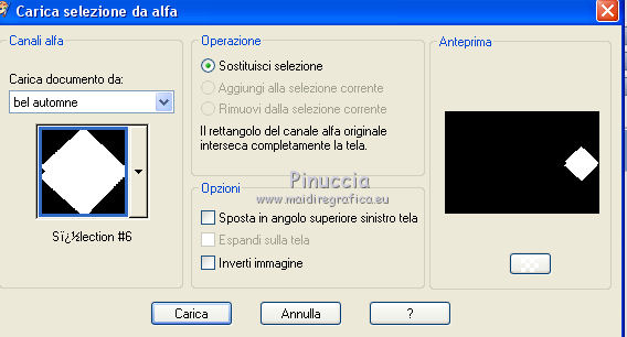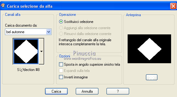 qui puoi trovare qualche risposta ai tuoi dubbi. Se l'argomento che ti interessa non è presente, ti prego di segnalarmelo. Questo tutorial è stato realizzato con Corel 2019 e tradotto con Corel X e CorelX7, ma può essere realizzato anche con le altre versioni di PSP. Dalla versione X4, il comando Immagine>Rifletti è stato sostituito con Immagine>Capovolgi in orizzontale, e il comando Immagine>Capovolgi con Immagine>Capovolgi in verticale. Nelle versioni X5 e X6, le funzioni sono state migliorate rendendo disponibile il menu Oggetti. Con la nuova versione X7, sono tornati Rifletti>Capovolgi, ma con nuove varianti. Vedi la scheda sull'argomento qui traduzione in inglese qui le vostre versioni qui Occorrente: Materiale qui Per l'immagine grazie Sonia. La maschera è di Alyciane. (in questa pagina trovi i links ai siti dei creatori di tubes) Filtri: se hai problemi con i filtri, consulta la mia sezione filtri qui Filters Unlimited 2.0 qui VM Toolbox qui I filtri VM Toolbox si possono usare da soli o importati in Filters Unlimited (come fare vedi qui) Se un filtro fornito appare con questa icona ![]() Apri la maschera in PSP e minimizzala con il resto del materiale. 1. Imposta il colore di primo piano con #47cdb1. 2. Apri Alpha_Bel automne. Questa immagine, che sarà la base del tuo lavoro non è vuota, ma contiene le selezioni salvate sul canale alfa. Selezione>Seleziona tutto. Apri l'immagine di Sonia e vai a Modifica>Copia. Torna al tuo lavoro e vai a Modifica>Incolla nella selezione. Selezione>Deseleziona. 3. Effetti>Effetti di immagine>Motivo unico, con i settaggi standard. ![]() 4. Regola>Sfocatura>Sfocatura radiale. ![]() 5. Livelli>Nuovo livello raster. Riempi con il colore di primo piano #47cdb1.Livelli>Nuovo livello maschera>Da immagine. Apri il menu sotto la finestra di origine e vedrai la lista dei files aperti. Seleziona la maschera mask alyciane. ![]() Livelli>Unisci>Unisci gruppo. Regola>Messa a fuoco>Metti a fuoco. 6. Effetti>Effetti 3D>Sfalsa ombra. ![]() 7. Livelli>Nuovo livello raster. Selezione>Carica/Salva selezione>Carica selezione da canale alfa. La selezione sélection#1 è subito disponibile. Devi soltanto Cliccare Carica. ![]() Modifica>Incolla nella selezione (l'immagine di Sonia è sempre in memoria). 8. Effetti>Plugins>VM Toolbox - Transistor gioca con i colori se stai usando un altro tube ![]() Selezione>Deseleziona. 9. Rimani su questo livello. Selezione>Carica/Salva selezione>Carica selezione da canale alfa. Apri il menu delle selezioni e carica Sélection#2. ![]() Modifica>Incolla nella selezione (l'immagine di Sonia è sempre in memoria). 10. Effetti>Plugins>VM Toolbox - Remove Gray ![]() Selezione>Deseleziona. 11. Rimani su questo livello. Selezione>Carica/Salva selezione>Carica selezione da canale alfa. Apri il menu delle selezioni e carica Sélection#3. ![]() Modifica>Incolla nella selezione (l'immagine di Sonia è sempre in memoria). Effetti>Plugins>VM Toolbox - Reductor (gioca con i colori se stai usando un altro tube) ![]() Selezione>Deseleziona. 12. Sullo stesso livello. Selezione>Carica/Salva selezione>Carica selezione da canale alfa. Apri il menu delle selezioni e carica Sélection#4. ![]() Modifica>Incolla nella selezione l'immagine di Sonia. Effetti>Plugins>VM Toolbox - Radial Noise. ![]() Selezione>Deseleziona. 13. Sullo stesso livello. Selezione>Carica/Salva selezione>Carica selezione da canale alfa. Apri il menu delle selezioni e carica Sélection#5. ![]() Modifica>Incolla nella selezione l'immagine di Sonia. Effetti>Plugins>VM Toolbox - Tiler. ![]() Selezione>Deseleziona. 14. Sullo stesso livello. Selezione>Carica/Salva selezione>Carica selezione da canale alfa. Apri il menu delle selezioni e carica Sélection#6. ![]() Modifica>Incolla nella selezione l'immagine di Sonia. Effetti>Plugins>VM Toolbox - Trimosaic. ![]() Selezione>Deseleziona. 15. Sullo stesso livello. Selezione>Carica/Salva selezione>Carica selezione da canale alfa. Apri il menu delle selezioni e carica Sélection#7. ![]() Modifica>Incolla nella selezione l'immagine di Sonia. Effetti>Plugins>VM Toolbox - Square Blur. ![]() Selezione>Deseleziona. 16. Sullo stesso livello. Selezione>Carica/Salva selezione>Carica selezione da canale alfa. Apri il menu delle selezioni e carica Sélection#8. ![]() Modifica>Incolla nella selezione l'immagine di Sonia. Effetti>Plugins>VM Toolbox - Soft Border. ![]() Selezione>Deseleziona. 17. Sposta questo livello sotto il livello della maschera. ![]() 18. Livelli>Unisci>Unisci tutto. 19. Immagine>Aggiungi bordatura, 5 pixels, simmetriche, colore di primo piano #47cdb1. Selezione>Seleziona tutto. Immagine>Aggiungi bordatura, 50 pixels, simmetriche colore bianco. Effetti>Effetti 3D>Sfalsa ombra, colore nero. ![]() Selezione>Inverti. Modifica>Incolla nella selezione (hai sempre in memoria l'immagine di Sonia) Effetti>Plugins>VM Toolbox - Zoom Blur. ![]() Selezione>Inverti. Effetti>Effetti 3D>Sfalsa ombra, con i settaggi precedenti. ![]() Selezione>Deseleziona. Immagine>Aggiungi bordatura, 5 pixels, simmetriche, colore di primo piano #47cdb1. Decora e firma il tuo lavoro. Immagine>Ridimensiona, 900 pixels di larghezza, tutti i livelli selezionato. Salva in formato jpg. Il tube di questo esempio è di Lize ![]() ![]() La mia mail è nel menu in cima alla pagina. Puoi scrivermi se hai problemi o dubbi, o trovi un link che non funziona, o soltanto per un saluto. Se vorrai mandarmi la tua versione, sarò lieta di pubblicarla. 19 Novembre 2018 |