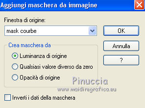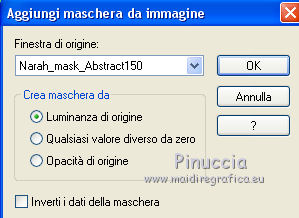 qui puoi trovare qualche risposta ai tuoi dubbi. Se l'argomento che ti interessa non è presente, ti prego di segnalarmelo. Questo tutorial è stato realizzato con Corel 2018 e tradotto con Corel X, ma può essere realizzato anche con le altre versioni di PSP. Dalla versione X4, il comando Immagine>Rifletti è stato sostituito con Immagine>Capovolgi in orizzontale, e il comando Immagine>Capovolgi con Immagine>Capovolgi in verticale. Nelle versioni X5 e X6, le funzioni sono state migliorate rendendo disponibile il menu Oggetti. Con la nuova versione X7, sono tornati Rifletti>Capovolgi, ma con nuove varianti. Vedi la scheda sull'argomento qui traduzione in inglese qui Occorrente: Materiale qui Per i tubes grazie SusuLuz (donna) Logane (occhi), Guismo (nuvole). Per una maschera grazie Narah. Il misted trovato su Internet. (in questa pagina trovi i links ai siti dei creatori di tubes) Filtri: se hai problemi con i filtri, consulta la mia sezione filtri qui Flaming Pear - Flood qui ![]() Apri le maschere in PSP e minimizzale con il resto del materiale. 1. Apri una nuova immagine trasparente 900 x 600 pixels. Selezione>Seleziona tutto. Apri l'immagine di sfondo image_fond e vai a Modifica>Copia. Torna al tuo lavoro e vai a Modifica>Incolla nella selezione. Selezione>Deseleziona. 2. Effetti>Effetti di immagine>Motivo unico, con i settaggi standard. ![]() 3. Regola>Sfocatura>Sfocatura radiale. ![]() 4. Apri il misted nuages e vai a Modifica>Copia. Torna al tuo lavoro e vai a Modifica>Incolla come nuovo livello. Spostalo in alto, vedi il mio esempio.5. Apri il misted del paesaggio e vai a Modifica>Copia. Torna al tuo lavoro e vai a Modifica>Incolla come nuovo livello. Spostalo un po' più in basso.![]() Cambia la modalità di miscelatura di questo livello in Luce netta (o secondo le tue immagini). 6. Imposta il colore di primo piano con il colore bianco Abbassa l'opacità dello strumento Riempimento al 60%. Livelli>Nuovo livello raster. Riempi il livello con il colore bianco.7. Livelli>Nuovo livello maschera>Da immagine. Apri il menu sotto la finestra di origine e vedrai la lista dei files aperti. Seleziona la maschera mask courbe. ![]() Livelli>Unisci>Unisci gruppo. Regola>Messa a fuoco>Metti a fuoco. Cambia la modalità di miscelatura di questo livello in Sovrapponi. 8. Livelli>Nuovo livello raster. Riempi il livello con il colore bianco, opacità sempre à 60.ne pas oublier de place à nouveau l'opacité de l'outil Pot de peinture à 100 9. Livelli>Nuovo livello maschera>Da immagine. Apri il menu sotto la finestra di origine e vedrai la lista dei files aperti. Seleziona la maschera Narah_Mask_Abstract150. ![]() Livelli>Unisci>Unisci gruppo. Regola>Messa a fuoco>Metti a fuoco. Cambia la modalità di miscelatura di questo livello in Sovrapponi. Immagine>Capovolgi Sposta in basso a sinistra![]() 10. Apri il tube degli occhi e vai a Modifica>Copia. Torna al tuo lavoro e vai a Modifica>Incolla come nuovo livello. Spostalo in alto a sinistra.11. Apri il tube della donna e vai a Modifica>Copia. Torna al tuo lavoro e vai a Modifica>Incolla come nuovo livello. Immagine>Rifletti. Immagine>Ridimensiona, al 75%, tutti i livelli non selezionato. Sposta il tube in basso a destra.![]() 12. Effetti>Plugins>Flaming Pear - Flood - scegli un colore dal tuo sfondo. ![]() 13. Controlla che tutto sia a posto. Livelli>Unisci>Unisci tutto. 14. Immagine>Aggiungi bordatura, 2 pixels, simmetriche, con un colore scuro del tuo sfondo. Immagine>Aggiungi bordatura, 10 pixels, simmetriche, colore bianco. Immagine>Aggiungi bordatura, 2 pixels, simmetriche, con un colore scuro del tuo sfondo. Immagine>Aggiungi bordatura, 30 pixels, simmetriche, colore bianco. 15. Firma il tuo lavoro. Immagine>Ridimensiona, 900 pixels di larghezza, tutti i livelli selezionato. Salva in formato jpg. ![]() La mia mail è nel menu in cima alla pagina. Puoi scrivermi se hai problemi o dubbi, o trovi un link che non funziona, o soltanto per un saluto. Se vorrai mandarmi la tua versione, sarò lieta di pubblicarla. 7 Settembre 2018 |