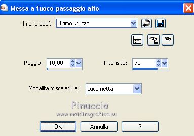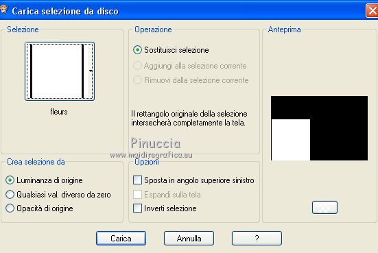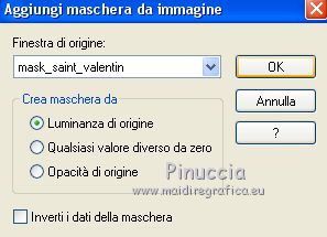 qui puoi trovare qualche risposta ai tuoi dubbi. Se l'argomento che ti interessa non è presente, ti prego di segnalarmelo. Questo tutorial è stato realizzato con Corel 2019 e tradotto con Corel X e CorelX7, ma può essere realizzato anche con le altre versioni di PSP. Dalla versione X4, il comando Immagine>Rifletti è stato sostituito con Immagine>Capovolgi in orizzontale, e il comando Immagine>Capovolgi con Immagine>Capovolgi in verticale. Nelle versioni X5 e X6, le funzioni sono state migliorate rendendo disponibile il menu Oggetti. Con la nuova versione X7, sono tornati Rifletti>Capovolgi, ma con nuove varianti. Vedi la scheda sull'argomento qui traduzione in inglese qui Occorrente: Materiale qui Filtri: se hai problemi con i filtri, consulta la mia sezione filtri qui Filters Unlimited 2.0 - qui Flaming Pear - Flexify 1 qui Alien Skin Eye Candy 5 Impact - Glass qui ![]() Metti il preset Cliccando sul file una o due volte (a seconda delle tue impostazioni), automaticamente il preset si installerà nella cartella corretta. perchè uno o due clic vedi qui Se preferisci, puoi importare direttamente il preset nel corso del tutorial Come fare vedi la scheda del filtro Eye Candy qui Metti la selezione nella cartella Selezioni. Apri la maschera in PSP e minimizzala con il resto del materiale 1. Apri una nuova immagine trasparente 900 x 600 pixels. 2. Selezione>Seleziona tutto. Apri l'immagine di sfondo paper2 e vai a Modifica>Copia. Torna al tuo lavoro e vai a Modifica>Incolla nella selezione. Selezione>Deseleziona. 3. Regola>Sfocatura>Sfocatura gaussiana - raggio 50. ![]() 4. Effetti>Plugins>Filters Unlimited 2.0 - Lens Effects - Broken Glass, con i settaggi standard. ![]() Regola>Messa a fuoco>Metti a fuoco. 5. Imposta il colore di primo piano con il colore bianco #ffffff. Livelli>Nuovo livello raster. Riempi il livello con il colore bianco6. Livelli>Nuovo livello maschera>Da immagine. Apri il menu sotto la finestra di origine e vedrai la lista dei files aperti. Seleziona la maschera mask_saint_valentin. ![]() Regola>Messa a fuoco>Accentua messa a fuoco. Livelli>Unisci>Unisci gruppo. 7. Modifica>Taglia (questo comando oltre a tagliare tiene anche in memoria) Selezione>Carica/Salva selezione>Carica selezione da disco. Cerca e carica la selezione fleurs ![]() Sul livello della maschera rimasto vuoto (per questo non occorre aggiungere un nuovo livello): Modifica>Incolla nella selezione ![]() Selezione>Deseleziona. Regola>Messa a fuoco>Metti a fuoco. Minimizza il lavoro per il momento. 8. Attiva nuovamente l'immagine di sfondo papier 2. Effetti>Plugins>Flaming Pear - Flexify 2. ![]() Immagine>Ridimensiona, al 40%, tutti i livelli non selezionato. Effetti>Plugins>Alien Skin Eye Candy 5 Impact - Glass. Seleziona il preset coeur e ok ![]() Regola>Messa a fuoco>Messa a fuoco passaggio alto ![]() per il mio esempio ho fatto soltanto Accentua messa a fuoco, perchè il risultato dava un'ombra troppo scura; decidi tu 9. Modifica>Copia. Torna al tuo lavoro originale e vai a Modifica>Incolla come nuovo livello. Posiziona il cuore sulla mascheraLivelli>Unisci>Unisci giù. Effetti>Effetti 3D>Sfalsa ombra, colore bianco. ![]() Sposta l'immagine un po' più in alto.![]() 10. Livelli>Duplica. Immagine>Ridimensiona, al 50%, tutti i livelli non selezionato. Posiziona correttamente![]() 11. Apri il tube del paesaggio Misted, cancella il watermark, e vai a Modifica>Copia. Torna al tuo lavoro e vai a Modifica>Incolla come nuovo livello. Spostalo in alto a destra.12. Apri il tube dell'uomo e vai a Modifica>Copia. Torna al tuo lavoro e vai a Modifica>Incolla come nuovo livello. Spostalo al centro.13. Apri il tube della donna e vai a Modifica>Copia. Torna al tuo lavoro e vai a Modifica>Incolla come nuovo livello. Spostalo a destra.14. Livelli>Unisci>Unisci tutto. 15. Immagine>Aggiungi bordatura, 2 pixels, simmetriche, con un colore scuro del tuo lavoro. Immagine>Aggiungi bordatura, 20 pixels, simmetriche, colore bianco. Immagine>Aggiungi bordatura, 2 pixels, simmetriche, con il colore scuro. Immagine>Aggiungi bordatura, 40 pixels, simmetriche, colore bianco. Immagine>Aggiungi bordatura, 1 pixel, simmetriche, colore nero. 16. Apri il tube texte, o il tuo testo, e vai a Modifica>Copia. Torna al tuo lavoro e vai a Modifica>Incolla come nuovo livello. Spostalo in alto al centro.17. Immagine>Ridimensiona, 950 pixels di larghezza, tutti i livelli selezionato. 18. Firma il tuo lavoro e salva in formato jpg. ![]() Il tube di questo esempio è di Criss ![]() Puoi scrivermi se hai problemi o dubbi, o trovi un link che non funziona, o soltanto per un saluto. 21 Febbraio 2019 |