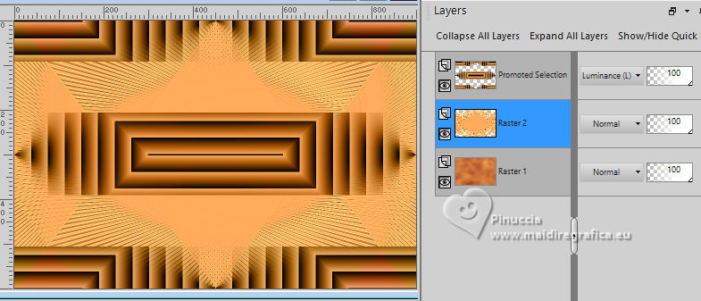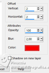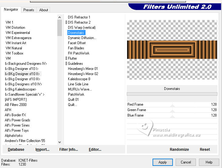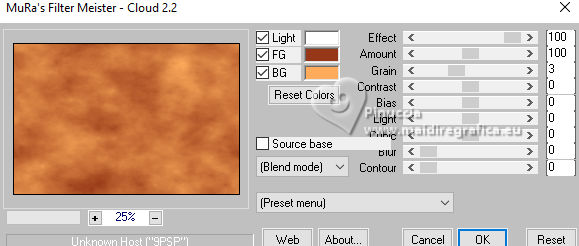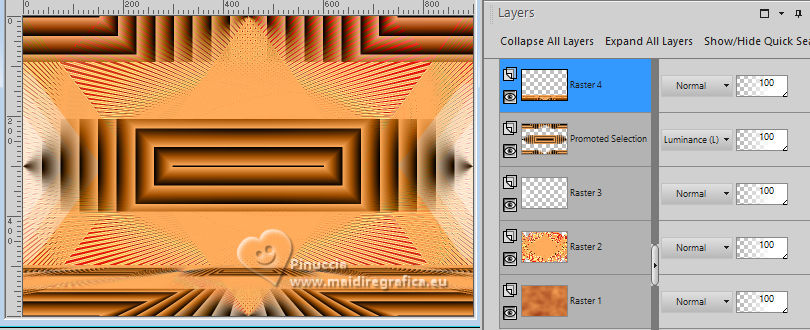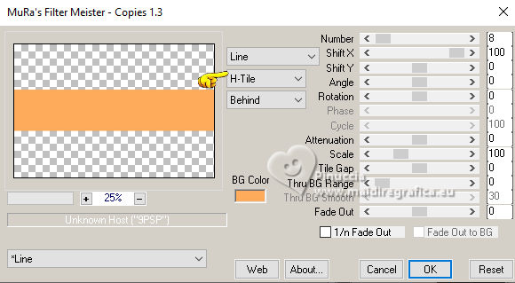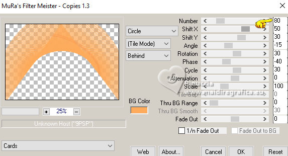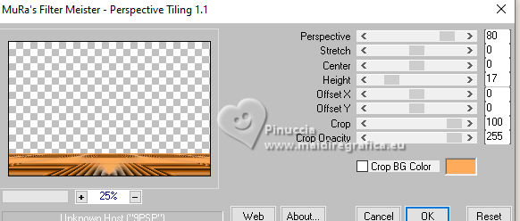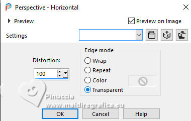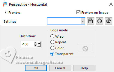 ![]() For this tutorial, you will need: ![]() Material by Ana Maria C. (The links of the tubemakers here). ![]() Filters Unlimited 2.0 here Mura's Meister - Perspective Tiling, Cloud, Copies here &<Bkg Designer sf10II> - Downstairs (to import in Unlimited) here Graphics Plus - Cross Shadow here Filters Graphics plus can be used alone or imported into Filters Unlimited. (How do, you see here) If a plugin supplied appears with this icon ![]() You can change Blend Modes according to your colors. In the newest versions of PSP, you don't find the foreground/background gradient (Corel_06_029). You can use the gradients of the older versions. The Gradient of CorelX here ![]() Colors ![]() 1. Set your foreground color to #963817, and your background color to #feac5c ![]() color 3: #ff0000 color 4: #ffffff 2. Open AlphaChannel_byAnaMariaC Window>Duplicate or, on the keyboard, shift+D to make a copy. Close the original. The copy, that will be the basis of your work, is not empty, but contains a selection saved to alpha channel. 3. Effects>Plugins>Mura's Meister - Cloud ![]() The result of this effects is random, so it won't be the same as mine. If you want to change the appearance of the clouds, click on the preview window, until you'll see the result you like better. Adjust>Blur>Gaussian Blur - radius 20 ![]() Layers >New Raster Layer. Flood Fill the layer with your background color #feac5c.4. Effects>Geometric Effects>Perspective horizontal ![]() Effects>Geometric Effects>Perspective horizontal ![]() Result ![]() 5. Effects>Plugins>Mura's Meister - Copies. ![]() Adjust>Sharpness>Sharpen. Image>Mirror>Mirror Horizontal. 6. Layers>Duplicate. Image>Mirror>Mirror Vertical (Image>Flip) Layers>Merge>Merge Down. Adjust>Sharpness>Sharpen More. 7. Selections>Load/Save Selections>Load Selection from Alpha Channel. The selection Selection #1 is immediately available. You just have to click Load. ![]() Flood Fill the selection with your background color #feac5c.Selections>Promote Selection to Layer. Selections>Select None. 8. Effects>Plugins>Mura's Meister - Copies ![]() 9. Effects>Plugins>Filters Unlimited 2.0 - &<Bkg Designer sf10II> - Downstairs, default settings. ![]() 10. Effects>Image Effects>Seamless Tiling, default settings ![]() Layers>Properties>General>Blend Mode: Luminance (L) - Opacity: 100, or to your liking. 11. Activate the layer Raster 2. ![]() Effects>3D Effects>Drop Shadow - color extra: #ff0000 ![]() Repeat Drop Shadow, vertical and horizontal -2. Adjust>Sharpness>Sharpen More. 12. Open decor_byAnaMariaC ![]() Edit>Copy. Go back to your work and go to Edit>Paste As New Layer. 13. Activate your top layer, Promoted Selection. Edit>Copy Special>Copy Merged. Edit>Paste As New Layer. Effects>Image Effects>Seamless Tiling, default settings ![]() 14. Effects>Plugins>Mura's Meister - Perspective Tiling. ![]() 15. Your tag and the layers ![]() 16. Activate your Magic Wand Tool feather 60,and click in the transparent part to select it. ![]() Press 7 times CANC on the keyboard ![]() Selections>Select None. 17. Image>Add Borders, 2 pixels, symmetric, background color #feac5c. Image>Add Borders, 4 pixels, symmetric, foreground color #963817 Image>Add Borders, 2 pixels, symmetric, background color #feac5c. 18. Selections>Select All. 19. Image>Add Borders, 25 pixels, symmetric, foreground color #963817 Image>Add Borders, 10 pixels, symmetric, color white #ffffff mage>Add Borders, 25 pixels, symmetric, foreground color #963817 Selections>Invert. 20. Effects ![]() 21. Selections>Invert. Effects>3D Effects>Drop Shadow, color black #000000 ![]() Selections>Select None. 22. Open the tube Tube57_Mulher_byAnaMariaC ![]() Edit>Copy. Go back to your work and go to Edit>Paste as new layer. Adjust>Sharpness>Sharpen. Move the tube to your liking.Effects>3D Effects>Drop Shadow, color black #000000 or to your liking. ![]() 23. Open WordArt_titulo_byAnaMariaC. ![]() Edit>Copy. Go back to your work and go to Edit>Paste as new layer. Place the text to your liking.24. Image>Add Borders, 1 pixel, symmetric, color black #000000. 25. Image>Resize, if you want. Sign your work and save as jpg. ![]() ![]() Your versions.Thanks![]() ![]() If you have problems or doubts, or you find a not worked link, or only for tell me that you enjoyed this tutorial, write to me. |