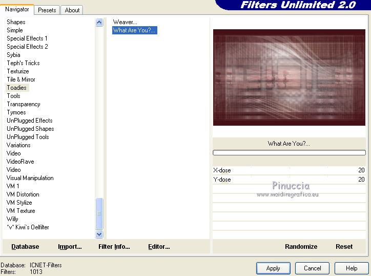Filtres Mura's Seamless, Toadies, Transparency, Simple et Screenworks peuvent être utilisés seuls ou importés dans Filters Unlimited.