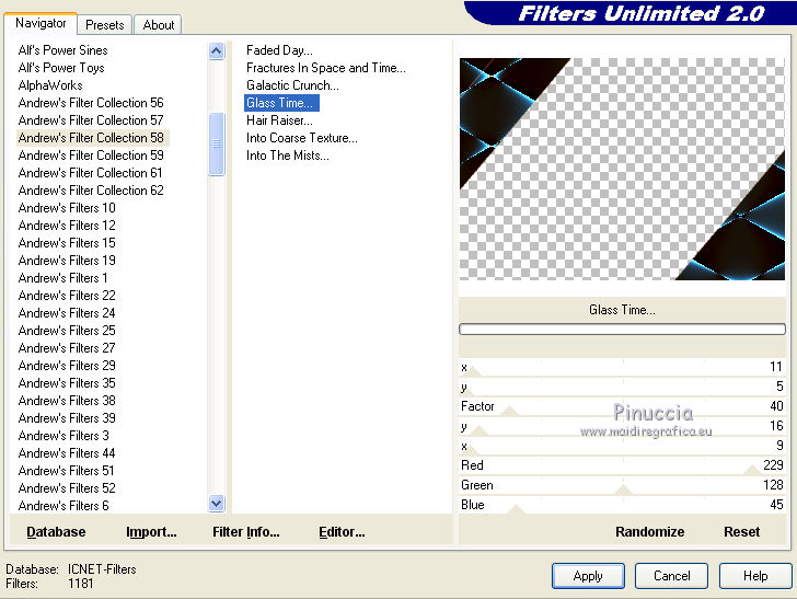 5. Effets>Modules Externes>Filters Unlimited 2.0 - Andrew’s Filter Collection 58 – Glass Time.