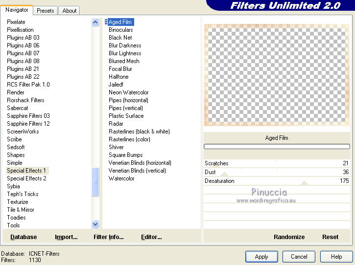 30. Effets>Modules Externes>Filters Unlimited 2.0 – Special Effects 1 – Aged Film.