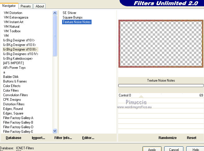 49. Effets>Modules Externes>Filters Unlimited 2.0 - &<Bkg Designer sf10III> - Texture Noise Notes.