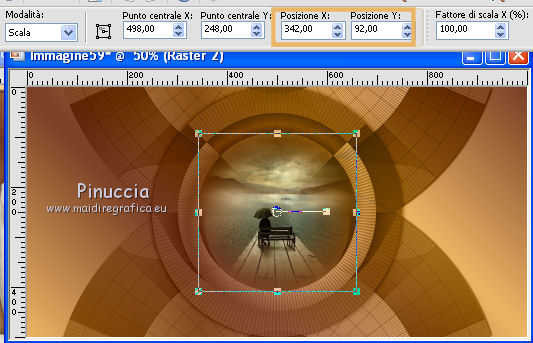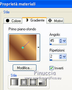 qui puoi trovare qualche risposta ai tuoi dubbi. Se l'argomento che ti interessa non è presente, ti prego di segnalarmelo. Questo tutorial è stato creato con PSP X2, ma può essere eseguito anche con le altre versioni di PSP. Dalla versione X4, il comando Immagine>Rifletti è stato sostituito con Immagine>Capovolgi in orizzontale, e il comando Immagine>Capovolgi con Immagine>Capovolgi in verticale. Nelle versioni X5 e X6, le funzioni sono state migliorate rendendo disponibile il menu Oggetti. Con la versione X7 sono tornati i comandi Immagine>Rifletti e Immagine>Capovolgi, ma con nuove funzioni. Vedi la scheda sull'argomento qui Per tradurre questo tutorial ho usato PSP X. traduzione francese/traduction française qui/ici le vostre versioni/vos versions qui/ici Occorrente: Materiale qui Tube della donna: kTs_juan-medina Tube dell'uomo: Annelies (Alies 210-Mann) Paesaggio di Aclis Filtri: in caso di dubbi, ricorda di consultare la mia sezione filtri qui Filters Unlimited 2.0 qui Filter Factory Gallery P (nel materiale) Flaming Pear - Flexify 2 qui Mura's Meister - Copies qui I filtri Factory Gallery si possono usare da soli o importati in Filters Unlimited (come fare vedi qui) Se un filtro fornito appare con questa icona ![]() 1. Imposta il colore di primo piano con #783e26, e il colore di sfondo con #ebb666. ![]() Passa il colore di primo piano a Gradiente lineare: ![]() 2. Apri una nuova immagine trasparente 1000 x 500 pixels, e riempila con il gradiente.3. Regola>Sfocatura>Sfocatura gaussiana - raggio 15. ![]() 4. Livelli>Duplica. 5. Effetti>Plugins>Filter Factory Gallery P - Frame 21 Seamless. ![]() Cambia la modalità di miscelatura di questo livello in Luminanza (Esistente), e abbassa l'opacità all'80%. 6. Effetti>Effetti di trama>Veneziana, con il colore #643300. ![]() 7. Livelli>Duplica. 8. Chiudi questo livello e attiva il livello Copia di Raster 1. ![]() 9. Effetti>Plugins>Flaming Pear - Flexify 2: ![]() 10. Immagine>Ridimensiona, al 90%, tutti i livelli non selezionato. Effetti>Effetti di immagine>Scostamento: ![]() Effetti>Effetti 3D>Sfalsa ombra. ![]() Livelli>Duplica. Immagine>Capovolgi. Livelli>Unisci>Unisci giù. 11. Riapri e attiva il livello Copia(2) di Raster 1. Effetti>Plugins>Flaming Pear - Flexify 2: ![]() 12. Effetti>Plugins>Mura's Meister - Copies. ![]() Effetti>Effetti 3D>Sfalsa ombra. ![]() 13. Attiva lo strumento Selezione , cerchio,e seleziona il centro dell'immagine. ![]() Livelli>Nuovo livello raster. Apri il tube aclis_paisaje_02_24_07_2009 e vai a Modifica>Copia. Torna al tuo lavoro e vai a Modifica>Incolla nella selezione. Selezione>Deseleziona. Premi sulla tastiera il tasto D per attivare lo strumento Deformazione, e imposta la posizione X a 342,00 e la posizione Y a 92,00. ![]() Cambia la modalità di miscelatura di questo livello in Sovrapponi. 14. Attiva il livello Raster 1. Effetti>Effetti di trama>Nappa: ![]() 15. Attiva il livello superiore. Apri il tube Alies210-mannen e vai a Modifica>Copia. Torna al tuo lavoro e vai a Modifica>Incolla come nuovo livello. Immagine>Ridimensiona, al 70%, tutti i livelli non selezionato. Spostalo a destra.Cambia la modalità di miscelatura di questo livello in Luce diffusa. Apri il tube Image_topbecauseofyou (questa è una elaborazione del tube kTs_juan medina) e vai a Modifica>Copia. Torna al tuo lavoro e vai a Modifica>Incolla come nuovo livello. Spostalo in basso a sinistra.16. Immagine>Aggiungi bordatura, 2 pixels, simmetriche, colore di primo piano #783e26. 17. Livelli>Innalza livello di sfondo. 18. Livelli>Nuovo livello raster. Immagine>Dimensione tela. ![]() Imposta il colore di primo piano con un colore abbinato al tuo tube; il mio #f6d39a. Riempi il livello con questo colore.Livelli>Disponi>Porta sotto. Attiva il livello superiore. Effetti>Effetti 3D>Sfalsa ombra: ![]() Aggiungi il tuo nome e/o il tuo watermark. Livelli>Unisci>Unisci tutto e salva in formato jpg. Il tube di questo esempio è di Mone ![]() ![]() Se hai problemi o dubbi, o trovi un link non funzionante, o anche soltanto per un saluto, scrivimi 21 Novembre 2010 |
