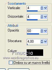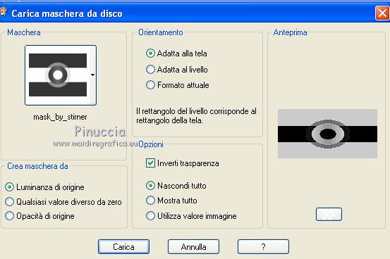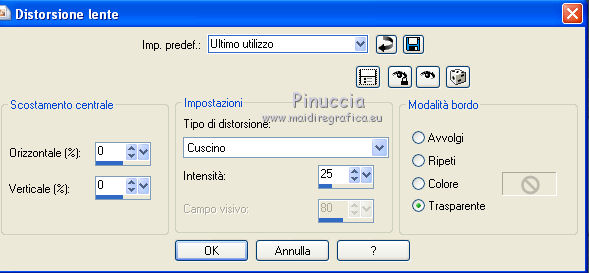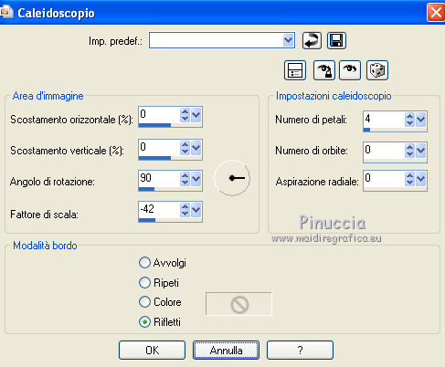 qui puoi trovare qualche risposta ai tuoi dubbi. Se l'argomento che ti interessa non è presente, ti prego di segnalarmelo. Questo tutorial è stato creato con PSP X2 e tradotto con Corel X, ma può essere eseguito anche con le altre versioni di PSP. Dalla versione X4, il comando Immagine>Rifletti è stato sostituito con Immagine>Capovolgi in orizzontale, e il comando Immagine>Capovolgi con Immagine>Capovolgi in verticale. Nelle versioni X5 e X6, le funzioni sono state migliorate rendendo disponibile il menu Oggetti. Con la versione X7 sono tornati i comandi Immagine>Rifletti e Immagine>Capovolgi, ma con nuove funzioni. Vedi la scheda sull'argomento qui traduzione in francese qui le vostre versioni qui Occorrente: Materiale qui Il tube della donna è di Jet. Il tube accessorio di Camerontags. Filtri: in caso di dubbi, ricorda di consultare la mia sezione filtri qui Mura's Meister - Copies qui. L&K Zitah (nello zip) L&K Paris (nello zip) Flaming Pear - Flexify 2 qui Filters Unlimited 2.0 qui Andrew's Filter Collection 59 (nello zip). I filtri Andrew's per essere usati devono prima essere convertiti. Come fare vedi qui Si usano importandoli in Filters Unlimited (come fare vedi qui) ma possono funzionare anche da soli ![]() Metti la maschera nella cartella Maschere. 1. Apri l'immagine gradiente_topjeans. Questa immagine - che ha la dimensione corretta di 1000x500 pixels - sarà la base del tuo lavoro. Questo gradiente è stato realizzato con il colore di primo piano #4d6278, e il colore di sfondo #c1d5e9. ![]() Livelli>Duplica - 2 volte; avrai così tre livelli. 2. Attiva il livello Raster 1. Effetti>Plugins>Filters Unlimited - Andrew's Filters Collection 59 - In And Out of Filters, con i settaggi standard. ![]() non potrai vedere il risultato perchè il livello è coperto dalle copie; per visualizzare il risultato chiudi i livelli soprastanti. 3. Attiva il livello Copia di Raster 1. Livelli>Carica/Salva maschera>Carica maschera da disco. Cerca e carica la maschera mask_by_stirner. ![]() Livelli>Unisci>Unisci gruppo. Effetti>Effetti 3D>Sfalsa ombra, con il colore nero: ![]() Ripeti l'Effetto Sfalsa ombra, cambiando verticale e orizzontale con -4. 4. Effetti>Plugins>Mura's Meister - Copies. ![]() 5. Livelli>Duplica. Immagine>Capovolgi. Abbassa l'opacità di questo livello all'82%. Livelli>Unisci>Unisci giù. 6. Attiva il livello della seconda copia. Livelli>Carica/Salva maschera>Carica maschera da disco. Carica nuovamente la maschera mask_by_stirner, questa volta Inverti trasparenza selezionato. ![]() Livelli>Unisci>Unisci gruppo. Effetti>Effetti 3D>Sfalsa ombra, con il colore nero. ![]() Ripeti l'Effetto Sfalsa ombra, cambiando verticale e orizzontale con -4. 7. Effetti>Plugins>L&K - L&K Zitah: ![]() 8. Effetti>Plugins>L&K - L&K Paris. ![]() 9. Effetti>Effetti di distorsione>Distorsione lente. ![]() 10. Effetti>Plugins>Flaming Pear - Flexify 2. ![]() Regola>Messa a fuoco>Accentua messa a fuoco. 11. Apri spiralgaia_camerontags e vai a Modifica>Copia. Torna al tuo lavoro e vai a Modifica>Incolla come nuovo livello. Effetti>Effetti di riflesso>Caleidoscopio. ![]() Effetti>Effetti 3D>Sfalsa ombra: ![]() 12. Apri il tube della donna e vai a Modifica>Copia. Torna al tuo lavoro e vai a Modifica>Incolla come nuovo livello. Immagine>Rifletti. Immagine>Ridimensiona, all'85%, tutti i livelli non selezionato. Effetti>Effetti 3D>Sfalsa ombra, con un settaggio a tua scelta. Il mio. ![]() Sposta il tube un po' più a sinistra.Aggiungi, se vuoi, il tube di un uomo. Abbassa l'opacità di questo livello tra il 20 e il 30%. Porta questo livello sopra il terzo livello della maschera. ![]() 13. Immagine>Aggiungi bordatura, 3 pixels, simmetriche, con il colore chiaro. Livelli>Innalza livello di sfondo. 14. Livelli>Nuovo livello raster. Livelli>Disponi>Porta sotto. Immagine>Dimensione tela. ![]() Riempi il livello con un colore della tua immagine.15. Attiva il livello superiore. Effetti>Effetti 3D>Sfalsa ombra, con il colore nero. ![]() Ripeti l'Effetto Sfalsa ombra cambiando verticale e orizzontale con -4. 16. Livelli>Unisci>Unisci tutto. 17. Firma il tuo lavoro e salva in formato jpg. I tubes di questo esempio sono di Bichito e Min@ ![]() Le vostre versioni qui ![]() Puoi scrivermi se hai problemi o dubbi, o trovi un link che non funziona, o soltanto per un saluto. 17 Gennaio 2011 |