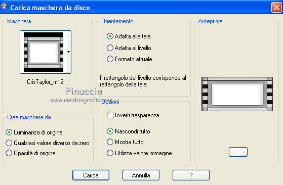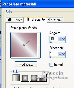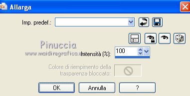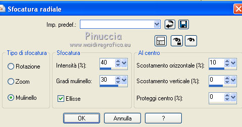 qui puoi trovare qualche risposta ai tuoi dubbi. Se l'argomento che ti interessa non è presente, ti prego di segnalarmelo. Questo tutorial è stato creato con PSP X2 e tradotto con PSPX, ma può essere eseguito anche con le altre versioni di PSP. Dalla versione X4, il comando Immagine>Rifletti è stato sostituito con Immagine>Capovolgi in orizzontale, e il comando Immagine>Capovolgi con Immagine>Capovolgi in verticale. Nelle versioni X5 e X6, le funzioni sono state migliorate rendendo disponibile il menu Oggetti. Con la nuova versione X7, sono tornati Rifletti>Capovolgi, ma con nuove varianti. Vedi la scheda sull'argomento qui traduzione in francese/traduction en français ici Occorrente: Un tube a scelta. Il resto del materiale qui Il tube che ho usato è di Christine. Filtri: in caso di dubbi, ricorda di consultare la mia sezione filtri qui Flaming Pear - Flexify 2 qui ![]() non esitare a cambiare modalità di miscelatura e opacità secondo i colori utilizzati. Nelle ultime versioni di PSP non c'è il gradiente di primo piano/sfondo (Corel_06_029) Puoi usare i gradienti delle versioni precedenti. Trovi qui i gradienti Corel X. Metti la maschera nella cartella Maschere. 1. Scegli due colori dal tuo tube, e imposta il colore scuro come colore di primo piano, e il colore chiaro come colore di sfondo. Passa il colore di primo piano a Gradiente. ![]() Apri una nuova immagine trasparente 1024 x 500 pixels, e riempila con il gradiente.2. Selezione>Seleziona tutto. Apri il tuo tube e vai a Modifica>Copia. Torna al tuo lavoro e vai a Modifica>Incolla nella selezione. Selezione>Deseleziona. 3. Effetti>Effetti di immagine>Motivo unico, con i settaggi standard. ![]() 4. Regola>Sfocatura>Sfocatura radiale: ![]() 5. Effetti>Effetti di distorsione>Allarga. ![]() 6. Effetti>Plugins>Flaming Pear - Flexify 2. ![]() 7. Livelli>Carica/Salva maschera>Carica maschera da disco. Cerca e carica la maschera CrisTaylor-m12. ![]() Livelli>Unisci>Unisci gruppo. 9. Effetti>Effetti 3D>Sfalsa ombra, con settaggi a tua scelta. 8. Immagine>Dimensione tela. ![]() Livelli>Nuovo livello raster. Livelli>Disponi>Porta sotto. Riempi il livello con il colore più chiaro scelto dal tube.9. Attiva il livello superiore. Apri il tuo tube e vai a Modifica>Copia. Torna al tuo lavoro e vai a Modifica>Incolla come nuovo livello. 10. Livelli>Unisci>Unisci tutto. 11. Firma il tuo lavoro e salva in formato jpg. ![]() ![]() Se hai problemi o dubbi, o trovi un link non funzionante, o anche soltanto per dirmi se questo tutorial ti è piaciuto, scrivimi. 21 Febbraio 2011 |