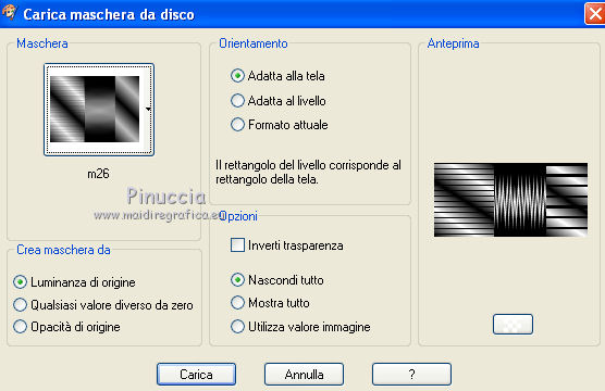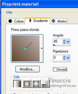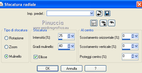 qui puoi trovare qualche risposta ai tuoi dubbi. Se l'argomento che ti interessa non è presente, ti prego di segnalarmelo. Questo tutorial è stato creato con PSP X2, e tradotto con CorelX, ma può essere eseguito anche con le altre versioni di PSP. Dalla versione X4, il comando Immagine>Rifletti è stato sostituito con Immagine>Capovolgi in orizzontale, e il comando Immagine>Capovolgi con Immagine>Capovolgi in verticale. Nelle versioni X5 e X6, le funzioni sono state migliorate rendendo disponibile il menu Oggetti. Con la versione X7 sono tornati i comandi Immagine>Rifletti e Immagine>Capovolgi, ma con nuove funzioni. Vedi la scheda sull'argomento qui traduzione in francese/traduction en français qui/ici le vostre versioni/vos versions qui/ici Occorrente: Materiale qui Il tube usato è di AH. Filtri: in caso di dubbi, ricorda di consultare la mia sezione filtri qui PSP Forum qui Unplugged Tools qui Filters Unlimited 2.0 qui Richard Rosenman qui Mura's Meister - Pole Transform qui I filtri Unplugged Tools si possono usare da soli o importati in Filters Unlimited (come fare vedi qui) Se un filtro fornito appare con questa icona ![]() Metti la maschera m26 nella cartella Maschere. 1. Scegli due colori dal tuo tube principale. Per il mio esempio: colore di primo piano #60472e; colore di sfondo #c4b6b6. ![]() Passa il colore di primo piano a Gradiente lineare. ![]() 2. Apri una nuova immagine trasparente 1024 x 500 pixels, e riempila con il gradiente.3. Selezione>Seleziona tutto. Apri il tuo tube e vai a Modifica>Copia. non chiuderlo, perchè ti servirà ancora Torna al tuo lavoro e vai a Modifica>Incolla nella selezione. Selezione>Deseleziona. 4. Effetti>Effetti di immagine>Motivo unico, con i settaggi standard. ![]() 5. Regola>Sfocatura>Sfocatura radiale: ![]() Di nuovo Effetti>Effetti di immagine>Motivo unico, con i settaggi standard. 7. Effetti>Plugins>PSP Forum - Sanny's Blokjes: ![]() 8. Effetti>Plugins>Filters Unlimited 2.0 - Tile & Mirror - Quadrant Mirror. ![]() 9. Effetti>Plugins>Mura's Meister - Pole Transform. ![]() 10. Effetti>Plugins>Unplugged Tools - Renaissance. ![]() 11. Livelli>nuovo livello raster. Riempi il livello con il gradiente.Livelli>Carica/Salva maschera>Carica maschera da disco. Cerca e carica la maschera m26. ![]() Livelli>Unisci>Unisci gruppo. Cambia la modalità di miscelatura di questo livello in Sovrapponi. Effetti>Effetti 3D>Sfalsa ombra, con il colore nero. ![]() 12. Attiva nuovamente il tuo tube e vai a Modifica>Copia. Torna al tuo lavoro e vai a Modifica>Incolla come nuovo livello. Effetti>Effetti 3D>Sfalsa ombra, con settaggi a scelta. 13. Livelli>Unisci>Unisci tutto (appiattisci). 14. Effetti>Plugins>Richard Rosenman - Solid Border, con il colore di primo piano. ![]() Livelli>Innalza livello di sfondo. 15. Livelli>Nuovo livello raster. Livelli>Disponi>Porta sotto. 16. Immagine>Dimensione tela. ![]() Imposta il colore di primo piano con un colore scelto dal tuo tube. Per il mio esempio #f4d3bc. Riempi il livello con questo colore.17. Attiva il livello Raster 1. Effetti>Effetti 3D>Sfalsa ombra, con il colore nero. ![]() Livelli>Unisci>Unisci tutto. 18. Firma il tuo lavoro e salva in formato jpg. Le tube de cette version est de Anna.br ![]() ![]() Puoi scrivermi se hai problemi o dubbi, o trovi un link che non funziona, o soltanto per un saluto. 17 Gennaio 2011 |