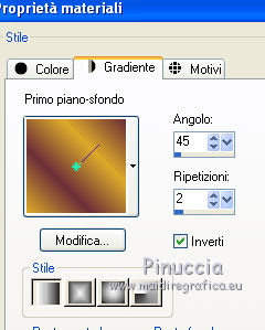 qui puoi trovare qualche risposta ai tuoi dubbi. Se l'argomento che ti interessa non è presente, ti prego di segnalarmelo. Questo tutorial è stato creato con PSP X2 e tradotto con PSP X, ma può essere eseguito anche con le altre versioni di PSP. Dalla versione X4, il comando Immagine>Rifletti è stato sostituito con Immagine>Capovolgi in orizzontale, e il comando Immagine>Capovolgi con Immagine>Capovolgi in verticale. Nelle versioni X5 e X6, le funzioni sono state migliorate rendendo disponibile il menu Oggetti. Con la versione X7 sono tornati i comandi Immagine>Rifletti e Immagine>Capovolgi, ma con nuove funzioni. Vedi la scheda sull'argomento qui traduzione in francese qui Le vostre versioni qui Occorrente: Tubes accessori a scelta. Il resto del materiale qui Il tube della donna è di Suzi Sgai. Filtri: in caso di dubbi, ricorda di consultare la mia sezione filtri qui Cybia Screenworks qui FM Tile Tools - Blend Emboss qui ![]() 1. Scegli due colori dal tube principale. Imposta il colore di primo piano con il colore scuro, e il colore di sfondo con il colore chiaro. I miei colori ![]() Passa il colore di primo piano a Gradiente lineare: ![]() 2. Apri una nuova immagine trasparente 850 x 500 pixels, e riempila con il gradiente.3. Livelli>Nuovo livello raster. Selezione>Seleziona tutto. Apri l'immagine di sfondo ws_Aqua_graphite e vai a Modifica>Copia. Torna al tuo lavoro e vai a Modifica>Incolla nella selezione. Selezione>Deseleziona. Regola>Tonalità e Saturazione>Viraggio, con i valori corrispondenti a uno dei tuoi colori. I miei settaggi. ![]() Effetti>Plugins>FM Tile Tools - Blend Emboss, con i settaggi standard. ![]() Cambia la modalità di miscelatura di questo livello in Luminanza (esistente), e abbassa l'opacità al 75%. Regola>Messa a fuoco>Metti a fuoco. 4. Livelli>Nuovo livello raster. Selezione>Seleziona tutto. Apri Jill_template 1 e vai a Modifica>Copia. Torna al tuo lavoro e vai a Modifica>Incolla nella selezione. Selezione>Deseleziona. Effetti>Effetti 3D>Sfalsa ombra. ![]() 6. Aggiungi il tuo tube e i tube accessori che hai deciso di usare. 7. Immagine>Aggiungi bordatura, 2 pixels, simmetriche, con un colore qualsiasi. Seleziona questo bordo con la bacchetta magica ![]() e riempilo con un gradiente o un motivo dorato.Selezione>Deseleziona. 8. Immagine>Aggiungi bordatura, 30 pixels, simmetriche, con il tuo colore scuro. Seleziona questo bordo con la bacchetta magica ![]() 9. Effetti>Plugins>Cybia - Screenworks - seleziona Net Pattern e ok. ![]() 10. Immagine>Aggiungi bordatura, 2 pixels, simmetriche, con un colore qualsiasi. Seleziona questo bordo con la bacchetta magica ![]() e riempilo con un gradiente o un motivo dorato.Selezione>Deseleziona. 11. Firma il tuo lavoro e salva in formato jpg. I tubes utilizzati per la traduzione in francese sono di Min@ e Tocha. ![]() ![]() Se hai problemi o dubbi, o trovi un link non funzionante, o anche soltanto per un saluto, scrivimi. 21 Gennaio 2011 |