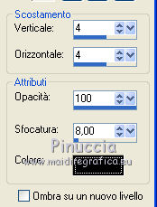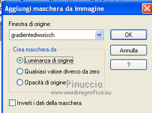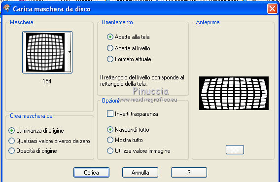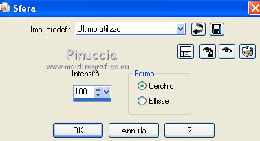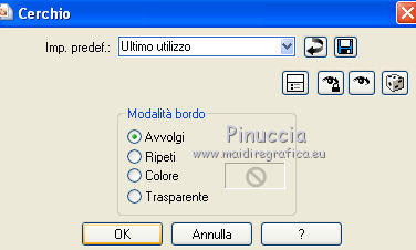 qui puoi trovare qualche risposta ai tuoi dubbi. Se l'argomento che ti interessa non è presente, ti prego di segnalarmelo. Questo tutorial è stato creato con PSP X2 e tradotto con PSPX, ma può essere eseguito anche con le altre versioni di PSP. Dalla versione X4, il comando Immagine>Rifletti è stato sostituito con Immagine>Capovolgi in orizzontale, e il comando Immagine>Capovolgi con Immagine>Capovolgi in verticale. Nelle versioni X5 e X6, le funzioni sono state migliorate rendendo disponibile il menu Oggetti. Con la nuova versione X7, sono tornati Rifletti>Capovolgi, ma con nuove varianti. Vedi la scheda sull'argomento qui traduzione in francese/traduction en français qui/ici Occorrente: Un tube a scelta. Il resto del materiale qui Per il mio esempio ho usato un poser di Angie. Filtri: in caso di dubbi, ricorda di consultare la mia sezione filtri qui Filters Unlimited qui Toadies qui I filtri Toadies si possono usare da soli o importati in Filters Unlimited (come fare vedi qui) Se un filtro fornito appare con questa icona ![]() non esitare a cambiare modalità di miscelatura e opacità secondo i colori utilizzati. Metti la maschera nella cartella Maschere. 1. Scegli un colore dal tuo tube, e impostalo come colore di primo piano. 2. Apri una nuova immagine trasparente 1024 x 500 pixels, e riempila con il tuo colore.3. Selezione>Seleziona tutto. Apri il tuo tube e vai a Modifica>Copia. Torna al tuo lavoro e vai a Modifica>Incolla nella selezione. Selezione>Deseleziona. 4. Effetti>Effetti di immagine>Motivo unico, con i settaggi standard. ![]() 5. Regola>Sfocatura>Sfocatura gaussiana - raggio 20. ![]() 6. Effetti>Plugins>Toadies - Bitches Crystal. ![]() 7. Effetti>Effetti geometrici>Sfera. ![]() 8. Livelli>Duplica. 9. Effetti>Plugins>Filters Unlimited - Toadies - Rasterline. ![]() Non preoccuparti perchè ti sembrerà che non sia successo nulla. Continua. 10. Effetti>Effetti 3D>Sfalsa ombra, con il colore nero. ![]() E adesso potrai vedere il risultato del filtro. ![]() 11. Livelli>Unisci>Unisci visibile. 12. Livelli>Carica/Salva maschera>Carica maschera da disco. Cerca e carica la maschera 154. ![]() Livelli>Unisci>Unisci gruppo. Effetti>Effetti 3D>Sfalsa ombra. ![]() 13. Livelli>Nuovo livello raster. Riempi con il tuo colore.Livelli>Disponi>Porta sotto. 14. Effetti>Plugins>filters Unlimited 2.0 - Toadies - Ommadawn. ![]() 15. Livelli>unisci>Unisci visibile. 16. Effetti>Effetti geometrici>Cerchio. ![]() 17. Applica una maschera per sfumare il bordo del top. Livelli>Nuovo livello raster>Da immagine. Per il mio esempio ho scelto la maschera gradienteworisch. se non hai una maschera di questo tipo prendi questa qui ![]() Livelli>Unisci>Unisci gruppo. Applica la maschera una seconda volta. Livelli>Unisci>Unisci gruppo. 18. Livelli>Nuovo livello raster. Immagine>Dimensione tela. ![]() Riempi con il tuo colore.Livelli>Disponi>Porta sotto. 19. Attiva il livello superiore. Apri il tuo tube e vai a Modifica>Copia. Torna al tuo lavoro e vai a Modifica>Incolla come nuovo livello. Effetti>Effetti 3D>Sfalsa ombra, con settaggi a tua scelta. 20. Livelli>Unisci>Unisci tutto. 21. Firma il tuo lavoro e salva in formato jpg. ![]() ![]() Se hai problemi o dubbi, o trovi un link non funzionante, o anche soltanto per dirmi se questo tutorial ti è piaciuto, scrivimi. 21 Febbraio 2011 |