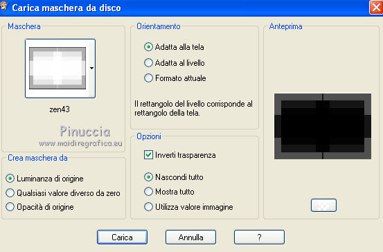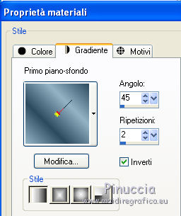 qui puoi trovare qualche risposta ai tuoi dubbi. Se l'argomento che ti interessa non è presente, ti prego di segnalarmelo. Questo tutorial è stato creato con PSP X2 e tradotto con CorelX, ma può essere eseguito anche con le altre versioni di PSP. Dalla versione X4, il comando Immagine>Rifletti è stato sostituito con Immagine>Capovolgi in orizzontale, e il comando Immagine>Capovolgi con Immagine>Capovolgi in verticale. Nelle versioni X5 e X6, le funzioni sono state migliorate rendendo disponibile il menu Oggetti. Con la versione X7 sono tornati i comandi Immagine>Rifletti e Immagine>Capovolgi, ma con nuove funzioni. Vedi la scheda sull'argomento qui traduzione in francese qui Occorrente: Materiale qui I tubes sono di Jet e Monique. Filtri: in caso di dubbi, ricorda di consultare la mia sezione filtri qui Cybia - Screenworks qui FM Tile Tools - Blend Emboss qui ![]() Metti la maschera zen43 nella cartella Maschere. 1. Scegli due colori dal tuo tube principale. Imposta il colore di primo piano con il colore scuro, e il colore di sfondo con il colore chiaro. Passa il colore di primo piano a Gradiente lineare - inverti selezionato. ![]() 2. Apri una nuova immagine trasparente 800 x 550 pixels, e riempila con il gradiente.3. Apri raphaellalines.psp e vai a Modifica>Copia. Torna al tuo lavoro e vai a Modifica>Incolla come nuovo livello. Cambia la modalità di miscelatura di questo livello in Luminanza (esistente). Effetti>Plugins>FM Tile Tools - Blend Emboss. ![]() 4. Livelli>Nuovo livello raster. Riempi con il colore chiaro di sfondo.Livelli>Carica/Salva maschera>Carica maschera da disco. Cerca e carica la maschera zen43. ![]() Livelli>Unisci>Unisci gruppo. Effetti>Effetti 3D>Sfalsa ombra. ![]() Effetti>Plugins>FM TIle Tools - Blend Emboss, con i settaggi standard. ![]() 5. Apri il tube tubed_by_Monique42_1469 e vai a Modifica>Copia. Torna al tuo lavoro e vai a Modifica>Incolla come nuovo livello. Cambia la modalità di miscelatura di questo livello in Luminanza (esistente), e abbassa l'opacità al 60%. Effetti>Plugins>FM Tile Tools - Blend Emboss. ![]() Sposta il tube un po' più a destra, come nel mio esempio.6. Apri il tuo tube principale - per l'esempio Jet-woman5 - e vai a Modifica>Copia. Torna al tuo lavoro e vai a Modifica>Incolla come nuovo livello. Immagine>Ridimensiona, al 78%, tutti i livelli non selezionato. Effetti>Effetti 3D>Sfalsa ombra, con settaggi a tua scelta. Questi i miei settaggi: ![]() 7. Completa il tuo lavoro, aggiungendo gli elementi decorativi che preferisci. 8. Immagine>Aggiungi bordatura, 30 pixels, simmetriche, con un colore qualsiasi. Seleziona questo bordo con la bacchetta magica ![]() e riempilo con il gradiente.Effetti>Plugins>Cybia - Screenworks - Fine Rule. ![]() Selezione>Deseleziona. 9. Firma il tuo lavoro e salva in formato jpg. I tubes di questo esempio sono di Anna.br e MTM Brigitte ![]() ![]() Se hai problemi o dubbi, o trovi un link non funzionante, o anche soltanto per un saluto, scrivimi 9 Febbraio 2011 |