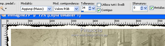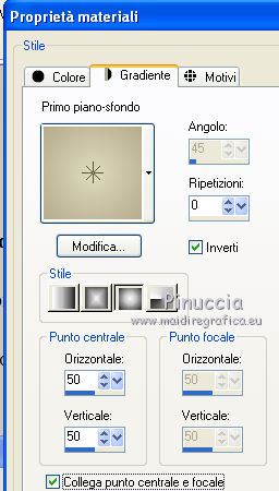 qui puoi trovare qualche risposta ai tuoi dubbi. Se l'argomento che ti interessa non è presente, ti prego di segnalarmelo. Questo tutorial è stato creato con PSP X2e tradotto con Corel X, ma può essere eseguito anche con le altre versioni di PSP. Dalla versione X4, il comando Immagine>Rifletti è stato sostituito con Immagine>Capovolgi in orizzontale, e il comando Immagine>Capovolgi con Immagine>Capovolgi in verticale. Nelle versioni X5 e X6, le funzioni sono state migliorate rendendo disponibile il menu Oggetti. Con la versione X7 sono tornati i comandi Immagine>Rifletti e Immagine>Capovolgi, ma con nuove funzioni. Vedi la scheda sull'argomento qui traduzione in francese/traduction en français qui/ici Le vostre versioni/vos versions qui/ici Occorrente: Materiale qui I tubes sono di DeniseWorisch, Aclis e MMDesignz. Filtri: in caso di dubbi, ricorda di consultare la mia sezione filtri qui Filters Unlimited 2.0 qui Photo Aging Kit (da importare in Unlimited) qui ![]() 1. Scegli due colori dal tuo tube principale. Per il mio esempio: colore di primo piano #b5aa8c; colore di sfondo #dedbbd. ![]() Passa il colore di primo piano a Gradiente di primo piano/sfondo, stile Sprazzo di luce. ![]() 2. Apri una nuova immagine trasparente 1000 x 500 pixels, e riempila con il gradiente.3. Livelli>Duplica. Selezione>Seleziona tutto. 4. Apri il tube Aclis_paisaje_01_29_05_2009 e vai a Modifica>Copia. Torna al tuo lavoro e vai a Modifica>Incolla nella selezione. Selezione>Deseleziona. Cambia la modalità di miscelatura di questo livello in Luminanza (esistente). 5. Effetti>Plugins>I.C.NET Software Filters Unlimited 2.0 - Photo Aging Kit - Hairs & Dust. ![]() 6. Effetti>Plugins>Filters Unlimited - Photo Aging Kit - Photo Frame 05. ![]() 7. Attiva lo strumento Bacchetta magica ,imposta la tolleranza a tuo piacimento in modo da facilitare la selezione, e clicca sul bordo nero per selezionarlo. ![]() Premi sulla tastiera il tasto CANC ![]() Attiva il livello inferiore e premi nuovamente il tasto CANC. Selezione>Deseleziona. Attiva il livello superiore. 7. Apri il tube 4235dwtubes e vai a Modifica>Copia. Torna al tuo lavoro e vai a Modifica>Incolla come nuovo livello. Immagine>Ridimensiona, al 65%, tutti i livelli non selezionato. Cambia la modalità di miscelatura di questo livello in Luminanza (Esistente). Sposta il tube a sinistra.8. Apri il tube MMDesignzCr_026128 (o il tube che preferisci) e vai a Modifica>Copia. Torna al tuo lavoro e vai a Modifica>Incolla come nuovo livello. Immagine>Rifletti. Immagine>Ridimensiona, al 65%, tutti i livelli non selezionato. Sposta il tube a destra.Livelli>Unisci>Unisci visibile. 9. Livelli>Nuovo livello raster. Livelli>Disponi>Porta sotto. Immagine>Dimensione tela. ![]() Riempi con un colore scelto dall'immagine.10. Attiva il livello superiore. Effetti>Effetti 3D>Sfalsa ombra, con il colore nero. ![]() Ripeti l'Effetto Sfalsa ombra, cambiando verticale e orizzontale con -4. 11. Livelli>Unisci>Unisci tutto. Firma il tuo lavoro e salva in formato jpg. I tubes di questo esempio sono di Guismo e Colorel ![]() Le vostre versioni/vos versions qui/ici ![]() Puoi scrivermi se hai problemi o dubbi, o trovi un link che non funziona, o soltanto per salutarmi. 17 Gennaio 2011 |