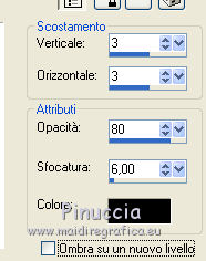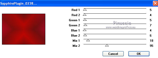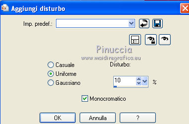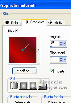 qui puoi trovare qualche risposta ai tuoi dubbi. Se l'argomento che ti interessa non è presente, ti prego di segnalarmelo. Questo tutorial è stato creato con PSP X2, ma può essere eseguito anche con le altre versioni di PSP. Per tradurlo, ho usato PSP X. Questo tutorial è una creazione di ©Angel e non può essere copiato su altri siti nè essere offerto per il download. Lo stesso vale per la mia traduzione. Il materiale viene da vari gruppi di condivisione. Il copyright appartiene ai rispettivi autori. Grazie ai creatori dei tubes che mettono a disposizione il loro lavoro in vari gruppi di condivisione. Rispetta il lavoro degli autori, non cambiare il nome del file e non cancellare il watermark. Occorrente: Materiale qui Filtri: Sapphire Filters 03 - Sapphire Plugin_0238 (nel materiale). ![]() Metti il gradiente nella cartella Gradienti, e apri il resto del materiale in PSP. 1. Scegli due colori dal tube principale e imposta il colore di primo piano con il colore più scuro, e il colore di sfondo con il colore più chiaro. Passa il colore di primo piano a Gradiente, stile lineare con i seguenti settaggi. Oppure usa - come nel mio esempio - il gradient bhw_19, incluso nel materiale). ![]() 2. Apri una nuova immagine trasparente 700 x 500 pixels, e riempila con il gradiente.3. Effetti>Plugins>Sapphire Filters 03 - Sapphire Plugin_0238: ![]() 4. Livelli>Nuovo livello raster. Riempi con lo stesso gradiente.Regola>Aggiungi/Rimuovi disturbo>Aggiungi disturbo. ![]() 5. Attiva il livello Raster 2. Immagine>Ridimensiona, all'88%,tutti i livelli non selezionato. 6. Selezione>Seleziona tutto. Selezione>Mobile. Selezione>Immobilizza. Selezione>Modifica>Seleziona bordature selezione. ![]() 7. Livelli>Nuovo livello raster. Imposta il colore di primo piano con un gradiente dorato a tua scelta. Riempi il livello con questo gradiente.Selezione>Deseleziona. Livelli>Unisci>Unisci giù. Effetti>Effetti 3D>Sfalsa ombra. ![]() Ripeti l'Effetto Sfalsa ombra, cambiando verticale e orizzontale con -3. 8. Apri il tuo tube principale - il mio KaraT5626 - e vai a Modifica>Copia. Torna al tuo lavoro e vai a Modifica>Incolla come nuovo livello. Immagine>Ridimensiona, al 90%, tutti i livelli non selezionato. Regola>Messa a fuoco>Accentua messa a fuoco. 9. Apri KaraT4616 e vai a Modifica>Copia. Torna al tuo lavoro e vai a Modifica>Incolla come nuovo livello. Immagine>Ridimensiona, al 50%, tutti i livelli non selezionato. Spostalo in basso a destra.Effetti>Effetti 3D>sfalsa ombra, con i settaggi precedenti. Aggiungi, se vuoi, degli ornamenti - pennelli o accents - a tuo piacimento. 10. Immagine>Aggiungi bordatura, 2 pixels, simmetriche, con un colore qualsiasi. Seleziona questo bordo con la bacchetta magica ![]() e riempilo con il gradiente dorato.Firma il tuo lavoro e salva in formato jpg. ![]() Se hai problemi o dubbi, o trovi un link non funzionante, o anche soltanto per un saluto, scrivimi. 28 Novembre 2010 |
