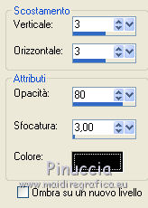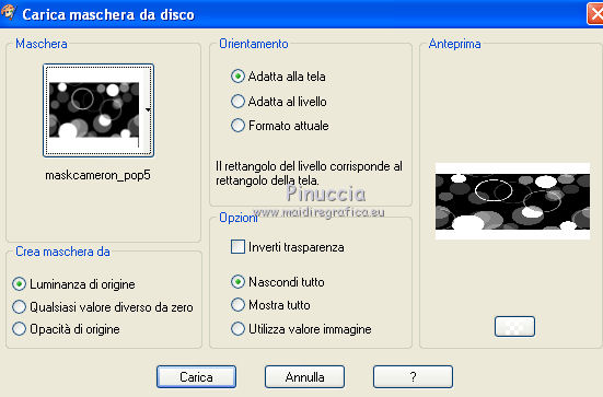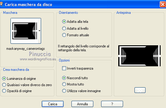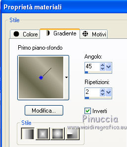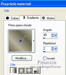 qui puoi trovare qualche risposta ai tuoi dubbi. Se l'argomento che ti interessa non è presente, ti prego di segnalarmelo. Questo tutorial è stato realizzato con CorelX2 e tradotto con Corel X, ma può essere realizzato anche con le altre versioni di PSP. Dalla versione X4, il comando Immagine>Rifletti è stato sostituito con Immagine>Capovolgi in orizzontale, e il comando Immagine>Capovolgi con Immagine>Capovolgi in verticale. Nelle versioni X5 e X6, le funzioni sono state migliorate rendendo disponibile il menu Oggetti. Con la nuova versione X7, sono tornati Rifletti>Capovolgi, ma con nuove varianti. Vedi la scheda sull'argomento qui traduzione in francese/traduction en français qui/ici le vostre versioni/vos versions qui/ici Occorrente: Tube e pennelli a scelta. Il resto del materiale qui Il tube che ho usato per il mio esempio è di Bichito. Le maschere sono di Cameron. Filtri: in caso di dubbi, ricorda di consultare la mia sezione filtri qui FM Tile Tools - Blend Emboss qui Filters Unlimited 2.0 qui Filter Factory Gallery E (nello zip). I filtri Factory Gallery si possono usare da soli o importati in Filters Unlimited (come fare vedi qui) Se un filtro fornito appare con questa icona ![]() Metti le maschere nella cartella Maschere. 1. Scegli due colori dal tuo tube principale. Imposta il colore di primo piano con il colore scuro, e il colore di sfondo con il colore chiaro. ![]() Passa il colore di primo piano a Gradiente di primo piano/sfondo, stile lineare. ![]() 2. Apri una nuova immagine trasparente 1000 x 500 pixels, e riempila con il gradiente.3. Selezione>Seleziona tutto. Apri il tuo tube e vai a Modifica>Copia. Torna al tuo lavoro e vai a Modifica>Incolla nella selezione. Selezione>Deseleziona. 4- Effetti>Effetti di immagine>Motivo unico, con i settaggi standard. ![]() 5. Regola>Sfocatura>Sfocatura gaussiana - raggio 30. ![]() 6. Effetti>Plugins>Filters Unlimited 2.0 - Filter Factory Gallery E - Splash 2. ![]() 7. Livelli>Nuovo livello raster. Riempi il livello con il gradiente.Livelli>Carica/Salva maschera>Carica maschera da disco. Cerca e carica la maschera maskanyway_camerontags. ![]() Livelli>Unisci>Unisci gruppo. Regola>Messa a fuoco>Metti a fuoco. Effetti>Effetti 3D>Sfalsa ombra. ![]() 8. Livelli>Nuovo livello raster. Cambia i settaggi del gradiente, togliendo la spunta a Inverti. ![]() Riempi il livello con il gradiente.Livelli>Carica/Salva maschera>Carica maschera da disco. Cerca e carica la maschera Maskcameron_pop5. ![]() Livelli>Unisci>Unisci gruppo. Regola>Messa a fuoco>Metti a fuoco. Effetti>Plugins>FM Tile Tools - Blend Emboss, con i settaggi standard. ![]() Effetti>Effetti 3D>sfalsa ombra: ![]() 9. Aggiungi il tube e i pennelli che hai scelto di usare. 10. Immagine>Aggiungi bordatura, 1 pixel, simmetriche, con il tuo colore chiaro. 11. Livelli>Innalza livello di sfondo. 12. Immagine>Dimensione tela. ![]() 13. Livelli>Nuovo livello raster. Livelli>Disponi>Porta sotto. Riempi con un colore scelto dalla tua immagine.14. Attiva il livello superiore. Effetti>Effetti 3D>Sfalsa ombra: ![]() 15. Livelli>Unisci>Unisci tutto. 16. Firma il tuo lavoro e salva in formato jpg. Il tube di questo esempio è mio, ricavato da un'immagine trovata in rete. ![]() ![]() Puoi scrivermi se hai problemi o dubbi, o trovi un link che non funziona, o soltanto per un saluto. 17 Gennaio 2011 |