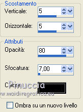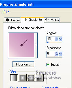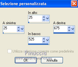 qui puoi trovare qualche risposta ai tuoi dubbi. Se l'argomento che ti interessa non è presente, ti prego di segnalarmelo. Questo tutorial è stato creato con PSP X2 e tradotto con CorelX, ma può essere eseguito anche con le altre versioni di PSP. Dalla versione X4, il comando Immagine>Rifletti è stato sostituito con Immagine>Capovolgi in orizzontale, e il comando Immagine>Capovolgi con Immagine>Capovolgi in verticale. Nelle versioni X5 e X6, le funzioni sono state migliorate rendendo disponibile il menu Oggetti. Con la versione X7 sono tornati i comandi Immagine>Rifletti e Immagine>Capovolgi, ma con nuove funzioni. Vedi la scheda sull'argomento qui traduzione in francese qui Occorrente: Tubes e accessori a scelta. I tubes che ho usato sono di @nn e Guismo. Filtri: in caso di dubbi, ricorda di consultare la mia sezione filtri qui Filters Unlimited 2.0 qui Tramage - Tow the line qui ![]() 1. Scegli due colori dal tuo tube principale. Imposta il colore di primo piano con il colore scuro, e il colore di sfondo con il colore chiaro. Passa il colore di primo piano a Gradiente lineare - inverti selezionato. ![]() 2. Apri una nuova immagine trasparente 700 x 550 pixels, e riempila con il gradiente.3. Effetti>Plugins>Tramages - Tow the line. ![]() 4. Livelli>Nuovo livello raster. Attiva lo strumento Selezione ,clicca sull'icona Selezione personalizzata ![]() e imposta i seguenti settaggi: ![]() Riempi con il gradiente.Selezione>Deseleziona. 5. Effetti>Plugins>Filters Unlimited 2.0 - Render - Cloud (fore/background color). ![]() 6. Effetti>Effetti 3D>Sfalsa ombra, con il colore nero. ![]() Ripeti l'Effetto Sfalsa ombra, cambiando verticale e orizzontale con -5. 7. Aggiungi i tuoi tube e pennelli che hai scelto di usare. 8. Aggiungi il tuo nome e/o il tuo watermark. 9. Livelli>Unisci>Unisci tutto e salva in formato jpg. I tubes di questo esempio sono di MMDesignz, Sonia e Beatriz ![]() ![]() Se hai problemi o dubbi, o trovi un link non funzionante, o anche soltanto per un saluto, scrivimi 20 Febbraio 2011 |