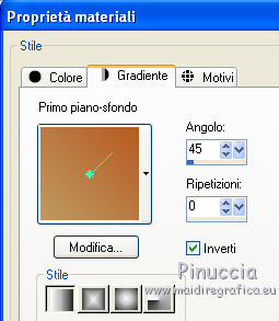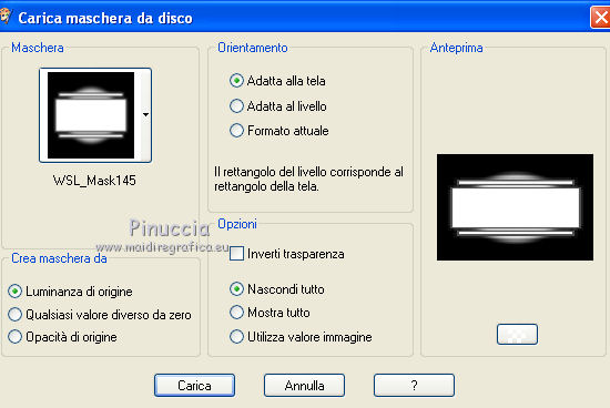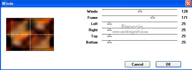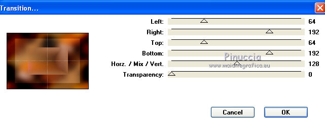 qui puoi trovare qualche risposta ai tuoi dubbi. Se l'argomento che ti interessa non è presente, ti prego di segnalarmelo. Questo tutorial è stato creato con PSP X2 e tradotto con CorelX, ma può essere eseguito anche con le altre versioni di PSP. Dalla versione X4, il comando Immagine>Rifletti è stato sostituito con Immagine>Capovolgi in orizzontale, e il comando Immagine>Capovolgi con Immagine>Capovolgi in verticale. Nelle versioni X5 e X6, le funzioni sono state migliorate rendendo disponibile il menu Oggetti. Con la versione X7 sono tornati i comandi Immagine>Rifletti e Immagine>Capovolgi, ma con nuove funzioni. Vedi la scheda sull'argomento qui Traduzione in francese qui Le vostre versioni qui Occorrente: Tubes a scelta. Il resto del materiale qui I tubes usati sono di Jet e Denise Worisch. Filtri: in caso di dubbi, ricorda di consultare la mia sezione filtri qui Filters Unlimited 2.0 qui VM Experimental qui Mock qui Unplugged Tools qui I filtri VM Experimental, Mock e Unplugged Tools si possono usare da soli o importati in Filters Unlimited (come fare vedi qui) Se un filtro fornito appare con questa icona ![]() Metti la maschera WSL_Mask145 nella cartella Maschere. 1. Scegli due colori dal tuo tube principale. Imposta il colore di primo piano con il colore scuro, e il colore di sfondo con il colore chiaro. Passa il colore di primo piano a Gradiente e, per iniziare, imposta un gradiente dorato. 2. Apri una nuova immagine trasparente 800 x 550 pixels, e riempila con il gradiente dorato.3. Livelli>Nuovo livello raster. Passa il colore di primo piano a Gradiente di primo piano/sfondo, stile Lineare, inverti selezionato. ![]() Riempi il livello con questo gradiente.Selezione>Seleziona tutto. Apri il tuo tube principale e vai a Modifica>Copia. Torna al tuo lavoro e vai a Modifica>Incolla nella selezione. Selezione>Deseleziona. 4. Effetti>Effetti di immagine>Motivo unico, con i settaggi standard. ![]() 5. Regola>Sfocatura>Sfocatura gaussiana - raggio 25. ![]() 6. Livelli>Duplica. Attiva il livello sottostante Raster 2. 7. Effetti>Plugins>Mock - Windo. ![]() 8. Effetti>Plugins>Unplugged Tools - Transition. ![]() Regola>Messa a fuoco>Metti a fuoco. 10. Attiva il livello superiore "copia di Raster 2". Livelli>Carica/Salva maschera>Carica maschera da disco. Cerca e carica la maschera WSL_Mask145. ![]() Livelli>Unisci>Unisci gruppo. Effetti>Effetti 3D>Sfalsa ombra. ![]() 11. Aggiungi i tubes che hai scelto di usare. 12. Immagine>Aggiungi bordatura, 2 pixels, simmetriche, con un colore qualsiasi. Seleziona questo bordo con la bacchetta magica ![]() e riempilo con il gradiente dorato.Selezione>Deseleziona. 13. Immagine>Aggiungi bordatura, 20 pixels, simmetriche, con un colore qualsiasi. Seleziona questo bordo con la bacchetta magica ![]() e riempilo con il gradiente del punto 3.Effetti>Plugins>VM Experimental - Magnetic Detection: ![]() Selezione>Deseleziona. 14. Immagine>Aggiungi bordatura, 2 pixels, simmetriche, con un colore qualsiasi. Seleziona questo bordo con la bacchetta magica ![]() e riempilo con il gradiente dorato.15. Firma il tuo lavoro e salva in formato jpg. I tubes usati per la traduzione in francese sono di AlexSun, Min@ e K@rine. ![]() ![]() Se hai problemi o dubbi, o trovi un link non funzionante, o anche soltanto per un saluto, scrivimi. 7 Febbraio 2011 |