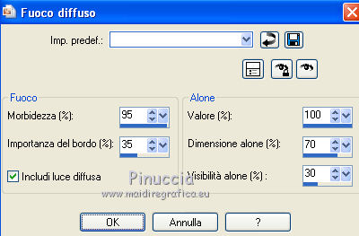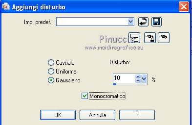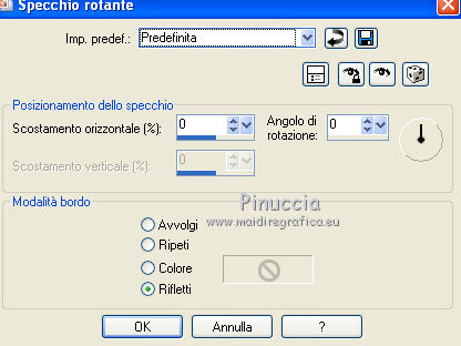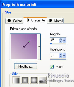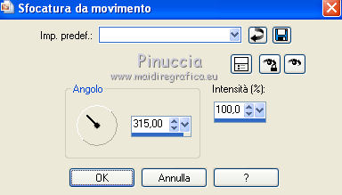 qui puoi trovare qualche risposta ai tuoi dubbi. Se l'argomento che ti interessa non è presente, ti prego di segnalarmelo. Questo tutorial è stato creato con PSP X2 e tradotto con PSP X, ma può essere eseguito anche con le altre versioni di PSP. Dalla versione X4, il comando Immagine>Rifletti è stato sostituito con Immagine>Capovolgi in orizzontale, e il comando Immagine>Capovolgi con Immagine>Capovolgi in verticale. Nelle versioni X5 e X6, le funzioni sono state migliorate rendendo disponibile il menu Oggetti. Con la versione X7 sono tornati i comandi Immagine>Rifletti e Immagine>Capovolgi, ma con nuove funzioni. Vedi la scheda sull'argomento qui Questo tutorial è una creazione di ©An.gel e non può essere copiato su altri siti nè essere offerto per il download. Lo stesso vale per la mia traduzione. Il materiale viene da vari gruppi di condivisione. Il copyright appartiene ai rispettivi autori. Grazie ai creatori dei tubes che mettono a disposizione il loro lavoro in vari gruppi di condivisione. Rispetta il lavoro degli autori, non cambiare il nome del file e non cancellare il watermark. traduzione in francese qui Occorrente: Tubes e accessori a scelta. Il mio tube è di Monique. Filtri: in caso di dubbi, ricorda di consultare la mia sezione filtri qui L&K Raisa qui ![]() 1. Scegli due colori dal tuo tube principale. Imposta il colore di primo piano con il colore scuro, e il colore di sfondo con il colore chiaro. I miei colori ![]() Passa il colore di primo piano a Gradiente lineare - inverti selezionato. ![]() 2. Apri una nuova immagine trasparente 650 x 450 pixels, e riempila con il gradiente.3. Selezione>Seleziona tutto. Apri il tuo tube e vai a Modifica>Copia. Torna al tuo lavoro e vai a Modifica>Incolla nella selezione. Selezione>Deseleziona. 4. Effetti>Effetti di immagine>Motivo unico, con i settaggi standard. ![]() 5. Regola>Sfocatura>Sfocatura da movimento - 2 volte con i seguenti settaggi. ![]() 6. Effetti>Plugins>L & K - Raisa. ![]() 7. Regola>Aggiungi/Rimuovi disturbo>Aggiungi disturbo. ![]() 8. Regola>Sfocatura>Sfocatura gaussiana - raggio 10. ![]() 9. Effetti>Effetti geometrici>Cerchio. ![]() 10. Di nuovo Effetti>Effetti di immagine>Motivo unico, con i settaggi standard. 11. Effetti>Effetti di riflesso>Specchio rotante. ![]() 12. Regola>Morbidezza>Fuoco diffuso. ![]() 13. Aggiungi i tuoi tube su livelli separati, applicando la modalità di miscelatura che preferisci. Quando hai finito: 14. Immagine>Aggiungi bordatura, 2 pixels, simmetriche, con un colore qualsiasi. Seleziona questo bordo con la bacchetta magica ![]() Passa il colore di primo piano a Gradiente e seleziona un gradiente dorato. Riempi la selezione con il gradiente dorato.Selezione>Deseleziona. 15. Immagine>Aggiungi bordatura, 25 pixels, simmetriche, con il tuo colore scuro. Seleziona questo bordo con la bacchetta magica ![]() Effetti>Effetti di trama>Veneziana. ![]() 16. Ripeti il punto 14. 17. Firma il tuo lavoro e salva in formato jpg. Il tube di questo esempio è di Chaosgaby ![]() ![]() Se hai problemi o dubbi, o trovi un link non funzionante, o anche soltanto per un saluto, scrivimi. 20 Febbraio 2011 |