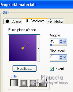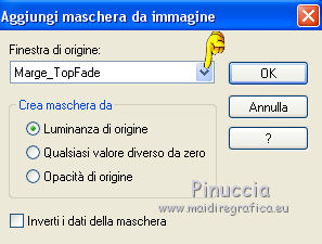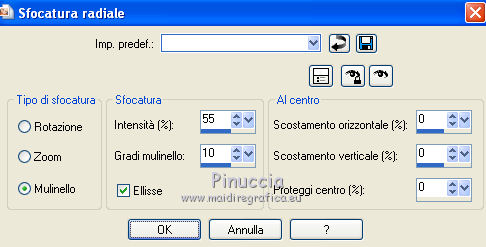 qui puoi trovare qualche risposta ai tuoi dubbi. Se l'argomento che ti interessa non è presente, ti prego di segnalarmelo. Questo tutorial è stato creato con PSP X2 e tradotto con Corel X, ma può essere eseguito anche con le altre versioni di PSP. Dalla versione X4, il comando Immagine>Rifletti è stato sostituito con Immagine>Capovolgi in orizzontale, e il comando Immagine>Capovolgi con Immagine>Capovolgi in verticale. Nelle versioni X5 e X6, le funzioni sono state migliorate rendendo disponibile il menu Oggetti. Con la versione X7 sono tornati i comandi Immagine>Rifletti e Immagine>Capovolgi, ma con nuove funzioni. Vedi la scheda sull'argomento qui traduzione francese/traduction française qui/ici Occorrente: À choix: le tube d'un personnage, un tube déco, et un masque pour dégrader le bord inférieur du top. Il tube è di Lori Filtri: in caso di dubbi, ricorda di consultare la mia sezione filtri qui Filters Unlimited 2.0 qui DSB Flux - Linear Transmission qui Simple qui Distort - Turn Your Inside Outside qui Xero - Porcelain qui I filtri Simple si possono usare da soli o importati in Filters Unlimited (come fare vedi qui) Se un filtro fornito appare con questa icona ![]() Apri la tua maschera e minimizzala con il resto del materiale. 1. Scegli due colori dal tuo tube principale. Imposta il colore di primo piano con il colore chiaro, e il colore di sfondo con il colore scuro. ![]() 2. Passa il colore di primo piano a Gradiente lineare, inverti selezionato. ![]() 3. Apri una nuova immagine trasparente 1024 x 500 pixels, e riempila con il gradiente.4. Selezione>Seleziona tutto. Apri il tuo tube e vai a Modifica>Copia. Torna al tuo lavoro e vai a Modifica>Incolla nella selezione. Selezione>Deseleziona. 5, Effetti>Effetti di immagine>Motivo unico, con i settaggi standard. ![]() 6. Regola>Sfocatura>Sfocatura radiale. ![]() 7. Effetti>Plugins>DSB Flux - Linear Transmission. ![]() 8. Effetti>Plugins>Distort - Turn your Inside Outside. ![]() 9. Effetti>Plugins>Simple - Diamonds. 10. Effetti>Plugins>Simple - Top Left Mirror. 11. Effetti>Plugins>Xero - Porcelain. ![]() 12. Immagine>Dimensione tela - 1024 x 550 pixels. ![]() 13. Livelli>Nuovo livello maschera>Da immagine Apri il menu sotto la finestra di origine e vedrai la lista dei files aperti. Seleziona la tua maschera Marge_Top_Fade (se non hai la maschera prendi questa qui Per il mio esempio ![]() Livelli>Duplica. Livelli>Unisci>Unisci gruppo. Nota: Se usi un altro tipo di maschera applica un Effetto Sfalsa ombra (a tua scelta). 14. Livelli>Nuovo livello raster. Livelli>Disponi>Porta sotto. Imposta il colore di primo piano con un colore del tuo top. Riempi il livello con questo colore.Livelli>Unisci>Unisci visibile. 15. Modifica>Incolla come nuovo livello (il tuo tube è sempre in memoria). Spostalo a sinistra.Livelli>Duplica. Immagine>Ridimensiona, all'80%, tutti i livelli non selezionato. Immagine>Rifletti. Applica la maschera. Livelli>Unisci>Unisci gruppo. Sposta il tube in alto a destra, vedi il mio esempio.Attiva il livello del tube originale. Effetti>Effetti 3D>Sfalsa ombra, settaggi a scelta. 16. Apri il tuo tube accessorio e vai a Modifica>Copia. Torna al tuo lavoro e vai a Modifica>Incolla come nuovo livello. Posiziona correttamente il tube.Aggiungi il tuo nome e/o il tuo watermark su un nuovo livello. Livelli>Unisci>Unisci tutto e salva in formato jpg. Il tube usato per questo esempio è di Min@ ![]() le vostre versioni qui ![]() Puoi scrivermi se hai problemi o dubbi, o trovi un link che non funziona, o soltanto per un saluto. 29 Gennaio 2011 |