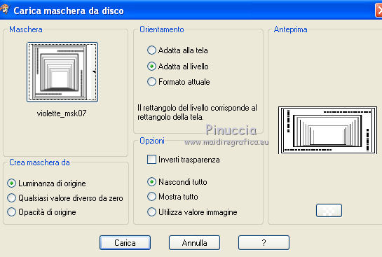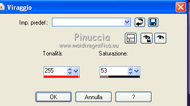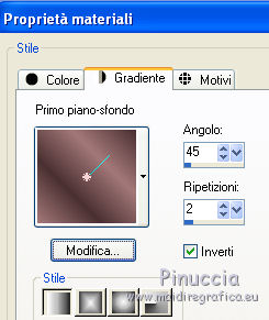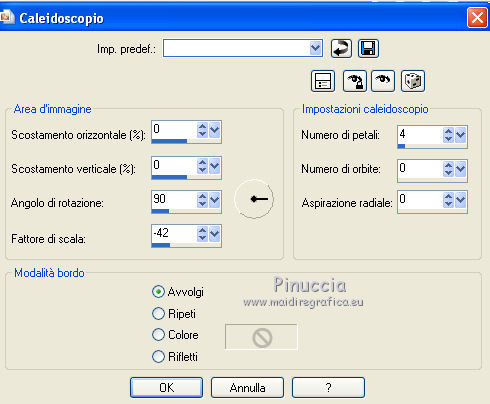 qui puoi trovare qualche risposta ai tuoi dubbi. Se l'argomento che ti interessa non è presente, ti prego di segnalarmelo. Questo tutorial è stato realizzato con CorelX2 e tradotto con Corel X, ma può essere realizzato anche con le altre versioni di PSP. Dalla versione X4, il comando Immagine>Rifletti è stato sostituito con Immagine>Capovolgi in orizzontale, e il comando Immagine>Capovolgi con Immagine>Capovolgi in verticale. Nelle versioni X5 e X6, le funzioni sono state migliorate rendendo disponibile il menu Oggetti. Con la nuova versione X7, sono tornati Rifletti>Capovolgi, ma con nuove varianti. Vedi la scheda sull'argomento qui traduzione in francese/traduction en français ici Le vostre versioni/vos versions ici Occorrente: Tubes e pennelli a scelta. Il resto del materiale qui Il tube della donna è di Lelanie, il tube dell'orologio è di kTs. Filtri: in caso di dubbi, ricorda di consultare la mia sezione filtri qui Filters Unlimited 2.0 qui Filter Factory Gallery Q - Streamer qui Filter Factory Gallery L - Bonny Tiler qui Filter Factory Gallery P - Frame 21 Seamless qui (nello zip trovi i singoli effetti) I filtri Factory Gallery si possono usare da soli o importati in Filters Unlimited (come fare vedi qui) Se un filtro fornito appare con questa icona ![]() Nelle ultime versioni di PSP non c'è il gradiente di primo piano/sfondo (Corel_06_029) Puoi usare i gradienti delle versioni precedenti. Trovi qui i gradienti Corel X. Metti la maschera nella cartella Maschere. 1. Scegli due colori dal tuo tube principale. Imposta il colore di primo piano con il colore scuro, e il colore di sfondo con il colore chiaro. ![]() Passa il colore di primo piano a Gradiente lineare, inverti selezionato. ![]() 2. Apri una nuova immagine trasparente 1024 x 500 pixels, e riempila con il gradiente.3. Selezione>Seleziona tutto. Apri il tuo tube principale e vai a Modifica>Copia. Torna al tuo lavoro e vai a Modifica>Incolla nella selezione. Selezione>Deseleziona. 4. Effetti>Effetti di immagine>Motivo unico, con i settaggi standard. ![]() 5. Regola>Sfocatura>Sfocatura radiale. ![]() 6. Effetti>Plugins>Filters Unlimited - Filter Factory Gallery Q - Streamer. ![]() 7. Effetti>Plugins>Filters Unlimited 2.0 - Filter Factory Gallery L - Bonny Tiler. ![]() 8. Livelli>Duplica. 9. Effetti>Plugins>Filters Unlimited - Filter Factory Gallery P - Frame 21 Seamless ![]() 10. Regola>Tonalità e saturazione>Viraggio (con i valori corrispondenti a uno dei colori scelti). I miei. ![]() 11. Livelli>Carica/salva maschera>Carica maschera da disco. Cerca e carica la maschera violette msk07. ![]() Livelli>Unisci>Unisci gruppo. 12. Effetti>Effetti 3D>Sfalsa ombra, con il colore nero. ![]() 13. Effetti>Effetti di riflesso>Caleidoscopio: ![]() Facoltativo: Colorizza il livello Raster 1 come al punto 10. 14. Immagine>Aggiungi bordatura, 2 pixels, simmetriche, con un colore molto chiaro. ![]() 15. Immagine>Ridimensiona, al 90%, tutti i livelli selezionato. ![]() 16. Regola>Messa a fuoco>Metti a fuoco. Modifica>Copia. 17. Apri una nuova immagine trasparente 1024 x 600 pixels, e riempila con il gradiente.18. Modifica>Incolla come nuovo livello. Sposta l'immagine un po' più in alto e a sinistra.19. Effetti>Effetti 3D>Sfalsa ombra: ![]() Ripeti l'Effetto Sfalsa ombra, cambiando verticale e orizzontale con -5. 20. Aggiungi i tuoi tubes e gli elementi che preferisci. 21. Firma il tuo lavoro. 22. Livelli>Unisci>Unisci tutto e salva in formato jpg. Il tube della donna è di Patries; non conosco l'autore del tube delle rose. ![]() ![]() Puoi scrivermi se hai problemi o dubbi, o trovi un link che non funziona, o soltanto per un saluto. 20 Gennaio 2011 |