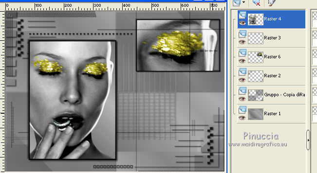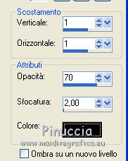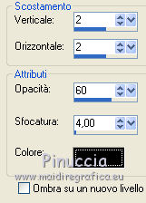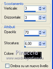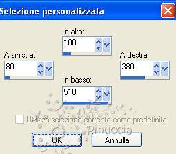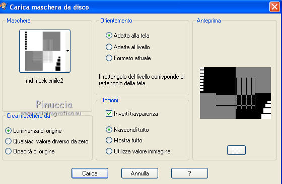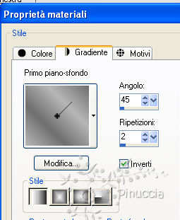 qui puoi trovare qualche risposta ai tuoi dubbi. Se l'argomento che ti interessa non è presente, ti prego di segnalarmelo. Questo tutorial è stato creato con PSP X2 e tradotto con CorelX, ma può essere eseguito anche con le altre versioni di PSP. Dalla versione X4, il comando Immagine>Rifletti è stato sostituito con Immagine>Capovolgi in orizzontale, e il comando Immagine>Capovolgi con Immagine>Capovolgi in verticale. Nelle versioni X5 e X6, le funzioni sono state migliorate rendendo disponibile il menu Oggetti. Con la versione X7 sono tornati i comandi Immagine>Rifletti e Immagine>Capovolgi, ma con nuove funzioni. Vedi la scheda sull'argomento qui traduzione in francese qui le vostre versioni qui Occorrente: Tubes a scelta. Il resto del materiale qui I tubes che ho usato sono di Mariel, HJR, @nn. Filtri: in caso di dubbi, ricorda di consultare la mia sezione filtri qui Filters Unlimited 2.0 qui FM Tile Tools - Collage Circular qui ![]() Metti la maschera md-mask-smile2 nella cartella Maschere. Apri il resto del materiale in PSP. 1. Scegli due colori dal tuo tube principale. Imposta il colore di primo piano con il colore scuro, e il colore di sfondo con il colore chiaro. Passa il colore di primo piano a Gradiente Lineare, inverti selezionato. ![]() 2. Apri una nuova immagine trasparente 750 x 550 pixels, e riempila con il gradiente.3. Effetti>Plugins>FM Tile Tools - Collage Circular. ![]() 4. Livelli>Duplica. 5. Effetti>Plugins>Filters Unlimited - Tile & Mirror - Kaleidoscope 2. ![]() 6. Livelli>Carica/Salva maschera>Carica maschera da disco. Cerca e carica la maschera md-masks-smile2: ![]() Livelli>Unisci>Unisci gruppo. 7. Effetti>Effetti 3D>Sfalsa ombra, con il colore nero. ![]() 8. Livelli>Nuovo livello raster. Selezione>Seleziona tutto. Apri "corners" e vai a Modifica>Copia. Torna al tuo lavoro e vai a Modifica>Incolla nella selezione. Selezione>Deseleziona. 9. Effetti>Effetti 3D>Sfalsa ombra, con il colore nero. ![]() 10. Livelli>Nuovo livello raster. Selezione>Seleziona tutto. Apri @nn_lijnen_FT e vai a Modifica>Copia. Torna al tuo lavoro e vai a Modifica>Incolla nella selezione. Selezione>Deseleziona. 11. Effetti>Effetti 3D>Sfalsa ombra, con il colore nero. ![]() 12. Livelli>Nuovo livello raster. Attiva lo strumento Selezione ,clicca sull'icona Selezione personalizzata ![]() e imposta i seguenti settaggi: ![]() Riempi la selezione con il gradiente.Apri il tuo tube e vai a Modifica>Copia. Torna al tuo lavoro e vai a Modifica>Incolla nella selezione. Selezione>Modifica>Seleziona bordature selezione. ![]() Livelli>Nuovo livello raster. Riempi la selezione con il colore nero.Selezione>Deseleziona. Livelli>Unisci>Unisci giù. Effetti>Effetti 3D>Sfalsa ombra, con il colore nero. ![]() Ripeti l'Effetto Sfalsa ombra, cambiando verticale e orizzontale con -4. 13. Livelli>Nuovo livello raster. Attiva lo strumento Selezione , rettangolo,e seleziona un rettangolo pressappoco come nell'esempio. ![]() Attiva nuovamente il tuo tube e seleziona una piccola parte.Modifica>Copia. Torna al tuo lavoro e vai a Modifica>Incolla nella selezione. Selezione>Modifica>Seleziona bordatura selezione. ![]() Riempi la selezione con il colore nero.Selezione>Deseleziona. Effetti>Effetti 3D>Sfalsa ombra: ![]() Ripeti l'Effetto Sfalsa ombra, cambiando verticale e orizzontale con -2. Attiva il livello Raster 3 ![]() Livelli>Disponi>Porta in alto. Attiva il livello della cornice a sinistra, raster 4. Livelli>Disponi>Porta in alto. ![]() 14. Completa il tuo lavoro, aggiungendo i tubes, pennelli o decorazioni che preferisci. 15. Immagine>Aggiungi bordatura, 2 pixels, simmetriche, con il colore nero. 16. Immagine>Aggiungi bordatura, 30 pixels, simmetriche, con un colore qualsiasi. Seleziona questo bordo con la bacchetta magica ![]() e riempilo con un motivo a tua scelta.Selezione>Deseleziona. 17. Immagine>Aggiungi bordatura, 2 pixels, simmetriche, con il colore nero. 18. Firma il tuo lavoro e salva in formato jpg. I tubes utilizzati per la traduzione in francese sono di Guismo ![]() ![]() Se hai problemi o dubbi, o trovi un link non funzionante, o anche soltanto per un saluto, scrivimi 7 Febbraio 2011 |