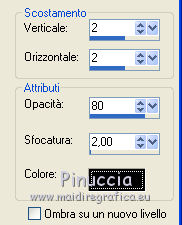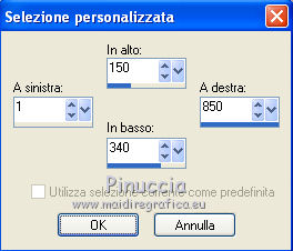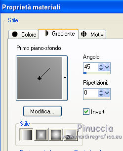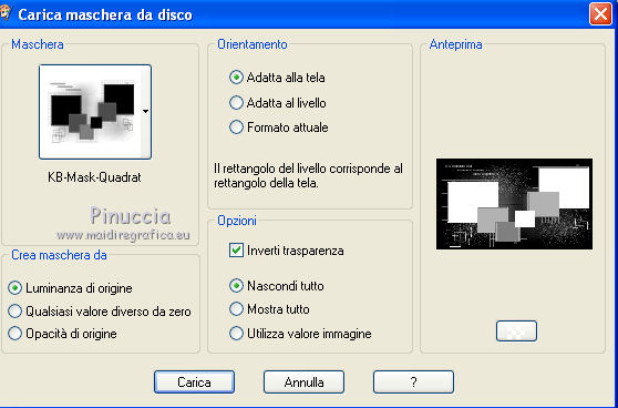 qui puoi trovare qualche risposta ai tuoi dubbi. Se l'argomento che ti interessa non è presente, ti prego di segnalarmelo. Questo tutorial è stato creato con PSP X2 e tradotto con PSP X, ma può essere eseguito anche con le altre versioni di PSP. Dalla versione X4, il comando Immagine>Rifletti è stato sostituito con Immagine>Capovolgi in orizzontale, e il comando Immagine>Capovolgi con Immagine>Capovolgi in verticale. Nelle versioni X5 e X6, le funzioni sono state migliorate rendendo disponibile il menu Oggetti. Con la versione X7 sono tornati i comandi Immagine>Rifletti e Immagine>Capovolgi, ma con nuove funzioni. Vedi la scheda sull'argomento qui Questo tutorial è una creazione di ©angel e non può essere copiato su altri siti nè essere offerto per il download. Lo stesso vale per la mia traduzione. Il materiale viene da vari gruppi di condivisione. Il copyright appartiene ai rispettivi autori. Grazie ai creatori dei tubes che mettono a disposizione il loro lavoro in vari gruppi di condivisione. Rispetta il lavoro degli autori, non cambiare il nome del file e non cancellare il watermark. traduzione in francese qui Occorrente: Materiale qui Il tube è di kTs. Una maschera è di Claire. Filtri: in caso di dubbi, ricorda di consultare la mia sezione filtri qui FM Tile Tools - Blend Emboss qui Richard Rosenman - Solid Border qui (lo trovi anche nello zip) ![]() Metti la maschera nella cartella Maschere. 1. Scegli due colori dai tuoi tubes. Imposta il colore di primo piano con il colore chiaro, e il colore di sfondo con il colore scuro. I miei colori. ![]() Passa il colore di primo piano a Gradiente Lineare. ![]() 2. Apri una nuova immagine trasparente 850 x 500 pixels, e riempila con il gradiente.3. Livelli>Nuovo livello raster. Selezione>Seleziona tutto. Apri claire_masque_boys_1 e vai a Modifica>Copia. Torna al tuo lavoro e vai a Modifica>Incolla nella selezione. Selezione>Deseleziona. Cambia la modalità di miscelatura di questo livello in Luminanza (esistente). Effetti>Plugins>FM Tile Tools - Blend Emboss, con i settaggi standard. ![]() 4. Livelli>Nuovo livello raster. Attiva lo strumento Selezione ,clicca sull'icona Selezione personalizzata ![]() e imposta i seguenti settaggi: ![]() Imposta il colore di primo piano con #404040, e riempi la selezione con questo colore.Selezione>Deseleziona. 5. Livelli>Nuovo livello raster. Imposta nuovamente il gradiente del passo 1. Riempi il livello con il gradiente.Livelli>Carica/Salva maschera>Carica maschera da disco. Cerca e carica la maschera KB-Mask-Quadrat. ![]() Livelli>Unisci>Unisci gruppo. Effetti>Effetti 3D>sfalsa ombra: ![]() Regola>Messa a fuoco>Metti a fuoco. 6. Apri memories-irma e vai a Modifica>Copia. Torna al tuo lavoro e vai a Modifica>Incolla come nuovo livello. Immagine>Ridimensiona, al 50%, tutti i livelli non selezionato. Spostalo in alto a destra.Effetti>Effetti Sfalsa ombra, a tua scelta (nel mio esempio ho usato i settaggi precedenti). Cambia la modalità di miscelatura di questo livello in Luce netta. Apri AEdwards_youFavoriteMemory e vai a Modifica>Copia. Torna al tuo lavoro e vai a Modifica>Incolla come nuovo livello. Immagine>Ridimensiona, una volta al 40% e una volta al 30%, tutti i livelli non selezionato. Spostalo a sinistra - vedi il mio esempio.Apri il tube kTs-318A_9copie e vai a Modifica>Copia. Torna al tuo lavoro e vai a Modifica>Incolla come nuovo livello. Immagine>Rifletti. Posiziona il tube al centro - vedi il mio esempio.Effetti>Effetti 3D>Sfalsa ombra, con settaggi a tua scelta. Apri il tube 7b5dd1e772 e vai a Modifica>Copia. Torna al tuo lavoro e vai a Modifica>Incolla come nuovo livello. Immagine>Ridimensiona, al 60%, tutti i livelli non selezionato. Spostalo in basso a destra.Effetti>Effetti 3D>Sfalsa ombra, con settaggi a tua scelta. 7. Livelli>Unisci>Unisci tutto. Effetti>Plugins>Richard Rosenman - Solid Border, con il colore #404040. ![]() Firma il tuo lavoro e salva in formato jpg. Il tube di questo esempio è di Isa. ![]() ![]() Se hai problemi o dubbi, o trovi un link non funzionante, o anche soltanto per dirmi che ti è piaciuto, scrivimi. 21 Novembre 2010 |