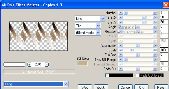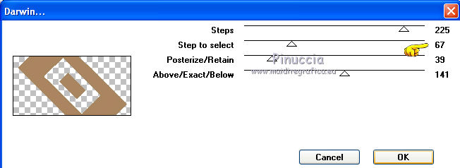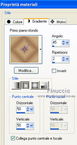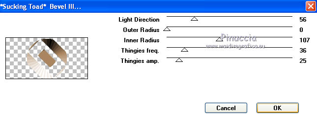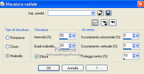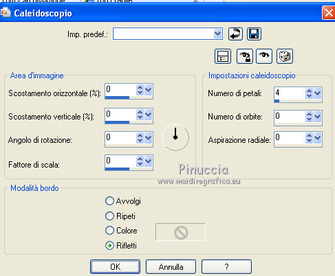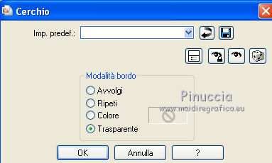 qui puoi trovare qualche risposta ai tuoi dubbi. Se l'argomento che ti interessa non è presente, ti prego di segnalarmelo. Questo tutorial è stato creato con PSP X2, ma può essere eseguito anche con le altre versioni di PSP. Dalla versione X4, il comando Immagine>Rifletti è stato sostituito con Immagine>Capovolgi in orizzontale, e il comando Immagine>Capovolgi con Immagine>Capovolgi in verticale. Nelle versioni X5 e X6, le funzioni sono state migliorate rendendo disponibile il menu Oggetti. Con la versione X7 sono tornati i comandi Immagine>Rifletti e Immagine>Capovolgi, ma con nuove funzioni. Vedi la scheda sull'argomento qui Per tradurre questo tutorial ho usato PSP X. traduzione in francese/traduction en français qui/ici le vostre versioni/vos versions qui/ici Occorrente: Un tube a scelta. I tubes usati sono di Ginatubes e Anna.br. Filtri: in caso di dubbi, ricorda di consultare la mia sezione filtri qui Filters Unlimited 2.0 qui Mura's Meister - Copies qui Toadies qui I filtri Toadies si possono usare da soli o importati in Filters Unlimited (come fare vedi qui) Se un filtro fornito appare con questa icona ![]() 1. Scegli due colori dal tuo tube. Imposta il colore di primo piano con il colore scuro, e il colore di sfondo con il colore chiaro. ![]() 2. Passa il colore di primo piano a Gradiente di primo piano/sfondo, stile Rettangolare. ![]() 3. Apri una nuova immagine trasparente 1000 x 500 pixels, e riempila con il colore chiaro di sfondo.4. Selezione>Seleziona tutto. Apri il tuo tube e vai a Modifica>Copia. Torna al tuo lavoro e vai a Modifica>Incolla nella selezione. Selezione>Deseleziona. Attenzione: il risultato di questo tutorial può variare a seconda del tube che stai usando 5. Effetti>Effetti di immagine>Motivo unico, con i settaggi standard. ![]() 6. Regola>Sfocatura>Sfocatura radiale. ![]() 7. Effetti>Effetti di immagine>Motivo unico, con i settaggi standard. ![]() 8. Livelli>Nuovo livello raster. Riempi il livello con il gradiente.9. Effetti>Plugins>Toadies - Look,Butthead,a TV: ![]() 10. Effetti>Effetti 3D>Sfalsa ombra, con il colore nero. ![]() 11. Effetti>Effetti di riflesso>Caleidoscopio. ![]() 12. Livelli>Nuovo livello raster. Riempi con il gradiente.13. Effetti>Plugins>Toadies - Darwin. se necessario, a seconda del risultato che vedi nella finestra di anteprima, gioca sul settaggio "Step to select" (da 67 a 89 circa). Lo sfondo dovrebbe rimanere trasparente e la forma visibile. ![]() 14. Effetti>Effetti 3D>Sfalsa ombra, con il colore nero. ![]() 15. Effetti>Plugins>Toadies - *Sucking Toad* Bevel III. ![]() 16. Effetti>Effetti geometrici>Cerchio. ![]() 17. Effetti>Plugins>Mura's Meister - Copies. ![]() 18. Ripeti Effetti>Effetti geometrici>Cerchio. ![]() 19. Effetti>Effetti 3D>Sfalsa ombra, con il colore nero. ![]() 20. Effetti>Effetti di immagine>Scostamento. ![]() Livelli>Duplica. Immagine>Rifletti. Livelli>Unisci>Unisci giù. Regola>Messa a fuoco>Metti a fuoco. 21. Apri il tuo tube e vai a Modifica>Copia. Torna al tuo lavoro e vai a Modifica>Incolla come nuovo livello. Immagine>Ridimensiona, se e quanto necessario. Effetti>Effetti 3D>Sfalsa ombra, con i settaggi precedenti. Aggiungi tube decorativi a tuo piacimento. (per il mio esempio ho usato ornamenti standard di PSP). Livelli>Unisci>Unisci tutto. Immagine>Aggiungi bordatura, 3 pixels, simmetriche, con il tuo colore scuro. Livelli>Innalza livello di sfondo. Livelli>Nuovo livello raster. Livelli>Disponi>Sposta giù. Immagine>Dimensione tela. ![]() Riempi con il colore chiaro.Attiva il livello superiore del top. Effetti>Effetti 3D>Sfalsa ombra, con il colore nero. ![]() Ripeti l'Effetto Sfalsa ombra, cambiando verticale e orizzontale con -4. Livelli>Unisci>Unisci tutto. Firma il tuo lavoro e salva in formato jpg. ![]() Il tube di questo esempio è di Nurso ![]() ![]() Se hai problemi o dubbi, o trovi un link non funzionante, o anche soltanto per un saluto, scrivimi 5 Gennaio 2011 |