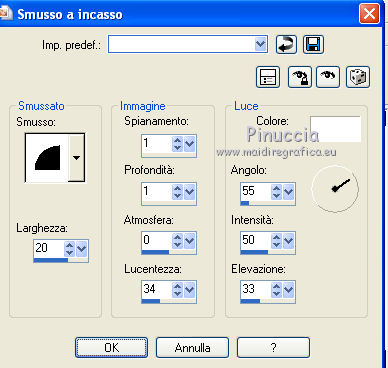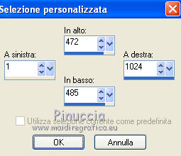 qui puoi trovare qualche risposta ai tuoi dubbi. Se l'argomento che ti interessa non è presente, ti prego di segnalarmelo. Questo tutorial è stato creato con PSP X2, ma può essere eseguito anche con le altre versioni di PSP. Dalla versione X4, il comando Immagine>Rifletti è stato sostituito con Immagine>Capovolgi in orizzontale, e il comando Immagine>Capovolgi con Immagine>Capovolgi in verticale. Nelle versioni X5 e X6, le funzioni sono state migliorate rendendo disponibile il menu Oggetti. Con la versione X7 sono tornati i comandi Immagine>Rifletti e Immagine>Capovolgi, ma con nuove funzioni. Vedi la scheda sull'argomento qui Per tradurre questo tutorial ho usato PSP X. traduzione francese/traduction en français qui/ici le vostre versioni/vos versions qui/ici Occorrente: Materiale qui Tube donna: Guismo. quadri: Lelanie. pennello: L&K vaso: jarronzen_camerontags Filtri: in caso di dubbi, ricorda di consultare la mia sezione filtri qui Filters Unlimited 2.0 qui Alien Skin Eye Candy 5 Impact - Perspective Shadow qui Richard Rosenman - Solid Border qui Mura's Meister - Perspective Tiling qui Toadies qui I filtri Toadies si possono usare da soli o importati in Filters Unlimited (come fare vedi qui) Se un filtro fornito appare con questa icona ![]() Metti il pennello L&K_les_Ashton nella cartella Pennelli. Attenzione, il pennello è composto da 2 files che non devono essere separati. Vedi gli appunti sui pennelli qui 1. Imposta il colore di primo piano con il colore bianco, e il colore di sfondo con il colore nero. ![]() 2. Apri una nuova immagine trasparente 1024 x 600 pixels, e riempila con il colore bianco.3. Livelli>Duplica. Effetti>Plugins>Toadies - 3D Checkers. ![]() 4. Effetti>Plugins>Mura's Meister - Perspective Tiling. ![]() 5. Livelli>Nuovo livello raster. Attiva lo strumento Selezione ,clicca sull'icona Selezione personalizzata ![]() e imposta i seguenti settaggi: ![]() Riempi la selezione con il colore nero.Effetti>Effetti 3D>Smusso a incasso. ![]() Selezione>Deseleziona. Livelli>Unisci>Unisci giù. 6. Livelli>Nuovo livello raster. Attiva lo strumento Pennello ![]() Cerca e seleziona il pennello L&K_les_Ashton_4, ![]() e applicalo a destra cliccando con il tasto destro del mouse per usare il colore nero di sfondo. ![]() Effetti>Effetti 3D>Sfalsa ombra, con il colore nero. ![]() 7. Apri il tube Lelanie_HappyNewYear_Frames e vai a Modifica>copia. Torna al tuo lavoro e vai a Modifica>Incolla come nuovo livello. Immagine>Ridimensiona, al 75%, tutti i livelli non selezionato. Sposta il tube in alto a sinistra.Effetti>Effetti 3D>Sfalsa ombra, con il colore nero. ![]() 8. Attiva lo strumento Selezione , rettangolo,e seleziona la prima cornice. ![]() Livelli>Nuovo livello raster. Apri il tube TYW-BWFACES. Attiva il livello inferiore e vai a Modifica>Copia. Torna al tuo lavoro e vai a Modifica>Incolla nella selezione. Selezione>Deseleziona. Livelli>Disponi>Sposta giù. Attiva nuovamente il livello delle cornici e seleziona la cornice a destra.![]() Livelli>Nuovo livello raster. Apri il tube TYW-BWFACES. Attiva il livello superiore e vai a Modifica>Copia. Torna al tuo lavoro e vai a Modifica>Incolla nella selezione. Selezione>Deseleziona. Livelli>Disponi>Sposta giù. 9. Attiva il livello superiore. Apri il tube calguissilhouette e vai a Modifica>Copia. Torna al tuo lavoro e vai a Modifica>Incolla come nuovo livello. Immagine>Ridimensiona, al 65%, tutti i livelli non selezionato. Sposta il tube in basso, vedi il mio esempio.Effetti>Plugins>Alien Skin Eye Candy 5 Impact - Perspective Shadow, seleziona il preset Reflect Behind e ok. ![]() Apri il tube jarronzen_camerontags e vai a Modifica>Copia. Torna al tuo lavoro e vai a Modifica>Incolla come nuovo livello. Immagine>Ridimensiona, al 70%, tutti i livelli non selezionato. Spostalo in basso a destra, come nel mio esempio.Effetti>Effetti 3D>Sfalsa ombra, con il colore nero. ![]() 11. Livelli>Unisci>Unisci tutto. 12. Effetti>Plugins>Richard Rosenman - Solid Border, colore nero. ![]() Livelli>Innalza livello di sfondo. Effetti>Effetti 3D>Sfalsa ombra, con il colore nero. ![]() 13. Livelli>Nuovo livello raster. Immagine>Dimensione tela. ![]() Livelli>Disponi>Sposta giù. Riempi il livello con il colore bianco.Attiva il livello superiore. Effetti>Effetti 3D>Sfalsa ombra. ![]() Livelli>Unisci>Unisci tutto. Firma il tuo lavoro e salva in formato jpg. I tubes di questa versione sono di ©Ty Wilson et Anna.br. ![]() ![]() Se hai problemi o dubbi, o trovi un link non funzionante, o anche soltanto per un saluto, scrivimi 5 Gennaio 2011 |