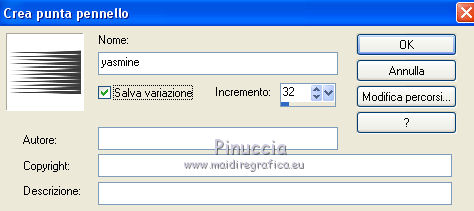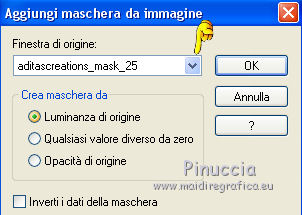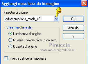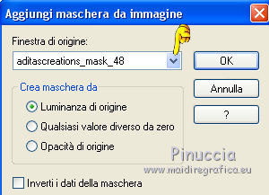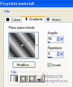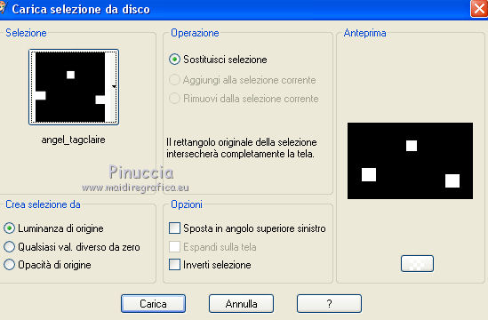 qui puoi trovare qualche risposta ai tuoi dubbi. Se l'argomento che ti interessa non è presente, ti prego di segnalarmelo. Questo tutorial è stato creato con PSP7 e tradotto con PSP X, ma può essere eseguito anche con le altre versioni di PSP. Dalla versione X4, il comando Immagine>Rifletti è stato sostituito con Immagine>Capovolgi in orizzontale, e il comando Immagine>Capovolgi con Immagine>Capovolgi in verticale. Nelle versioni X5 e X6, le funzioni sono state migliorate rendendo disponibile il menu Oggetti. Con la versione X7 sono tornati i comandi Immagine>Rifletti e Immagine>Capovolgi, ma con nuove funzioni. Vedi la scheda sull'argomento qui Questo tutorial è una creazione di ©An.gel e non può essere copiato su altri siti nè essere offerto per il download. Lo stesso vale per la mia traduzione. Il materiale viene da vari gruppi di condivisione. Il copyright appartiene ai rispettivi autori. Grazie ai creatori dei tubes che mettono a disposizione il loro lavoro in vari gruppi di condivisione. Rispetta il lavoro degli autori, non cambiare il nome del file e non cancellare il watermark. traduzione in francese qui le vostre versioni qui Occorrente: Materiale qui I tube sono di Alies e Jeann. Le maschere sono di Adita e @nn. Filtri: in caso di dubbi, ricorda di consultare la mia sezione filtri qui Filters Unlimited 2 qui Mehdi - Sorting Tiles qui L&K's - L&K's Zitah qui Alien Skin Eye Candy 5 Impact - Glass qui &<Background Designers IV> (da importare in Unlimited qui I filtri Unplugged Tools si possono usare da soli o importati in Filters Unlimited (come fare vedi qui) Se un filtro fornito appare con questa icona ![]() in base ai tuoi colori non esitare a sperimentare le modalità di miscelatura e opacità più adatte Nelle ultime versioni di PSP non c'è il gradiente di primo piano/sfondo (Corel_06_029) Trovi i gradienti delle versioni precedenti qui Apri il font e minimizzalo. Lo troverai nella lista dei font disponibili quando ti servirà. Con i nuovi sistemi operativi questo non è più possibile. Per usare un font occorre copiarlo nella cartella Font di Windows. Metti la selezione nella cartella Selezioni. Apri le maschere in PSP e minimizzale con il resto del materiale. 1. Scegli due colori dal tuo tube. Imposta il colore di primo piano con il colore scuro e il colore di sfondo con il colore chiaro. I miei colori. ![]() Passa il colore di primo piano a Gradiente di primo piano/sfondo, stile Lineare. ![]() 2. Apri una nuova immagine trasparente 900 x 550 pixels, e riempila con il gradiente.3. Effetti>Plugins>Mehdi - Sorting Tiles. ![]() 4. Effetti>Plugins>Filters Unlimited 2.0 - &<Background Designers IV> - sf10 Diamond Flip. ![]() Regola>Messa a fuoco>Metti a fuoco. 5. Effetti>Plugins>L&K's - L&K's - Zitah. ![]() 6. Imposta il colore di primo piano con un colore più scuro (il mio #000000). Livelli>Nuovo livello raster. Riempi con il colore nero.Livelli>Nuovo livello maschera>Da immagine. Apri il menu sotto la finestra di origine e vedrai la lista dei files aperti. Seleziona la maschera aditascreations_mask_48, con i seguenti settaggi. ![]() Livelli>Unisci>Unisci gruppo. 7. Imposta il colore di sfondo con un colore più chiaro (il mio #ffffff). Livelli>Nuovo livello raster. Riempi con il colore bianco.Livelli>Nuovo livello maschera>Da immagine. Apri il menu sotto la finestra di origine e seleziona la maschera aditascreations_mask_25, con i seguenti settaggi. ![]() Livelli>Unisci>Unisci gruppo. Immagine>Rifletti. Regola>Messa a fuoco>Metti a fuoco. 8. Imposta il colore di sfondo con un altro colore più chiaro (il mio #c0c0c0). Livelli>Nuovo livello raster. Riempi con il colore più chiaro di sfondo.Livelli>Nuovo livello maschera>Da immagine. Apri il menu sotto la finestra di origine e seleziona la maschera aditascreations_mask_46, con i seguenti settaggi. ![]() Livelli>Unisci>Unisci gruppo. Cambia la modalità di miscelatura di questo livello in Luce diffusa. Effetti>Effetti di bordo>Aumenta. 9. Livelli>Nuovo livello raster. Ancora una volta cambia il colore di sfondo con un colore più chiaro (il mio #e3e3e3). Livelli>Nuovo livello raster. Riempi con il nuovo colore chiaro.Livelli>Nuovo livello maschera>Da immagine. Apri il menu sotto la finestra di origine e vedrai la lista dei files aperti. Seleziona la maschera @nn_181112_mask_208_tdstudio, con i seguenti settaggi. ![]() Livelli>Unisci>Unisci gruppo. Regola>Messa a fuoco>Metti a fuoco. 10. Livelli>Nuovo livello raster. Selezione>Carica/Salva selezione>Carica selezione da disco. Cerca e carica la selezione angel_tagclaire. ![]() Imposta il colore di sfondo con il colore bianco #ffffff, e riempi la selezione con il colore bianco.11. Apri il pennello @nn_yasmine_2107. File>Esporta>Pennello personalizzato; assegna un nome al pennello e ok. ![]() Imposta il colore di primo piano con un colore scuro (il mio #000000). Livelli>Nuovo livello raster. Attiva lo strumento Pennello ![]() cerca e seleziona il pennello appena esportato, dimensione 110, applica il pennello nelle selezioni dei due quadri in basso. Riduci la dimensione a 90, e applica il pennello nella selezione del quadro in alto. Selezione>Deseleziona. 12. Effetti>Plugins>Alien Skin Eye Candy 5 Impact - Glass seleziona il preset Clear e ok. ![]() Se stai usando un altro colore, cambia la modalità di miscelatura di questo livello in Luminanza (esistente). Livelli>Disponi>Sposta giù. 13. Apri variant_figur2, e vai a Modifica>Copia. Torna al tuo lavoro e vai a Modifica>Incolla come nuovo livello. Cambia la modalità di miscelatura di questo livello in Filtra. Immagine>Rifletti. Regola>Messa a fuoco>Accentua messa a fuoco. Effetti>Effetti di immagine>Scostamento. ![]() Abbassa l'opacità di questo livello al 75%. 14. Attiva il livello superiore. Attiva lo strumento Testo , font An Creon,regola la dimensione secondo il tuo testo e la versione di PSP che stai usando, e scrivi il tuo testo a destra. Livelli>Converti in livello raster. Effetti>Effetti 3D>Sfalsa ombra. ![]() 15