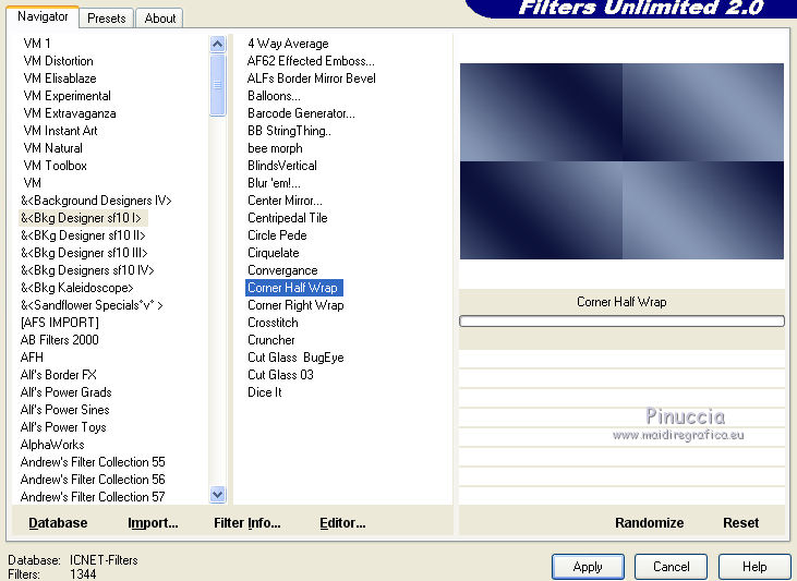 4. Effets>Modules Externes>Filters Unlimited 2.0 - &<Bkg Designer sf10I> - Corner Half Wrap.