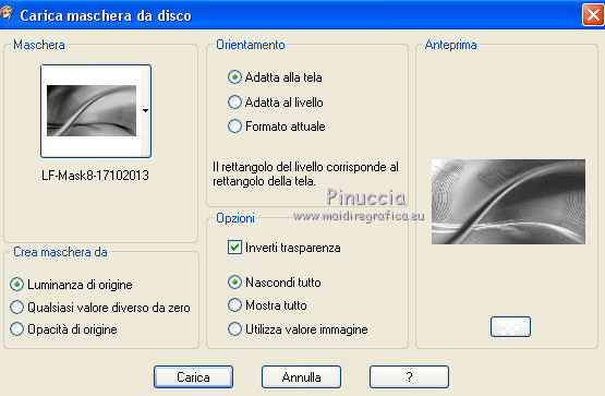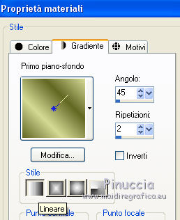 qui puoi trovare qualche risposta ai tuoi dubbi. Se l'argomento che ti interessa non è presente, ti prego di segnalarmelo. Questo tutorial è stato creato con PSP7 e tradotto con PSP X, ma può essere eseguito anche con le altre versioni di PSP. Dalla versione X4, il comando Immagine>Rifletti è stato sostituito con Immagine>Capovolgi in orizzontale, e il comando Immagine>Capovolgi con Immagine>Capovolgi in verticale. Nelle versioni X5 e X6, le funzioni sono state migliorate rendendo disponibile il menu Oggetti. Con la versione X7 sono tornati i comandi Immagine>Rifletti e Immagine>Capovolgi, ma con nuove funzioni. Vedi la scheda sull'argomento qui Questo tutorial è una creazione di ©An.gel e non può essere copiato su altri siti nè essere offerto per il download. Lo stesso vale per la mia traduzione. Il materiale viene da vari gruppi di condivisione. Il copyright appartiene ai rispettivi autori. Grazie ai creatori dei tubes che mettono a disposizione il loro lavoro in vari gruppi di condivisione. Rispetta il lavoro degli autori, non cambiare il nome del file e non cancellare il watermark. traduzione in francese qui le vostre versioni qui Occorrente: Materiale qui I tube sono di Guismo. Le maschere sono di Linda e Astrid. Filtri: in caso di dubbi, ricorda di consultare la mia sezione filtri qui Filters Unlimited 2 qui VM Texture - Tiles a GoGo qui VM Distortion - Flipper qui Sapphire Filters 01 - SapphirePlugin_0001 qui I filtri Sapphire, VM Distortion e VM Texture si possono usare da soli o importati in Filters Unlimited (come fare vedi qui) Se un filtro fornito appare con questa icona ![]() in base ai tuoi colori non esitare a sperimentare le modalità di miscelatura e opacità più adatte Nelle ultime versioni di PSP non c'è il gradiente di primo piano/sfondo (Corel_06_029) Trovi i gradienti delle versioni precedenti qui Apri il font e minimizzalo. Lo troverai nella lista dei font disponibili quando ti servirà. Con i nuovi sistemi operativi questo non è più possibile. Per usare un font occorre copiarlo nella cartella Font di Windows. Metti le maschere nella cartella Maschere. 1. Scegli due colori dal tuo tube. Per l'esempio: colore di primo piano #626723, colore di sfondo #d4da94. ![]() 2. Passa il colore di primo piano a Gradiente di primo piano/sfondo, stile Lineare. ![]() 3. Apri una nuova immagine trasparente 900 x 550 pixels, e riempila con il gradiente.4. Regola>Sfocatura>Sfocatura gaussiana - raggio 40. ![]() 5. Effetti>Plugins>Filters Unlimited 2.0 - VM Texture - Tiles a GoGo. ![]() 6. Effetti>Plugins>VM Distortion - Flipper ![]() 7. Effetti>Plugins>Filters Unlimited 2.0 - Tile & Mirror - Seamless Blend (horizontal). ![]() 8. Effetti>Plugins>Sapphire Filters - SapphirePlugin0001. ![]() 9. Imposta il colore di primo piano con un colore più scuro (il mio #444818). Livelli>Nuovo livello raster. Riempi con il colore scuro di primo piano.10. Livelli>Carica/Salva maschera>Carica maschera da disco. Cerca e carica la maschera LF-Mask8-17102013. ![]() Livelli>Unisci>Unisci gruppo. Regola>Messa a fuoco>Metti a fuoco. 11. Livelli>Nuovo livello raster. Riempi con il colore chiaro di sfondo.12. Livelli>Carica/Salva maschera>Carica maschera da disco. Cerca e carica la maschera Astrid masker 134. ![]() Livelli>Unisci>Unisci gruppo. Regola>Messa a fuoco>Metti a fuoco. 13. Apri il wordart wordartmix4, e vai a Modifica>Copia. Torna al tuo lavoro e vai a Modifica>Incolla come nuovo livello. Spostalo in alto a sinistra.Cambia la modalità di miscelatura di questo livello in Moltiplica. 14. Apri il tube calguisdecoautomne, e vai a Modifica>Copia. Torna al tuo lavoro e vai a Modifica>Incolla come nuovo livello. Immagine>Ridimensiona, al 50%, tutti i livelli non selezionato. Spostalo in alto a destra.15. Apri il tube mabelledeco, e vai a Modifica>Copia. Torna al tuo lavoro e vai a Modifica>Incolla come nuovo livello. 16. Apri il tube della donna, e vai a Modifica>Copia. Torna al tuo lavoro e vai a Modifica>Incolla come nuovo livello. Immagine>Ridimensiona, al 70%, tutti i livelli non selezionato. Spostalo a sinistra.Effetti>Effetti 3D>Sfalsa ombra, settaggi a scelta. 17. Attiva lo strumento Testo , font Affair,e scrivi Mabelle (o quello che preferisci). Posiziona il testo e, se vuoi, applica una leggera rotazione. ![]() Livelli>Converti in livello raster. Effetti>Effetti 3D>Sfalsa ombra, settaggi a scelta. 18. Immagine>Aggiungi bordatura, 2 pixels, simmetriche, colore di primo piano. Immagine>Aggiungi bordatura, 30 pixels, simmetriche, colore bianco. Firma il tuo lavoro e salva in formato jpg. Per questo esempio ho usato tubes di Gabry. ![]() ![]() Se hai problemi o dubbi, o trovi un link non funzionante, o anche soltanto per un saluto, scrivimi. 27 Luglio 2015 |