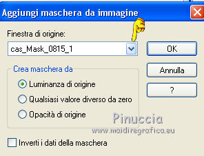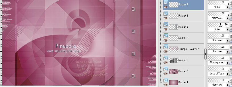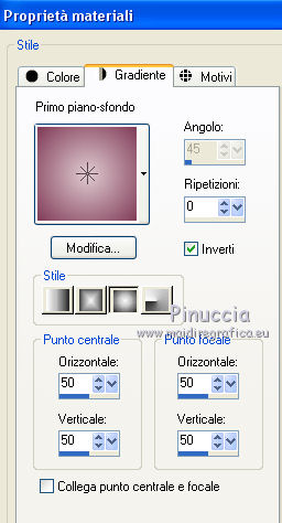 qui puoi trovare qualche risposta ai tuoi dubbi. Se l'argomento che ti interessa non è presente, ti prego di segnalarmelo. Questo tutorial è stato creato con PSP7 e tradotto con PSP X, ma può essere eseguito anche con le altre versioni di PSP. Dalla versione X4, il comando Immagine>Rifletti è stato sostituito con Immagine>Capovolgi in orizzontale, e il comando Immagine>Capovolgi con Immagine>Capovolgi in verticale. Nelle versioni X5 e X6, le funzioni sono state migliorate rendendo disponibile il menu Oggetti. Con la versione X7 sono tornati i comandi Immagine>Rifletti e Immagine>Capovolgi, ma con nuove funzioni. Vedi la scheda sull'argomento qui traduzione in francese qui le vostre versioni qui Occorrente: Materiale qui Il tube della donna by K@rine_Dreams deco 2 Daisy MD by Monaiekle Designs deco: attitude_3 maschera: Casiops maschera: CL Designs wordart: WA_adorable_byZibr1 Filtri: in caso di dubbi, ricorda di consultare la mia sezione filtri qui Filters Unlimited 2 qui Crescent Moon - Cut Glass qui Unplugged Tools - Round Button qui L&K's - L&K's Zitah qui Mura's Meister - Copies qui I filtri Crescent Moon e Unplugged Tools si possono usare da soli o importati in Filters Unlimited (come fare vedi qui) Se un filtro fornito appare con questa icona ![]() in base ai tuoi colori non esitare a sperimentare le modalità di miscelatura e opacità più adatte Nelle ultime versioni di PSP non c'è il gradiente di primo piano/sfondo (Corel_06_029) Trovi i gradienti delle versioni precedenti qui Apri la maschera in PSP e minimizzala con il resto del materiale. 1. Scegli due colori dal tuo tube. Per l'esempio: colore di primo piano #803a56, colore di sfondo #dfcbd1. ![]() Passa il colore di primo piano a Gradiente di primo piano/sfondo, Stile Sprazzo di luce. ![]() 2. Apri una nuova immagine trasparente 900 x 500 pixels, e riempila con il gradiente.3. Se stai usando un altro tube, utilizza lo sfondo del tube che trovi nel materiale. Livelli>Nuovo livello raster. Selezione>Seleziona tutto. Apri il tube k@rine_ Dreams_Lady_Jewel_2865_Mars_2014 e attiva il livello di sfondo Raster 2. ![]() Modifica>Copia. Torna al tuo lavoro e vai a Modifica>Incolla nella selezione. Selezione>Deseleziona. 4. Regola>Sfocatura>Sfocatura gaussiana - raggio 25. ![]() 5. Regola>Sfocatura>Sfocatura radiale. ![]() 6. Effetti>Plugins>Crescent Moon - Cut Glass. ![]() 7. Effetti>Plugins>Unplugged Tools - Round Button. ![]() 8. Effetti>Plugins>Mura's Meister - Copies. ![]() Cambia la modalità di miscelatura di questo livello in Luce diffusa. ![]() Effetti>Effetti di bordo>Aumenta. 9. Effetti>Plugins>L&K's - L&K's Zitah. ![]() 10. Apri la maschera CLDesign_Digital_Art_tuto_mask1 e vai a Modifica>Copia. Torna al tuo lavoro e vai a Modifica>incolla come nuovo livello. Cambia la modalità di miscelatura di questo livello in Sovrapponi. ![]() 11. Riporta il colore di primo piano a Colore. Livelli>Nuovo livello raster. Riempi con il colore scuro di primo piano #803a56.Livelli>Nuovo livello maschera>Da immagine. Apri il menu sotto la finestra di origine e vedrai la lista dei files aperti. Seleziona la maschera cas_Mask_0815_1. ![]() Livelli>Unisci>Unisci gruppo. 12. Apri il testo textpinuccia1_angel e vai a Modifica>Copia. Torna al tuo lavoro e vai a Modifica>incolla come nuovo livello. 13. Apri il tube attitude_3 e vai a Modifica>Copia. Torna al tuo lavoro e vai a Modifica>incolla come nuovo livello. Effetti>Effetti di immagine>Scostamento. ![]() Cambia la modalità di miscelatura di questo livello in Filtra, e mantieni l'opacità al 60%. ![]() 14. Apri il tube 2 Daisy MD e vai a Modifica>Copia. Torna al tuo lavoro e vai a Modifica>incolla come nuovo livello. Effetti>Effetti di immagine>Scostamento. ![]() 15. Apri il wordart WA_adorable_byZibr1 e vai a Modifica>Copia. Torna al tuo lavoro e vai a Modifica>incolla come nuovo livello. Immagine>Ridimensiona, al 18%, tutti i livelli non selezionato. Effetti>Effetti di immagine>Scostamento. ![]() Cambia la modalità di miscelatura di questo livello in Filtra. ![]() 16. Apri il tube k@rine_ Dreams_Lady_Jewel_2865_Mars_2014 e vai a Modifica>Copia. Torna al tuo lavoro e vai a Modifica>incolla come nuovo livello. Immagine>Ridimensiona, al 69%, tutti i livelli non selezionato. Spostalo a sinistra.Effetti>Effetti 3D>Sfalsa ombra, con i seguenti settaggi (o come preferisci). ![]() 17. Apri il file con la parola Pinuccia e vai a Modifica>Copia. Torna al tuo lavoro e vai a Modifica>incolla come nuovo livello. Effetti>Effetti di immagine>Scostamento. ![]() Cambia la modalità di miscelatura di questo livello in Luminanza (esistente). 18. Immagine>Aggiungi bordatura, 1 pixel, simmetriche, colore di sfondo #803a56. Immagine>Aggiungi bordatura, 10 pixels, simmetriche, colore bianco #ffffff. 19. Firma il tuo lavoro e salva in formato jpg. Per questo esempio ho usato un tube di Gabry ![]() ![]() Se hai problemi o dubbi, o trovi un link non funzionante, o anche soltanto per un saluto, scrivimi. 27 Marzo 2016 |