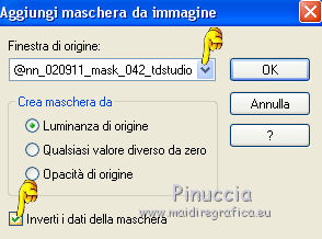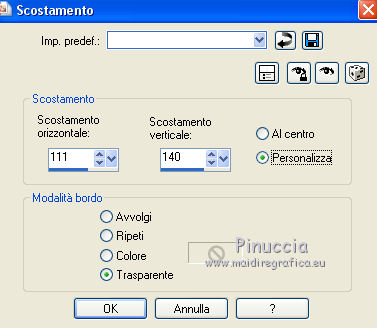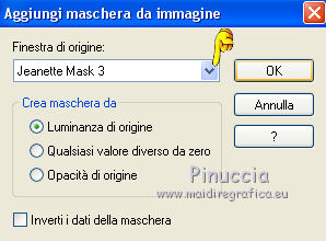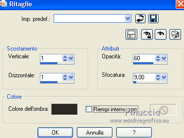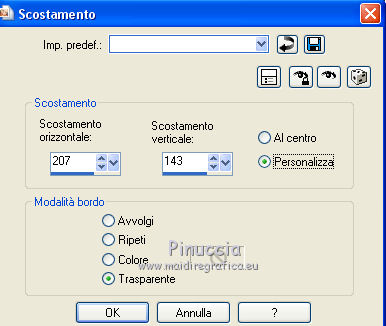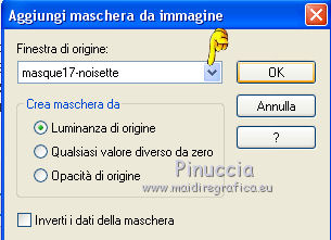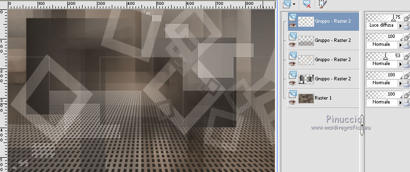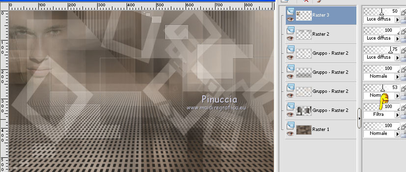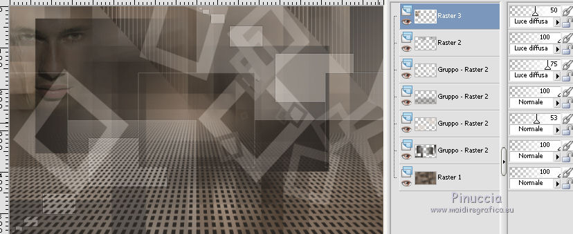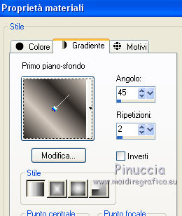 qui puoi trovare qualche risposta ai tuoi dubbi. Se l'argomento che ti interessa non è presente, ti prego di segnalarmelo. Questo tutorial è stato creato con PSP7 e tradotto con PSP X, ma può essere eseguito anche con le altre versioni di PSP. Dalla versione X4, il comando Immagine>Rifletti è stato sostituito con Immagine>Capovolgi in orizzontale, e il comando Immagine>Capovolgi con Immagine>Capovolgi in verticale. Nelle versioni X5 e X6, le funzioni sono state migliorate rendendo disponibile il menu Oggetti. Con la versione X7 sono tornati i comandi Immagine>Rifletti e Immagine>Capovolgi, ma con nuove funzioni. Vedi la scheda sull'argomento qui traduzione in francese qui le vostre versioni qui Occorrente: Materiale qui Tube della donna by Luz Cristina. Decos: Msb maschere: @nn, Noisette, Jeanette misted uomo: LB Tubes vaso: mtfp tubes wordart: Ton_regard_-_Wordart_par_Krizomel Filtri: in caso di dubbi, ricorda di consultare la mia sezione filtri qui Filters Unlimited 2 qui &<Bkg Designer sf10II> - Diamonds (da importare in Unlimited) qui Unplugged Tools - Vertical Tiles qui Mehdi - Sorting Tiles qui Italian Editors Effects - Effetto Fantasma qui I filtri Italian Editors e Unplugged Tools si possono usare da soli o importati in Filters Unlimited (come fare vedi qui) Se un filtro fornito appare con questa icona ![]() in base ai tuoi colori non esitare a sperimentare le modalità di miscelatura e opacità più adatte Nelle ultime versioni di PSP non c'è il gradiente di primo piano/sfondo (Corel_06_029) Trovi i gradienti delle versioni precedenti qui Apri le maschere in PSP e minimizzale con il resto del materiale. 1. Scegli due colori dal tuo tube. Per l'esempio: colore di primo piano #2d2925, colore di sfondo #d4c9be. ![]() Passa il colore di primo piano a Gradiente di primo piano/sfondo, stile Lineare. ![]() 2. Apri una nuova immagine trasparente 900 x 550 pixels, e riempila con il gradiente.3. Regola>Sfocatura>Sfocatura gaussiana - raggio 40. ![]() 4. Selezione>Seleziona tutto. Apri il tube della donna e vai a Modifica>Copia. non chiuderlo perchè ti servirà ancora Torna al tuo lavoro e vai a Modifica>Incolla nella selezione. Selezione>Deseleziona. 5. Effetti>Effetti di immagine>Motivo unico, con i settaggi standard. ![]() Regola>Sfocatura>Sfocatura radiale. ![]() 6. Effetti>Plugins>Filters Unlimited 2.0 - &<Bkg Designer sf10II> - Diamonds. ![]() 7. Effetti>Plugins>Unplugged Tools - Vertical Tiles. ![]() 8. Effetti>Plugins>Mehdi - Sorting Tiles. ![]() 9. Effetti>Plugins>Italian Editors Effects - Effetto Fantasma. ![]() 10. Riporta il colore di primo piano a Colore. Livelli>Nuovo livello raster. Riempi con il colore scuro di primo piano #2d2925.Livelli>Nuovo livello maschera>Da immagine. Apri il menu sotto la finestra di origine e vedrai la lista dei files aperti. Seleziona la maschera Jeanette Mask 3. ![]() Livelli>Unisci>Unisci gruppo. 11. Imposta il colore di sfondo con un colore più chiaro (#dfd7cf). Livelli>Nuovo livello raster. Riempi con il nuovo colore di sfondo #dfd7cf.Livelli>Nuovo livello maschera>Da immagine. Apri il menu sotto la finestra di origine e seleziona la maschera @nn_020911_mask_042_tdstudio. ![]() Livelli>Unisci>Unisci gruppo. Abbassa l'opacità di questo livello al 53%. Effetti>Effetti di bordo>Aumenta. 12. Livelli>Nuovo livello raster. Riempi con il colore scuro di primo piano #2d2925.Livelli>Nuovo livello maschera>Da immagine. Apri il menu sotto la finestra di origine e seleziona la maschera masque17-noisette. ![]() Livelli>Unisci>Unisci gruppo. 13. Livelli>Nuovo livello raster. Imposta il colore di sfondo con un colore ancora più chiaro (#f1eeeeb). Riempi con il colore chiaro di sfondo.Livelli>Nuovo livello maschera>Da immagine. Apri il menu sotto la finestra di origine e seleziona la maschera @nn_030611_mask_Roselita_001_tdstudio. ![]() Livelli>Unisci>Unisci gruppo. Cambia la modalità di miscelatura di questo livello in Luce diffusa, e abbassa l'opacità di questo livello al 75%. ![]() 14. Apri il tube decoangel_tendresse, e vai a Modifica>Copia. Torna al tuo lavoro e vai a Modifica>Incolla come nuovo livello. Effetti>Effetti di immagine>Scostamento. ![]() Il tube è in modalità Luce diffusa. 15. Apri il tube 426-man-LB TUBES , e vai a Modifica>Copia. Torna al tuo lavoro e vai a Modifica>Incolla come nuovo livello. Immagine>Ridimensiona, al 50%, tutti i livelli non selezionato. Effetti>Effetti di immagine>Scostamento. ![]() Cambia la modalità di miscelatura di questo livello in Luce diffusa, e abbassa l'opacità al 50%. ![]() per il mio esempio, ho cambiato la modalità di miscelatura della prima maschera in Filtra ![]() 16. Apri il tube mtfp_254 , e vai a Modifica>Copia. Torna al tuo lavoro e vai a Modifica>Incolla come nuovo livello. Immagine>Ridimensiona, al 22%, tutti i livelli non selezionato. Sposta il tube a destra.Effetti>Effetti 3D>Sfalsa ombra. ![]() 17. Apri il wordart Ton_regard_-_Wordart_par_Krizomel , e vai a Modifica>Copia. Torna al tuo lavoro e vai a Modifica>Incolla come nuovo livello. Immagine>Ridimensiona, all'11%, tutti i livelli non selezionato. Effetti>Effetti di immagine>Scostamento. ![]() Per il mio esempio ho aggiunto: Immagine>Immagine negativa Cambia la modalità di miscelatura di questo livello in Filtra. 18. Apri il tube Msb_Deco_23-3-13 , e vai a Modifica>Copia. Torna al tuo lavoro e vai a Modifica>Incolla come nuovo livello. Effetti>Effetti di immagine>Scostamento. ![]() Cambia la modalità di miscelatura di questo livello in Luminanza (esistente). 19. Attiva nuovamente il tube della donna , e vai a Modifica>Copia. Torna al tuo lavoro e vai a Modifica>Incolla come nuovo livello. Immagine>Ridimensiona, a tuo piacimento, tutti i livelli non selezionato. Effetti>Effetti 3D>Sfalsa ombra, a scelta. 20. Imposta nuovamente il colore di sfondo con il colore iniziale #d4c9be, e imposta il colore di primo piano con il Gradiente del punto 1. ![]() ![]() 21. Immagine>Aggiungi bordatura, 1 pixel, simmetriche, colore di sfondo #d4c