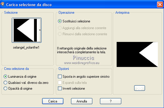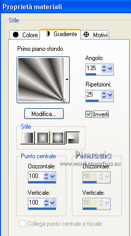 qui puoi trovare qualche risposta ai tuoi dubbi. Se l'argomento che ti interessa non è presente, ti prego di segnalarmelo. Questo tutorial è stato creato con PSP7 e tradotto con PSP X, ma può essere eseguito anche con le altre versioni di PSP. Dalla versione X4, il comando Immagine>Rifletti è stato sostituito con Immagine>Capovolgi in orizzontale, e il comando Immagine>Capovolgi con Immagine>Capovolgi in verticale. Nelle versioni X5 e X6, le funzioni sono state migliorate rendendo disponibile il menu Oggetti. Con la versione X7 sono tornati i comandi Immagine>Rifletti e Immagine>Capovolgi, ma con nuove funzioni. Vedi la scheda sull'argomento qui traduzione in francese qui le vostre versioni qui Occorrente: Materiale qui Il tube della donna by Guismo decos: by An.gel maschera: Narah tube farfalla: Exkizz_Papillons wordart: WAPack01_love_beszteri03 Filtri: in caso di dubbi, ricorda di consultare la mia sezione filtri qui Filters Unlimited 2 qui Visual Manipulation qui Unplugged Tools qui Carolaine and Sensibility - CS-LDots qui I filtri Visual Manipulation e Unplugged Tools si possono usare da soli o importati in Filters Unlimited (come fare vedi qui) Se un filtro fornito appare con questa icona ![]() in base ai tuoi colori non esitare a sperimentare le modalità di miscelatura e opacità più adatte Nelle ultime versioni di PSP non c'è il gradiente di primo piano/sfondo (Corel_06_029) Trovi i gradienti delle versioni precedenti qui Metti il pennello nella cartella Pennelli. Attenzione, il pennello è composto da due files che non devono essere separati. Vedi gli appunti sui pennelli qui Metti la selezione nella cartella Selezioni. Apri la maschera in PSP e minimizzala con il resto del materiale. 1. Scegli due colori dal tuo tube. Per l'esempio: colore di primo piano #34322c, colore di sfondo #e5e0dc. ![]() Passa il colore di primo piano a Gradiente di primo piano/sfondo, stile Radiale. ![]() 2. Apri una nuova immagine trasparente 900 x 550 pixels, e riempila con il gradiente.3. Regola>Sfocatura>Sfocatura gaussiana - raggio 25. ![]() 4. Effetti>Plugins>Filters Unlimited 2.0 - Visual Manipulation - Y-Mirror, con i settaggi standard. ![]() 5. Effetti>Plugins>Filters Unlimited 2.0 - Unplugged Tools - Round Button, con i settaggi standard. ![]() 6. Effetti>Effetti di immagine>Motivo unico, Fianco a fianco. ![]() 7. Effetti>Effetti di immagine>Motivo unico, con i settaggi standard. ![]() 8. Regola>Messa a fuoco>Metti a fuoco. 9. Selezione>Carica/Salva selezione>Carica selezione da disco. Cerca e carica la selezione selangel_yolanthe1. ![]() Selezione>Innalza selezione a livello. 10. Effetti>Plugins>Filters Unlimited 2.0 - Special Effects 1 - Shiver, con i settaggi standard. ![]() Regola>Messa a fuoco>Metti a fuoco. 11. Effetti>Plugins>Carolaine and Sensibility - CS-LDots. ![]() Selezione>Deseleziona. 12. Livelli>Nuovo livello raster. Passa il colore di primo piano a Colore. Riempi il livello con il colore scuro di primo piano #34322c.13. Livelli>Nuovo livello maschera>Da immagine. Apri il menu sotto la finestra di origine e vedrai la lista dei files aperti. Seleziona la maschera Narah_mask_0722, con i seguenti settaggi. ![]() Livelli>Unisci>Unisci gruppo. 14. Apri deco_yolanthe_angel e vai a Modifica>Copia. Torna al tuo lavoro e vai a Modifica>Incolla come nuovo livello. Effetti>Effetti di immagine>Scostamento. ![]() 15. Apri deco_yolanthe1_angel e vai a Modifica>Copia. Torna al tuo lavoro e vai a Modifica>Incolla come nuovo livello. 16. Apri il wordart WAPack01_love_beszteri03 e vai a Modifica>Copia. Torna al tuo lavoro e vai a Modifica>Incolla come nuovo livello. Immagine>Ridimensiona, al 18%, tutti i livelli non selezionato. Effetti>Effetti di immagine>Scostamento. ![]() Immagine>Immagine negativa (facoltativo, dipende dai tuoi colori). Cambia la modalità di miscelatura di questo livello in Luce netta. 17. Apri Exkizz_Papillons e copia il livello Papillons 1. Torna al tuo lavoro e vai a Modifica>Incolla come nuovo livello. Effetti>Effetti di immagine>Scostamento. ![]() 18. Attiva lo strumento Pennello ![]() Cerca e seleziona il pennello yolanthe. ![]() 19. Livelli>Nuovo livello raster. Applica il pennello in basso a destra cliccando con il tasto sinistro del mouse, per usare il colore scuro di primo piano. 20. Effetti>Effetti 3D>Sfalsa ombra (facoltativo). ![]() 21. Immagine>Aggiungi bordatura, 1 pixel, simmetriche, colore scuro #34322c. Immagine>Aggiungi bordatura, 10 pixels, simmetriche, colore bianco #ffffff. Immagine>Aggiungi bordatura, 10 pixels, simmetriche, con un colore qualsiasi. 22. Attiva lo strumento Bacchetta magica ![]() e clicca nell'ultimo bordo per selezionarlo. Riporta il colore di primo piano al gradiente iniziale. ![]() Riempi la selezione con il gradiente.![]() Selezione>Deseleziona. Immagine>Aggiungi bordatura, 30 pixels, simmetriche, colore bianco #ffffff. Immagine>Aggiungi bordatura, 1 pixel, simmetriche, colore scuro #34322c. 24. Apri il tube della donna - calguisnereide10092015 - e vai a Modifica>Copia. Torna al tuo lvaoro e vai a Modifica>Incolla come nuovo livello. Immagine>Ridimensiona, al 70%, tutti i livelli non selezionato. Sposta il tube a sinistra.25. Effetti>Effetti 3D>Sfalsa ombra. ![]() 26. Firma il tuo lavoro. Immagine>Ridimensiona, al 95%, o come preferisci, tutti i livelli selezionato. Salva in formato jpg. Il tube di questa versione è di Min@ ![]() ![]() Se hai problemi o dubbi, o trovi un link non funzionante, o anche soltanto per un saluto, scrivimi. 28 Febbraio 2016 |