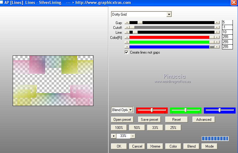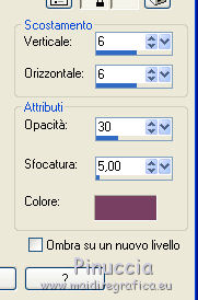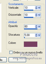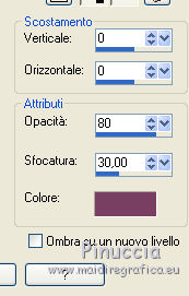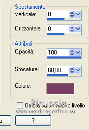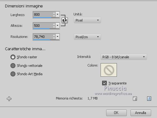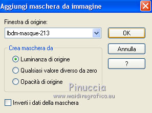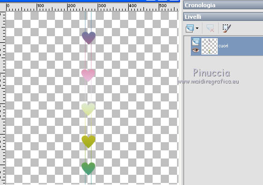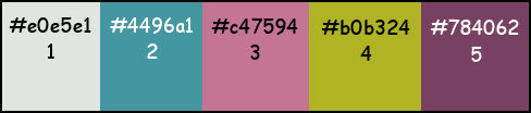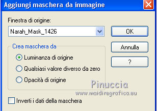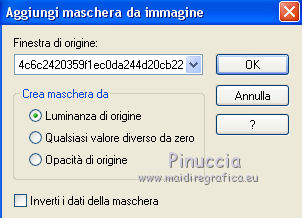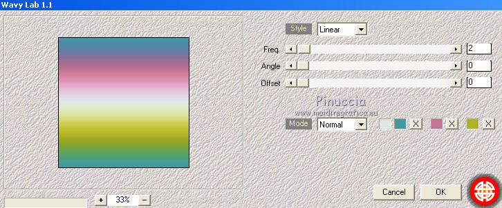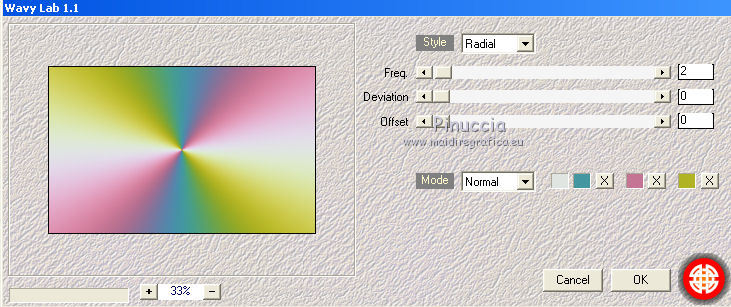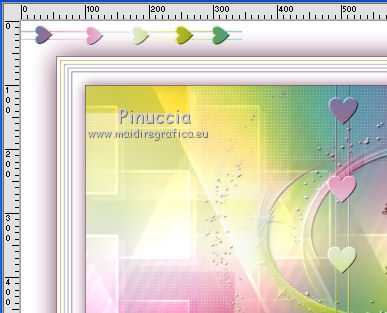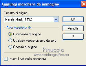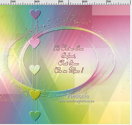 qui puoi trovare qualche risposta ai tuoi dubbi. Se l'argomento che ti interessa non è presente, ti prego di segnalarmelo. Questo tutorial è stato realizzato con Corel2019 e tradotto con PSPX, ma può essere realizzato anche con le altre versioni di PSP. Dalla versione X4, il comando Immagine>Rifletti è stato sostituito con Immagine>Capovolgi in orizzontale, e il comando Immagine>Capovolgi con Immagine>Capovolgi in verticale. Nelle versioni X5 e X6, le funzioni sono state migliorate rendendo disponibile il menu Oggetti. Con la nuova versione X7, sono tornati Rifletti>Capovolgi, ma con nuove varianti. Vedi la scheda sull'argomento qui Occorrente: Tubes a scelta Il resto del materiale qui Grazie per il tube Luz Cristina et per le maschere Narah e Mary LBDM (in questa pagina trovi i links ai siti dei creatori di tubes) Filtri: se hai problemi con i filtri, consulta la mia sezione filtri qui Filters Unlimited 2.0 qui Mehdi - Wavy Lab 1.1. qui Mura's Seamless - Emboss at Alpha qui Ap [Lines] - Lines SilverLining qui I filtri Mura's Seamless si possono usare da soli o importati in Filters Unlimited (come fare vedi qui) Se un filtro fornito appare con questa icona ![]() non esitare a cambiare modalità di miscelatura e opacità secondo i colori utilizzati. Metti il pennello nella cartella Pennelli. Attenzione, il pennello è composto da due files che non devono essere separati. Vedi gli appunti sui pennelli qui Apri le maschere in PSP e minimizzale con il resto del materiale. Colori utilizzati ![]() 1. Imposta il colore di primo piano con il colore 2 #4496a1, e il colore di sfondo con il colore 1 #e0e2e1. ![]() Apri una nuova immagine trasparente 800 x 500 pixels. ![]() Effetti>Plugins>Mehdi - Wavy Lab 1.1 Questo filtro crea gradienti con i colori della tua paletta: il primo è il colore di sfondo, il secondo quello di primo piano Cambia gli ultimi due colori creati dal filtro: il terzo con il colore 3 #c47594, il quarto con il colore 4 #b0b324. ![]() 2. Regola>Sfocatura>Sfocatura gaussiana - raggio 50 ![]() 3. Livelli>Duplica. Immagine>Rifletti. 4. Livelli>Nuovo livello maschera>Da immagine. Apri il menu sotto la finestra di origine e vedrai la lista dei files aperti. Seleziona la maschera Narah_Mask_1426. ![]() Livelli>Unisci>Unisci gruppo. Cambia la modalità di miscelatura di questo livello in Luminanza. 5. Effetti>Plugins>AP [Lines] - Lines SilverLining - Dotty Grid. ![]() Livelli>Unisci>Unisci visibile. Livelli>Duplica. Immagine>Rifletti. 6. Livelli>Nuovo livello maschera>Da immagine. Apri il menu sotto la finestra di origine e seleziona la maschera Narah_Mask_1492. ![]() Livelli>Unisci>Unisci gruppo. Cambia la modalità di miscelatura di questo livello in Indebolisci, e abbassa l'opacità al 40%. Livelli>Unisci>Unisci visibile. 7. Livelli>Duplica. Immagine>Rifletti. Livelli>Nuovo livello maschera>Da immagine. Apri il menu sotto la finestra di origine e seleziona la maschera Narah_Mask_1513. ![]() Livelli>Unisci>Unisci gruppo. Livelli>Duplica. Livelli>Unisci>Unisci giù. 8. Immagine>Ridimensiona, all'80%, tutti i livelli non selezionato. Regola>Messa a fuoco>Metti a fuoco. Effetti>Effetti di immagine>Scostamento. ![]() Effetti>Plugins>Mura's Seamless - Emboss at Alpha, con i settaggi standard. ![]() 9. Per precauzione, salva il lavoro in psp e minimizzalo per il momento. Apri una nuova immagine trasparente 564 x 564 pixels. ![]() Effetti>Plugins>Mehdi - Wavy Lab 1.1 - con i colori precedenti, Linear selezionato. ![]() 10. Livelli>Nuovo livello maschera>Da immagine. Apri il menu sotto la finestra di origine e seleziona la maschera 4c6c2420359f1ec0da244d20cb22536c. ![]() Livelli>Unisci>Unisci gruppo. Modifica>Copia, e minimizza l'immagine, che ti servirà ancora. Rinomina questo livello Cuori ![]() 11. Torna al tuo lavoro, minimizzato al punto 9, e vai a Modifica>Incolla come nuovo livello. Effetti>Effetti di immagine>Scostamento. ![]() Effetti>Plugins>Mura's Seamless - Emboss at Alpha, con i settaggi standard. ![]() 12. Imposta il colore di primo piano con il colore 5 #784062. ![]() Livelli>Nuovo livello raster. Attiva lo strumento Pennello ![]() cerca e seleziona il pennello "Le baiser Animabelle.PspBrush", dimensione 165 ![]() Applica il pennello a destra, cliccando con il tasto sinistro del mouse, per usare il colore di primo piano #784062. ![]() Se necessario, posiziona correttamente il pennello nell'ovale.Cambia la modalità di miscelatura di questo livello in Luminanza. Livelli>Duplica (non l'ho fatto per la mia seconda versione: troppo scuro). Effetti>Effetti 3D>Sfalsa ombra, colore 5 #784062. ![]() 13. Attiva il livello inferiore. Livelli>Duplica. Immagine>Rifletti. Livelli>Nuovo livello maschera>Da immagine. Apri il menu sotto la finestra di origine e seleziona la maschera lbdm-masque-213. ![]() Livelli>Unisci>Unisci gruppo. Cambia la modalità di miscelatura di questo livello in Indebolisci, e abbassa l'opacità al 40%. Effetti>Effetti 3D>Sfalsa ombra, colore 5 #784062. ![]() 14. Immagine>Aggiungi bordatura, 1 pixels, simmetriche, colore 5 #784062. Selezione>Seleziona tutto. Immagine>Aggiungi bordatura, 20 pixels, simmetriche, colore bianco. Effetti>Effetti 3D>Sfalsa ombra, colore 5 #784062. ![]() Selezione>Deseleziona. 15. Immagine>Aggiungi bordatura, 1 pixels, simmetriche, colore 5 #784062. Immagine>Aggiungi bordatura, 5 pixels, simmetriche, colore bianco. Immagine>Aggiungi bordatura, 1 pixels, simmetriche, colore 2 #4496a1. Immagine>Aggiungi bordatura, 5 pixels, simmetriche, colore bianco. Immagine>Aggiungi bordatura, 1 pixels, simmetriche, colore 3 #c47594. Immagine>Aggiungi bordatura, 5 pixels, simmetriche, colore bianco. Immagine>Aggiungi bordatura, 1 pixels, simmetriche, colore 4 #b0b324. Immagine>Aggiungi bordatura, 5 pixels, simmetriche, colore bianco. Immagine>Aggiungi bordatura, 1 pixels, simmetriche, colore 5 #784062. 16. Selezione>Seleziona tutto. Immagine>Aggiungi bordatura, 55 pixels, simmetriche, colore bianco. Effetti>Effetti 3D>Sfalsa ombra, colore 5 #784062.