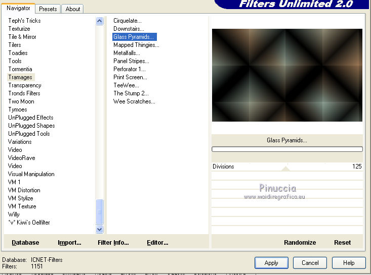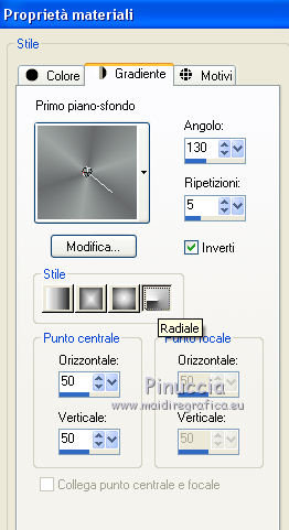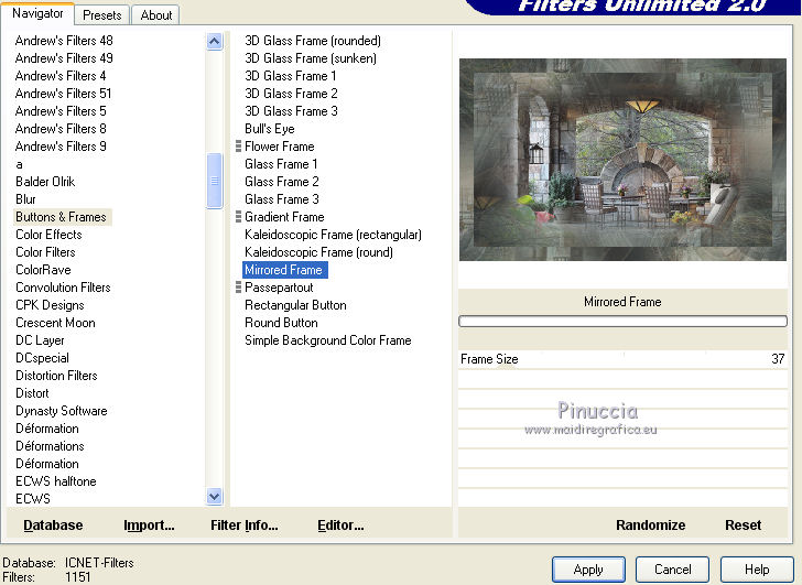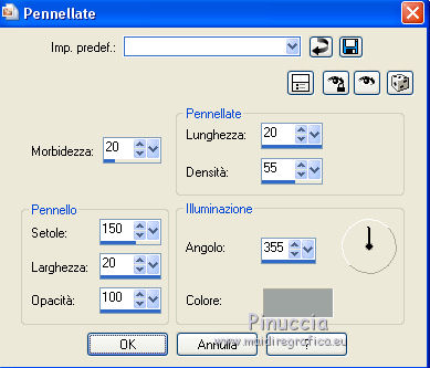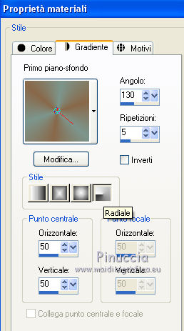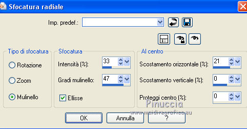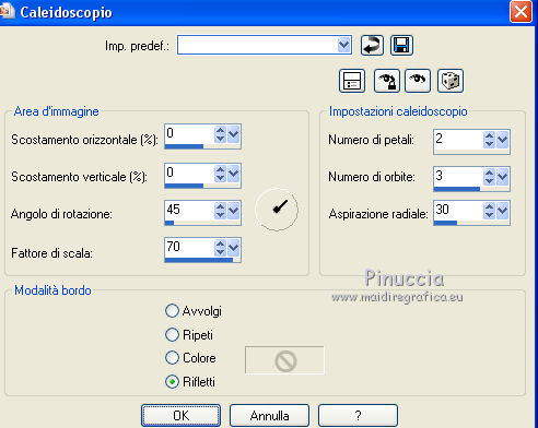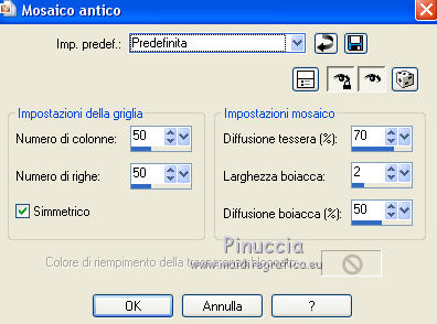 qui puoi trovare qualche risposta ai tuoi dubbi. Se l'argomento che ti interessa non è presente, ti prego di segnalarmelo. Questo tutorial è stato realizzato con Corel2019 e tradotto con PSPX, ma può essere realizzato anche con le altre versioni di PSP. Dalla versione X4, il comando Immagine>Rifletti è stato sostituito con Immagine>Capovolgi in orizzontale, e il comando Immagine>Capovolgi con Immagine>Capovolgi in verticale. Nelle versioni X5 e X6, le funzioni sono state migliorate rendendo disponibile il menu Oggetti. Con la nuova versione X7, sono tornati Rifletti>Capovolgi, ma con nuove varianti. Vedi la scheda sull'argomento qui Occorrente: Tubes a scelta Il resto del materiale qui Per i tubes non forniti grazie Colybrix. (in questa pagina trovi i links ai siti dei creatori di tubes) Filtri: se hai problemi con i filtri, consulta la mia sezione filtri qui Filters Unlimited 2.0 qui Tramages - Glass Pyramids, Pool Shadow qui I filtri Tramages si possono usare da soli o importati in Filters Unlimited (come fare vedi qui) Se un filtro fornito appare con questa icona ![]() non esitare a cambiare modalità di miscelatura e opacità secondo i colori utilizzati. Nelle ultime versioni di PSP non c'è il gradiente di primo piano/sfondo (Corel_06_029) Puoi usare i gradienti delle versioni precedenti. Trovi qui i gradienti Corel X. Apri le maschere in PSP e minimizzale con il resto del materiale. Colori utilizzati ![]() 1. Imposta il colore di primo piano con il colore 1 #9da4a2, e il colore di sfondo con il colore 3 #67696a. ![]() Passa il colore di primo piano a Gradiente di primo piano/sfondo, stile Radiale ![]() Apri una nuova immagine trasparente 800 x 500 pixels, e riempila con il gradiente.2. Regola>Sfocatura>Sfocatura gaussiana - raggio 30. ![]() 3. Effetti>Effetti tecniche di disegno>Pennellate, colore di primo piano (colore 1) #9da4a2 ![]() 4. Imposta il colore di primo piano con il colore 2 #7c968d, e il colore di sfondo con il colore 4 #896849. ![]() Passa il colore di primo piano a Gradiente di primo piano/sfondo, stile Radiale ![]() Livelli>Nuovo livello raster. Riempi il livello con il gradiente.Regola>Sfocatura>Sfocatura gaussiana - raggio 30. ![]() 5. Effetti>Plugins>Filters Unlimited 2.0 - Tramages - Glass Pyramids, con i settaggi standard. ![]() Cambia la modalità di miscelatura di questo livello in Sovrapponi, e abbassa l'opacità a 60. ![]() Regola>Sfocatura>Sfocatura gaussiana - raggio 20. ![]() 6. Imposta il colore di primo piano con il colore 1 #9da4a2. ![]() Livelli>Nuovo livello raster. Riempi il livello con il colore di primo piano.Livelli>Nuovo livello maschera>da immagine. Apri il menu sotto la finestra di origine e vedrai la lista dei files aperti. Seleziona la maschera 04_masque_Animabelle_page4 ![]() Livelli>Unisci>Unisci gruppo. Cambia la modalità di miscelatura di questo livello in Filtra, e abbassa l'opacità a 40. Effetti>Effetti di distorsione>Onda. ![]() 7. Livelli>Nuovo livello raster. Riempi il livello con il colore di sfondo (colore 4) #896849.Livelli>Nuovo livello maschera>da immagine. Apri il menu sotto la finestra di origine e vedrai la lista dei files aperti. Seleziona la maschera 01_masque_Animabelle_page4 ![]() Livelli>Unisci>Unisci gruppo. Cambia la modalità di miscelatura di questo livello in Filtra, e abbassa l'opacità a 30. ![]() Effetti>Effetti di bordo>Aumenta. 8. Livelli>Nuovo livello raster. Selezione>Seleziona tutto. Apri il tube del paesaggio (o altro, a tua scelta) e vai a Modifica>Copia. Torna al tuo lavoro e vai a Modifica>Incolla nella selezione. Selezione>Deseleziona. Effetti>Effetti di immagine>Motivo unico, con i settaggi standard. ![]() Cambia la modalità di miscelatura di questo livello in Sovrapponi, e abbassa l'opacità a 40. 9. Modifica>Incolla come nuovo livello (il misted precedente è sempre in memoria). Immagine>Ridimensiona, se e quanto necessario, tutti i livelli non selezionato. Livelli>Unisci>Unisci tutto. Effetti>Plugins>Filters Unlimited 2.0 - Buttons & Frames - Mirrored Frame, con i settaggi standard. ![]() 10. Selezione>Seleziona tutto. Selezione>Modifica>Contrai - 37 pixels. Effetti>Effetti 3D>Sfalsa ombra, colore nero. ![]() Selezione>Modifica>Seleziona bordature selezione. ![]() Effetti>Effetti 3D>Smusso a incasso. ![]() 11. Selezione>Seleziona tutto. Selezione>Modifica>Seleziona bordature selezione, con i settaggi precedenti. ![]() Effetti>Effetti 3D>Smusso a incasso, con i settaggi precedenti. ![]() 12. Selezione>Seleziona tutto. Immagine>Aggiungi bordatura, 70 pixels, simmetriche, colore di primo piano (colore 1) #9da4a2. Selezione>Inverti. Effetti>Effetti di riflesso>Caleidoscopio. ![]() Regola>Sfocatura>Sfocatura radiale. ![]() 13. Effetti>Plugins>Tramages - Pool Shadow, con i settaggi standard. ![]() Selezione>Innalza selezione a livello. 14. Effetti>Effetti di trama>Mosaico antico, con i settaggi standard. ![]() Abbassa l'opacità di questo livello al 60%. Livelli>Unisci>Unisci giù. Selezione>Inverti. Effetti>Effetti 3D>Sfalsa ombra, colore nero. ![]() Selezione>Deseleziona. 15. Apri il tube del personaggio e vai a Modifica>Copia. Torna al tuo lavoro e vai a Modifica>Incolla come nuovo livello. Immagine>Ridimensiona, se e quanto necessario, tutti i livelli non selezionato. Posiziona correttamente il tube.Effetti>Effetti 3D>Sfalsa ombra, a scelta. Immagine>Aggiungi bordatura, 1 pixel, simmetriche, colore nero. Immagine>Ridimensiona, 900 pixels di larghezza, tutti i livelli selezionato. 16. Firma il tuo lavoro su un nuovo livello. Livelli>Unisci>Unisci tutto e salva in formato jpg. Versione con tubes di Luz Cristina ![]() ![]() Le vostre versioni. Grazie ![]() Antonietta ![]() Puoi scrivermi se hai problemi o dubbi, o trovi un link che non funziona, o soltanto per un saluto. 23 Gennaio 2021 |