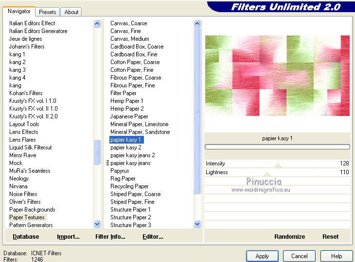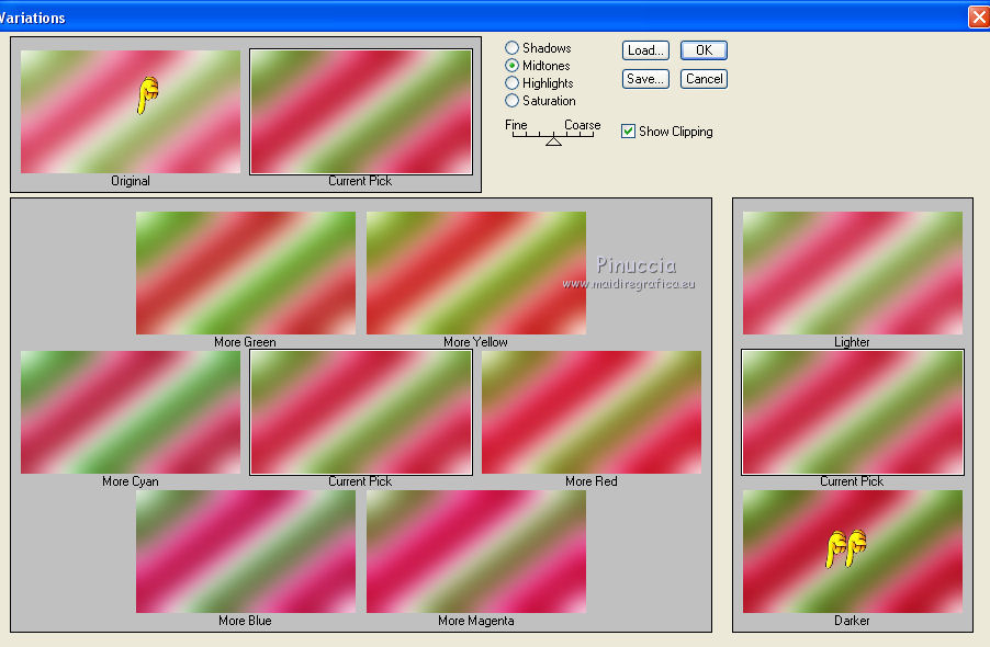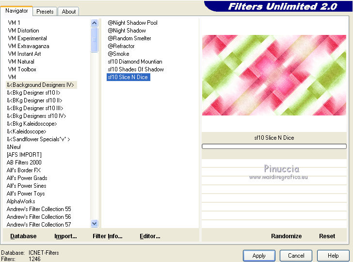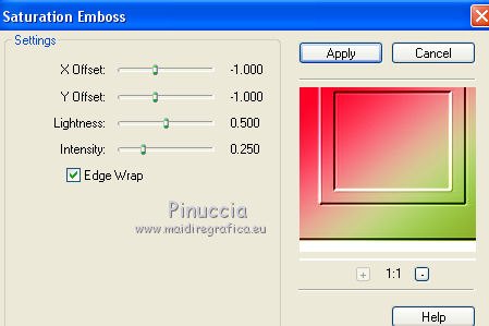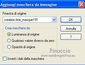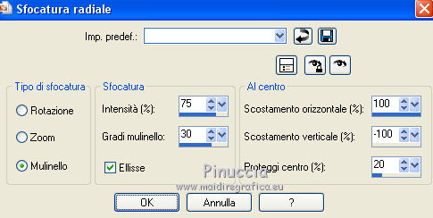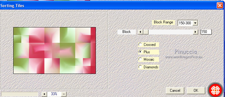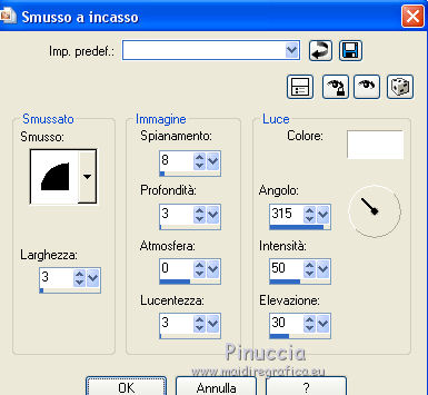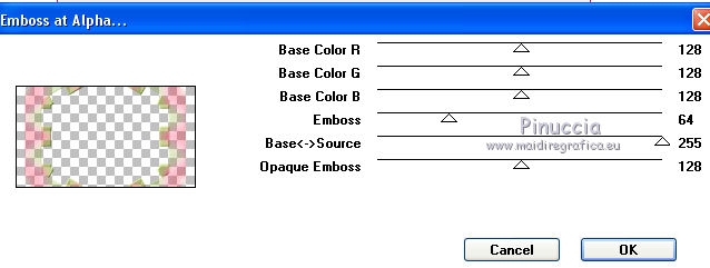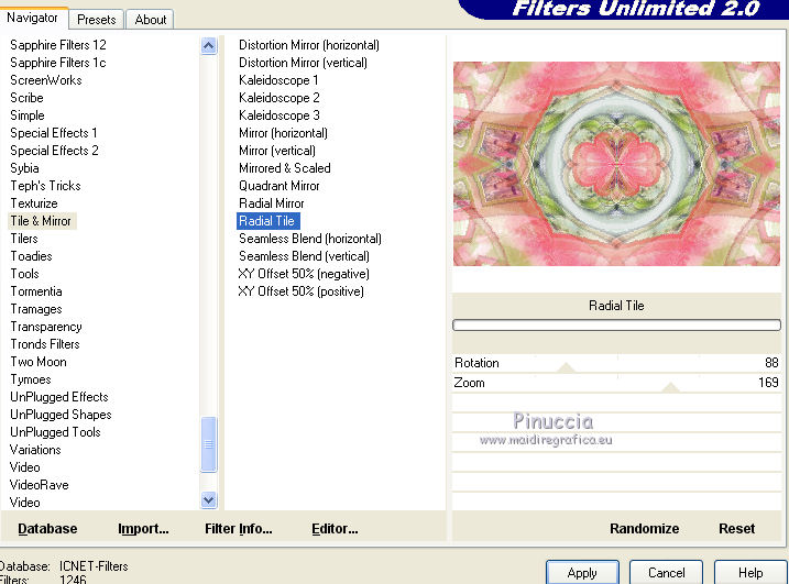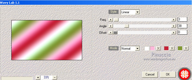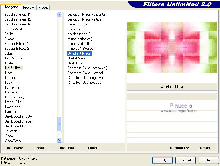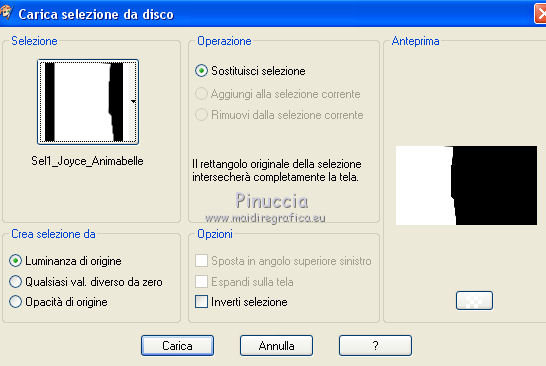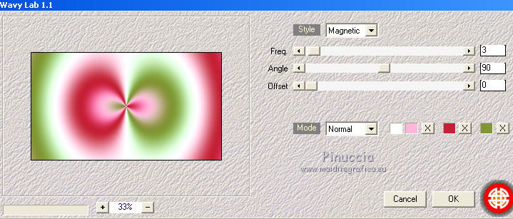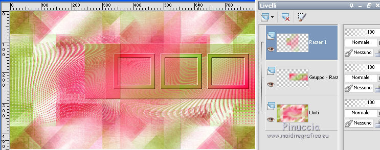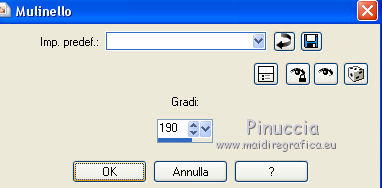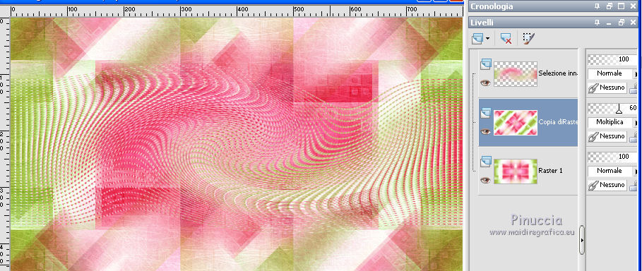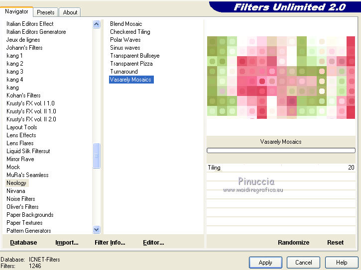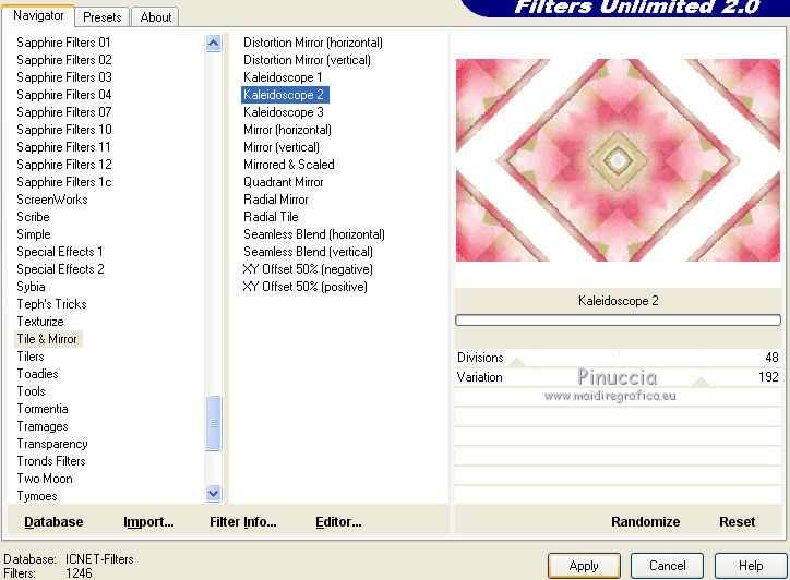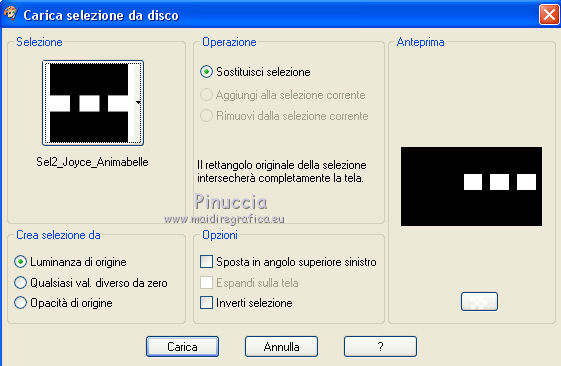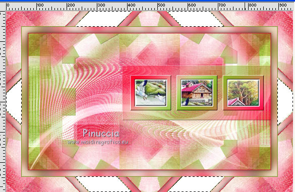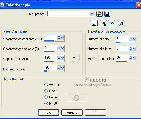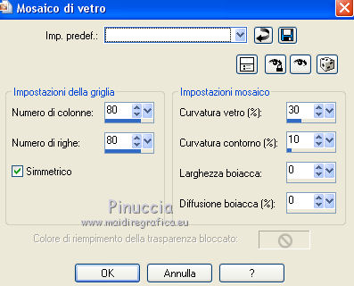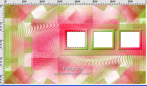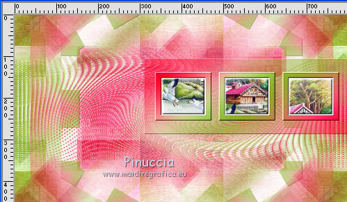 qui puoi trovare qualche risposta ai tuoi dubbi. Se l'argomento che ti interessa non è presente, ti prego di segnalarmelo. Questo tutorial è stato realizzato con Corel2020 e tradotto con PSPX, ma può essere realizzato anche con le altre versioni di PSP. Dalla versione X4, il comando Immagine>Rifletti è stato sostituito con Immagine>Capovolgi in orizzontale, e il comando Immagine>Capovolgi con Immagine>Capovolgi in verticale. Nelle versioni X5 e X6, le funzioni sono state migliorate rendendo disponibile il menu Oggetti. Con la nuova versione X7, sono tornati Rifletti>Capovolgi, ma con nuove varianti. Vedi la scheda sull'argomento qui Occorrente: Materiale qui Per tubes e maschere grazie Tine. Il resto del materiale è di Animabelle. (in questa pagina trovi i links ai siti dei creatori di tubes) Filtri: se hai problemi con i filtri, consulta la mia sezione filtri qui Filters Unlimited 2.0 qui &<Background Designers IV> - sf10 Slice N Dice (da importare in Unlimited) qui Mehdi - Wavy Lab 1.1. qui Mehdi - Sorting Tiles qui Neology - Vasarely Mosaic qui Mura's Seamless - Emboss at Alpha qui FM Tile Tools - Saturation Emboss qui Facoltativo Adjust - Variations qui I filtri Mura's Seamless e Neology si possono usare da soli o importati in Filters Unlimited (come fare vedi qui) Se un filtro fornito appare con questa icona ![]() non esitare a cambiare modalità di miscelatura e opacità secondo i colori utilizzati. Metti il preset Emboss 3 nella cartella Impostazioni predefinite. Metti le selezioni nella cartella Selezioni. Apri le maschere in PSP e minimizzale con il resto del materiale. Colori utilizzati ![]() 1. Apri una nuova immagine trasparente 800 x 450 pixels ![]() 2. Imposta il colore di primo piano con il colore #ffb7d9, e il colore di sfondo con il colore bianco #ffffff. ![]() 3. Effetti>Plugins>Mehdi - Wavy Lab 1.1 Questo filtro lavora con i colori della paletta; il primo è il colore di sfondo, il secondo quello di primo piano. Cambia gli ultimi due colori creati dal filtro: il terzo con il colore #c42136, il quarto con #809733. ![]() Regola>Sfocatura>Sfocatura gaussiana - raggio 30 ![]() 4. Effetti>Plugins>Mehdi - Sorting Tiles ![]() Effetti>Plugins>Filters Unlimited 2.0 - Paper Textures - papier kasy 1, con i settaggi standard se non lo trovi nel tuo Unlimited, importa l'effetto fornito nel materiale ![]() 5. Livelli>Duplica. Effetti>Plugins>Filters Unlimited 2.0 - Neology - Vasarely Mosaics, con i settaggi standard ![]() Cambia la modalità di miscelatura di questo livello in Luce diffusa. Effetti>Filtro definito dall'utente - seleziona il preset Emboss 3 e ok. ![]() Livelli>Unisci>Unisci giù. 6. Attiva lo strumento Selezione ![]() (non importa il tipo di selezione impostato, perchè con la selezione personalizzata si ottiene sempre un rettangolo) clicca sull'icona Selezione personalizzata ![]() e imposta i seguenti settaggi. ![]() Selezione>Innalza selezione a livello. Selezione>Deseleziona. Effetti>Effetti di trama>Mosaico di vetro ![]() 7. Effetti>Effetti di distorsione>Mulinello. ![]() 8. Attiva il livello inferiore. Effetti>Plugins>Filters Unlimited 2.0 - Tile & Mirror - Quadrant Mirror ![]() 9. Livelli>Duplica. Effetti>Plugins>Filters Unlimited 2.0 - &<Background Designers IV> - sf10 Slice N Dice ![]() Cambia la modalità di miscelatura di questo livello in Moltiplica, e abbassa l'opacità al 60%. ![]() Livelli>Unisci>Unisci visibile. 10. Livelli>Nuovo livello raster. Effetti>Plugins>Mehdi - Wavy Lab 1.1 ![]() Regola>Sfocatura>Sfocatura gaussiana - raggio 50. ![]() 11. Effetti>Plugins>Adjust - Variations un clic su Original per annullare eventuali precedenti settaggi memorizzati dal filtro, due clic su Darker e ok. (salta questo effetto se i tuoi colori sono già scuri) ![]() 12. Livelli>Nuovo livello maschera>Da immagine. Apri il menu sotto la finestra di origine e vedrai la lista dei files aperti. Seleziona la maschera creation.tine_masque191 ![]() Livelli>Unisci>Unisci gruppo. Effetti>Plugins>MuR'as Seamless - Emboss at Alpha, con i settaggi standard ![]() Ripeti il Filtro una seconda volta. 13. Effetti>Plugins>FM Tile Tools - Saturation Emboss, con i settaggi standard ![]() Selezione>Carica/Salva selezione>Carica selezione da disco. Cerca e carica la selezione Sel1_Joyce_Animabelle ![]() Modifica>Taglia (per tenere in memoria la selezione) Selezione>Deseleziona. Modifica>Incolla come nuovo livello. Lascialo come sta, è al suo posto. ![]() 14. Effetti>Effetti di riflesso>Caleidoscopio. ![]() Effetti>Plugins>MuR'as Seamless - Emboss at Alpha, con i settaggi standard ![]() Livelli>Disponi>Sposta giù. 15. Attiva nuovamente il livello superiore della maschera. Selezione>Carica/Salva selezione>Carica selezione da disco. Cerca e carica la selezione Sel2_Joyce_Animabelle ![]() Premi sulla tastiera il tasto CANC ![]() Mantieni selezionato. Livelli>Nuovo livello raster. Riempi la selezione con il colore bianco.Selezione>Deseleziona. 16. Attiva lo strumento Bacchetta magica , con i seguenti settaggi:![]() Clicca sul quadro bianco a sinistra per selezionarlo. ![]() Selezione>Modifica>Contrai - 2 pixels. Modifica>Taglia (per tenere in memoria la selezione). Modifica>Incolla come nuova immagine e continua su questa immagine. 17. Apri il misted di Tine misted_paysage14_tine_03.2020-70 e vai a Modifica>Copia. Torna al piccolo quadro bianco e vai a Modifica>Incolla come nuovo livello. Immagine>Ridimensiona, circa al 35%, tutti i livelli non selezionato. Posiziona il tube sulla selezione,con la parte che vuoi rimanga visibile; per il mio esempio. ![]() Regola>Messa a fuoco>Metti a fuoco. Livelli>Unisci>Unisci tutto. 18. Modifica>Copia. Torna al tuo lavoro e vai a Modifica>Incolla nella selezione. Effetti>Effetti 3D>Smusso a incasso. ![]() Selezione>Deseleziona. 19. Ripeti i passaggi per il secondo quadro bianco: Seleziona il quadro con la bacchetta magica ![]() Selezione>Modifica>Contrai - 2 pixels. Modifica>Copia. Modifica>Incolla come nuova immagine e continua su questa immagine.