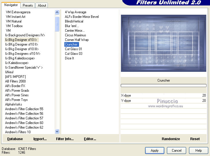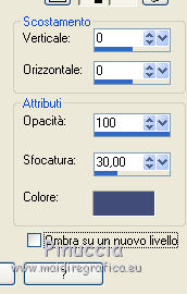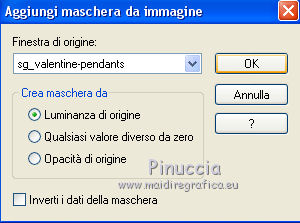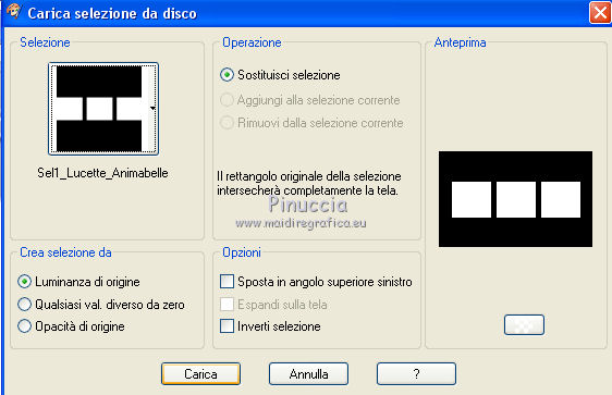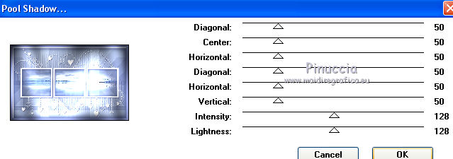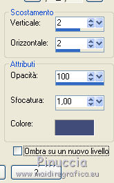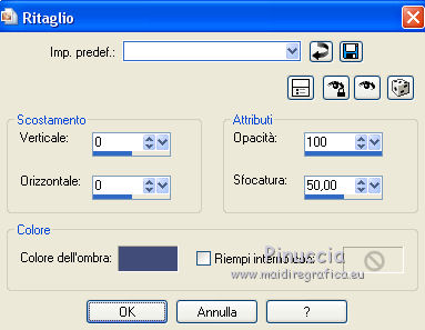 qui puoi trovare qualche risposta ai tuoi dubbi. Se l'argomento che ti interessa non è presente, ti prego di segnalarmelo. Questo tutorial è stato realizzato con Corel2020 e tradotto con PSPX, ma può essere realizzato anche con le altre versioni di PSP. Dalla versione X4, il comando Immagine>Rifletti è stato sostituito con Immagine>Capovolgi in orizzontale, e il comando Immagine>Capovolgi con Immagine>Capovolgi in verticale. Nelle versioni X5 e X6, le funzioni sono state migliorate rendendo disponibile il menu Oggetti. Con la nuova versione X7, sono tornati Rifletti>Capovolgi, ma con nuove varianti. Vedi la scheda sull'argomento qui Occorrente: Materiale qui Per le maschere grazie Beatrice e Sg. Il resto del materiale è di Animabelle. (in questa pagina trovi i links ai siti dei creatori di tubes) Filtri: se hai problemi con i filtri, consulta la mia sezione filtri qui Filters Unlimited 2.0 qui &<Bkg Designer sf10I> - Cruncher (da importare in Unlimited) qui Tramages - Pool Shadow qui I filtri Tramages si possono usare da soli o importati in Filters Unlimited (come fare vedi qui) Se un filtro fornito appare con questa icona ![]() non esitare a cambiare modalità di miscelatura e opacità secondo i colori utilizzati. Metti la selezione nella cartella Selezioni. Apri le maschere in PSP e minimizzale con il resto del materiale. Colori utilizzati ![]() 1. Imposta il colore di primo piano con #d0e1f8, e il colore di sfondo con #424c78. ![]() 2. Apri una nuova immagine trasparente 800 x 500 pixels. Riempi l'immagine trasparente con il colore di primo piano #d0e1f8.Livelli>Nuovo livello raster. Riempi il livello con il colore di sfondo #424c78.Livelli>Nuovo livello maschera>Da immagine. Apri il menu sotto la finestra di origine e vedrai la lista dei files aperti. Seleziona la maschera Mask_15_GB_2019 ![]() Livelli>Unisci>Unisci gruppo. Effetti>Effetti di riflesso>Specchio rotante. ![]() 4. Imposta il colore di primo piano con il colore bianco #ffffff. Livelli>Nuovo livello raster. Riempi il livello con il colore bianco.Livelli>Nuovo livello maschera>Da immagine. Apri il menu sotto la finestra di origine e seleziona la maschera sg_valentine-pendants. ![]() Livelli>Unisci>Unisci gruppo. Effetti>Effetti 3D>Sfalsa ombra, colore di sfondo #424c78. ![]() 5. Livelli>Nuovo livello raster. Selezione>Carica/Salva selezione>Carica selezione da disco. Cerca e carica la selezione Sel1_Lucette_Animabelle ![]() Apri il misted Misted1_Lucette_Animabelle e vai a Modifica>Copia. Torna al tuo lavoro e vai a Modifica>Incolla nella selezione. Ripeti Modifica>Incolla nella selezione. ![]() Regola>Messa a fuoco>Metti a fuoco. Selezione>Inverti. Effetti>Effetti 3D>Sfalsa ombra, colore di sfondo #424c78. ![]() Selezione>Deseleziona. Livelli>Unisci>Unisci tutto. 6. Livelli>Nuovo livello raster. Selezione>Seleziona tutto. Effetti>Effetti 3D>Ritaglio, colore di sfondo #424c78 ![]() Selezione>Deseleziona. Livelli>Duplica. 7. Immagine>Aggiungi bordatura, 1 pixel, simmetriche, colore bianco. Selezione>Seleziona tutto. Immagine>Aggiungi bordatura, 15 pixels, simmetriche, colore 2 #7983b4. Selezione>Inverti. Effetti>Plugins>Tramages - Pool Shadow, con i settaggi standard. ![]() Selezione>Deseleziona. 8. Immagine>Aggiungi bordatura, 1 pixel, simmetriche, colore bianco. Selezione>Seleziona tutto. Immagine>Aggiungi bordatura, 40 pixels, simmetriche, colore di sfondo #424c78. Selezione>Inverti. Effetti>Plugins>Filters Unlimited 2.0 - &<Bkg Designer sf10I> - Cruncher, con i settaggi standard. ![]() Regola>Messa a fuoco>Metti a fuoco. Selezione>Inverti. Effetti>Effetti 3D>Sfalsa ombra, colore nero. ![]() Selezione>Deseleziona. 9. Immagine>Aggiungi bordatura, 1 pixel, simmetriche, colore bianco. Apri il tube 179_Femmes_Page7_Animabelle, cancella la firma e vai a Modifica>Copia. Torna al tuo lavoro e vai a Modifica>Incolla come nuovo livello. Immagine>Ridimensiona, al 70%, tutti i livelli non selezionato. Posiziona correttamente il tube.Effetti>Effetti 3D>Sfalsa ombra, a scelta. Immagine>Aggiungi bordatura, 2 pixels, simmetriche, colore di sfondo. Immagine>Ridimensiona, 900 pixels di larghezza, tutti i livelli selezionato. 10. Firma il tuo lavoro su un nuovo livello. Livelli>Unisci>Unisci tutto e salva in formato jpg. Versione con tube di Lady Valella ![]() ![]() ![]() Olimpia ![]() Puoi scrivermi se hai problemi o dubbi, o trovi un link che non funziona, o soltanto per un saluto. 14 Dicembre 2020 |
