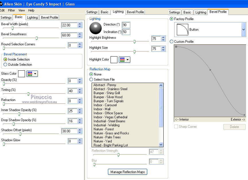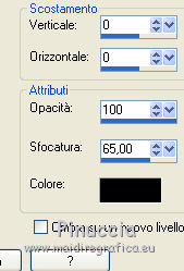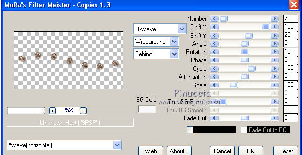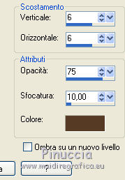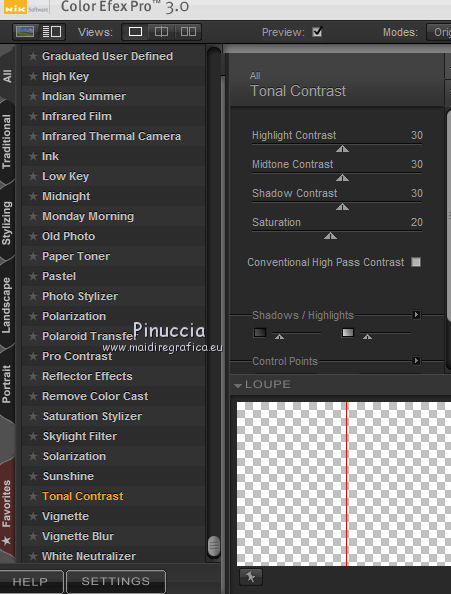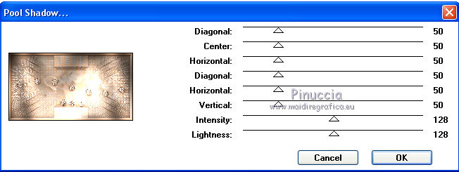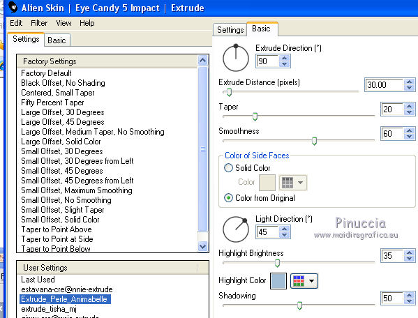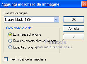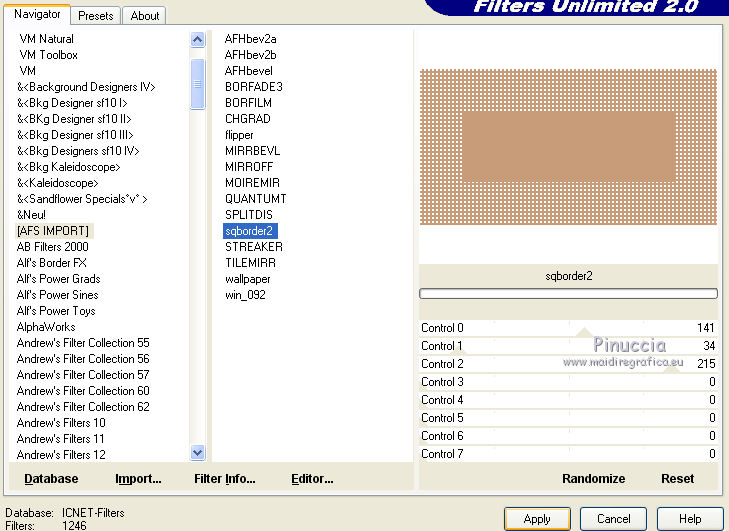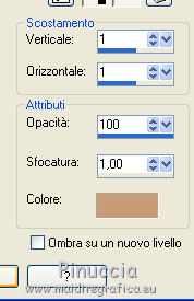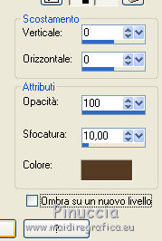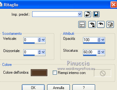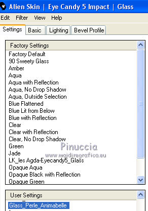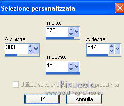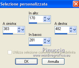 qui puoi trovare qualche risposta ai tuoi dubbi. Se l'argomento che ti interessa non è presente, ti prego di segnalarmelo. Questo tutorial è stato realizzato con Corel2019 e tradotto con PSPX, ma può essere realizzato anche con le altre versioni di PSP. Dalla versione X4, il comando Immagine>Rifletti è stato sostituito con Immagine>Capovolgi in orizzontale, e il comando Immagine>Capovolgi con Immagine>Capovolgi in verticale. Nelle versioni X5 e X6, le funzioni sono state migliorate rendendo disponibile il menu Oggetti. Con la nuova versione X7, sono tornati Rifletti>Capovolgi, ma con nuove varianti. Vedi la scheda sull'argomento qui Occorrente: Materiale qui Per le maschere grazie Narah Il resto del materiale è di Animabelle. (in questa pagina trovi i links ai siti dei creatori di tubes) Filtri: se hai problemi con i filtri, consulta la mia sezione filtri qui Filters Unlimited 2.0 qui AFS IMPORT - sqborder2 qui VanDerLee - Unplugged X qui Tramages - Pool Shadow qui Nik Software - Color Efex qui Mura's Meister - Copies qui Alien skin Eye Candy 5 Impact - Glass, Extrude qui I filtri AFS IMPORT e Tramages si possono usare da soli o importati in Filters Unlimited (come fare vedi qui) Se un filtro fornito appare con questa icona ![]() non esitare a cambiare modalità di miscelatura e opacità secondo i colori utilizzati. Metti i preset Cliccando sul file una o due volte (a seconda delle tue impostazioni), automaticamente il preset si installerà nella cartella corretta. perchè uno o due clic vedi qui Apri le maschere in PSP e minimizzale con il resto del materiale. Colori utilizzati ![]() 1. Apri una nuova immagine trasparente 800 x 450 pixels 2. Selezione>Seleziona tutto. Apri l'immagine "image de base" e vai a Modifica>Copia. Torna al tuo lavoro e vai a Modifica>Incolla nella selezione. Selezione>Deseleziona. 3. Colorizza l'immagine in base ai tuoi colori. 4. Regola>Sfocatura>Sfocatura radiale. ![]() Effetti>Effetti di bordo>Aumenta di più. Livelli>Duplica. Cambia la modalità di miscelatura di questo livello in Moltiplica (facoltativo). Livelli>Unisci>Unisci giù. Effetti>Effetti di immagine>Motivo unico, con i settaggi standard. ![]() 5. Imposta il colore di primo piano con il colore 3 #c89b79. Livelli>Nuovo livello raster. Riempi il livello con il colore 3 #c89b79.Effetti>Plugins>Filters Unlimited 2.0 - [AFS IMPORT] - sqborder2, con i settaggi standard ![]() Di nuovo Effetti>Plugins>Filters Unlimited 2.0 - [AFS IMPORT] - sqborder2, con i seguenti settaggi ![]() 6. Attiva lo strumento Selezione ![]() (non importa il tipo di selezione impostato, perchè con la selezione personalizzata si ottiene sempre un rettangolo) clicca sull'icona Selezione personalizzata ![]() e imposta i seguenti settaggi. ![]() Premi sulla tastiera il tasto CANC ![]() Selezione>Deseleziona. Effetti>Effetti 3D>Sfalsa ombra, colore nero. ![]() Effetti>Effetti di immagine>Motivo unico, con i settaggi precedenti. ![]() 7. Effetti>Plugins>VanDerLee - UnPlugged-X - Defocus ![]() Effetti>Effetti di immagine>Motivo unico, con i settaggi precedenti. ![]() Effetti>Effetti 3D>Sfalsa ombra, colore di primo piano (colore 3) #c89b79. ![]() 8. Imposta il colore di primo piano con il colore #f8f8f8 Livelli>Nuovo livello raster. Riempi il livello con il colore di sfondo #f8f8f8.Livelli>Nuovo livello maschera>Da immagine. Apri il menu sotto la finestra di origine e vedrai la lista dei files aperti. Seleziona la maschera Narah_Mask_1384 ![]() Livelli>Unisci>Unisci gruppo. Effetti>Effetti 3D>Sfalsa ombra, colore 4 #583a24. ![]() 9. Imposta il colore di primo piano con il colore 4 #583a24. Livelli>Nuovo livello raster. Riempi il livello con il colore di primo piano #583a24.Livelli>Nuovo livello maschera>Da immagine. Apri il menu sotto la finestra di origine e seleziona la maschera Narah_Mask_1469 ![]() Livelli>Unisci>Unisci gruppo. Livelli>Duplica. Immagine>Rifletti. Livelli>Unisci>Unisci visibile. 10. Selezione personalizzata ![]() ![]() Selezione>Innalza selezione a livello. Regola>Sfocatura>Sfocatura. Selezione>Deseleziona. Effetti>Plugins>Alien Skin Eye Candy 5 Impact - Extrude seleziona il preset Extrude_Perle_Animabelle e ok. ![]() Effetti>Effetti 3D>Sfalsa ombra, colore di primo piano (colore 4) #583a24. ![]() 11. Livelli>Duplica. Immagine>Capovolgi. Livelli>Unisci>Unisci giù. Cambia la modalità di miscelatura di questo livello in Luminanza (esistente). 12. Attiva il livello inferiore. Livelli>Duplica. Effetti>Effetti geometrici>Cerchio. ![]() Immagine>Ridimensiona, al 10%, tutti i livelli non selezionato. Regola>Messa a fuoco>Metti a fuoco. Effetti>Plugins>Alien Skin Eye Candy 5 Impact - Glass seleziona il preset Glass_Perle_Animabelle e ok. ![]() Questi i settaggi, in caso di problemi con il preset ![]() 13. Effetti>Plugins>Nik Software - Color Efex Pro 3.0 Complete Tonal Contrast, con i settaggi standard ![]() Ripeti l'Effetto una seconda volta. Effetti>Effetti 3D>Sfalsa ombra, colore di primo piano (colore 4) #583a24. ![]() Livelli>Disponi>Porta in alto. 14. Effetti>Plugins>MuRa's Meister - Copies ![]() Selezione personalizzata ![]() ![]() Selezione>Innalza selezione a livello. Selezione>Deseleziona. 15. Attiva lo strumento Puntatore ![]() e imposta Posizione X: 331,00 e Posizione Y: 307,00 ![]() 16. Livelli>Duplica. Immagine>Ridimensiona, all'85%, tutti i livelli non selezionato. Imposta Posizione X: 400,00 e Posizione Y: 316,00. ![]() 17. Di nuovo Livelli>Duplica. Immagine>Ridimensiona, all'85%, tutti i livelli non selezionato. Imposta Posizione X: 470,00 e Posizione Y: 327,00. ![]() Livelli>Unisci>Unisci giù - 2 volte. Regola>Messa a fuoco>Metti a fuoco. 18. Attiva il livello inferiore. Apri il misted Misted_Perle_Animabelle e vai a Modifica>Copia. Torna al tuo lavoro e vai a Modifica>Incolla come nuovo livello. Cambia la modalità di miscelatura di questo livello in Luminanza o Luminanza (esistente) Regola>Messa a fuoco>Metti a fuoco. Livelli>Unisci>Unisci tutto. 19. Livelli>Nuovo livello raster. Selezione>Selez