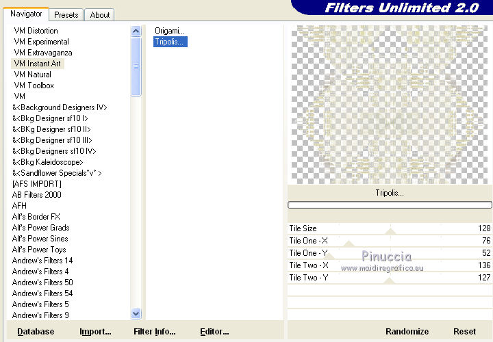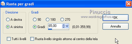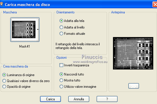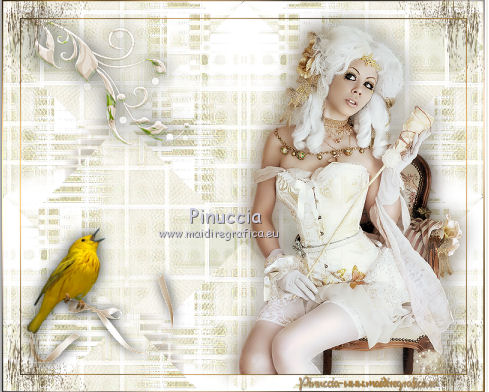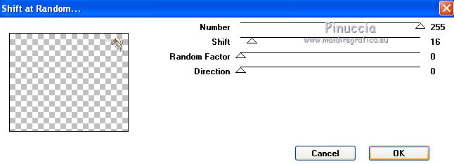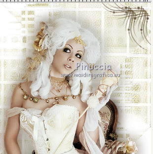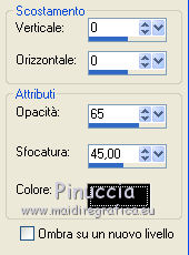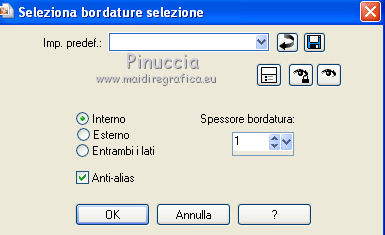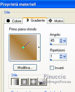 qui puoi trovare qualche risposta ai tuoi dubbi. Se l'argomento che ti interessa non è presente, ti prego di segnalarmelo. Occorrente: Materiale qui Filtri: se hai problemi con i filtri, ricorda di consultare la mia sezione Filtri qui Filters Unlimited 2.0 qui VM Instant Art - Tripolis qui Mura's Seamless - Shift at random qui Graphics Plus - Cross Shadow qui Animation Shop qui ![]() Metti la maschera nella cartella Maschere. Imposta il colore di primo piano con #cac3c1, e il colore di sfondo con #ab7b34. 1. Apri una nuova immagine bianca 800 x 650 pixels. 2. Apri "fall" e vai a Modifica>Copia. Torna al tuo lavoro e vai a Modifica>Incolla come nuovo livello. Immagine>Ridimensiona, al 150%, tutti i livelli non selezionato. Livelli>Carica/Salva maschera>Carica maschera da disco. Cerca e carica la maschera mask41. ![]() Livelli>Unisci>Unisci gruppo. Effetti>Effetti di bordo>Aumenta. Effetti>Plugins>Filters Unlimited 2.0 - VM Instant Art - Tripolis, con i settaggi standard. ![]() Effetti>Effetti di immagine>Motivo unico, con i settaggi standard. ![]() Livelli>Duplica. Abbassa l'opacità di questo livello al 70%. Livelli>Unisci>Unisci visibile. 3. Apri il tube della donna e vai a Modifica>Copia. Torna al tuo lavoro e vai a Modifica>Incolla come nuovo livello. Immagine>Ridimensiona, 1 volta all'80% e 1 volta all'88%, tutti i livelli non selezionato. Sposta il tube a destra,non troppo vicino al bordo. Livelli>Duplica, e attiva il livello sottostante dell'originale. Regola>Sfocatura>Sfocatura gaussiana - raggio 12. ![]() Attiva il livello superiore. Livelli>Unisci>Unisci giù. Effetti>Effetti 3D>Sfalsa ombra. ![]() Regola>Messa a fuoco>Metti a fuoco. 4. Apri doodle1 e vai a Modifica>Copia. Torna al tuo lavoro e vai a Modifica>Incolla come nuovo livello. Spostalo nell'angolo in alto a sinistra, un po' distante dal bordo.Effetti>Effetti 3D>Sfalsa ombra. ![]() Regola>Messa a fuoco>Metti a fuoco. 5. Apri purple dream e vai a Modifica>Copia. Torna al tuo lavoro e vai a Modifica>Incolla come nuovo livello. Immagine>Ridimensiona, al 50%, tutti i livelli non selezionato. Spostalo in basso a sinistra.Effetti>Effetti 3D>Sfalsa ombra. ![]() Regola>Messa a fuoco>Metti a fuoco. 6. Apri ld-nailstube e vai a Modifica>Copia. Torna al tuo lavoro e vai a Modifica>Incolla come nuovo livello. Livelli>Duplica. Livelli>Unisci>Unisci giù. Immagine>Ridimensiona, al 60%, tutti i livelli non selezionato. Immagine>Ruota per gradi - 65 gradi a sinistra. ![]() Spostalo nell'angolo in alto a destra, un po' distante dal bordo.![]() Effetti>Plugins>Mura's Seamless - Shift at random, con i settaggi standard. ![]() Livelli>Duplica. Immagine>Rifletti. Livelli>Unisci>Unisci giù. Livelli>Duplica. Immagine>Capovolgi. Livelli>Unisci>Unisci giù. 7. Apri il tube con l'uccello e vai a Modifica>Copia. Torna al tuo lavoro e vai a Modifica>Incolla come nuovo livello. Spostalo sul nastro.8. Immagine>Dimensioni tela. ![]() Livelli>Nuovo livello raster. Passa il colore di primo piano a Gradiente, stile lineare: ![]() Riempi il livello con il gradiente.Effetti>Plugins>Graphics Plus - cross Shadow, con i settaggi standard. ![]() Livelli>Disponi>Porta sotto. 9. Attiva il livello superiore. Livelli>Nuovo livello raster. Selezione>Seleziona tutto. Selezione>Modifica>Contrai - 30 pixels. Selezione>Modifica>Seleziona bordature selezione. ![]() Riempi con il colore di sfondo.Effetti>Plugins>Graphics Plus - Cross Shadow, con i settaggi standard. Selezione>Deseleziona. Attiva lo strumento Selezione , rettangolo,attiva il livello del tube della donna e seleziona la parte del tube sul bordo. ![]() Premi sulla tastiera il tasto CANC. Selezione>Deseleziona. 10. Se vuoi, scrivi un testo, e aggiungi il tuo nome e/o il tuo watermark su un nuovo livello. Controlla che tutti i tubes siano correttamente posizionati. Puoi ancora spostarli per sistemarli meglio. ![]() 11. Chiudi i due livelli superiori, e attiva il livello sottostante. Livelli>Unisci>Unisci visibile. Chiudi questo livello e attiva uno dei livelli visibili. Livelli>Unisci>Unisci visibile. 12. E avrai 2 livelli. Attiva il livello inferiore. ![]() Modifica>Copia. Apri Animation Shop e vai a Modifica>Incolla>Incolla come nuova animazione. Modifica>Duplica e ripeti 2 volte, per avere 5 fotogrammi. Clicca sul primo fotogramma per selezionarlo e vai a Modifica>Seleziona tutto. Apri il tube anime_blad, anche questo composto da 5 fotogrammi. Modifica>Seleziona tutto. Modifica>Copia. Attiva il tuo lavoro e vai a Modifica>Incolla>Incolla nel fotogramma selezionato. Posiziona la foglia sul nastro, tenendo presente che dopo dovrai appoggiarvi l'uccello. 13. Apri Anime-Star. Modifica>Seleziona tutto. Modifica>Copia. Attiva il tuo lavoro e vai a Modifica>Incolla>Incolla nel fotogramma selezionato. Posiziona la stella sul capo della donna. per il mio esempio ho preferito non aggiungere la stella. 14. Apri l'animazione della farfalla. nel materiale trovi tre gif con farfalle di varie dimensioni. Se preferisci, puoi usare il prossimo passaggio per aggiungere, con la stessa procedura, tutte le farfalle fornite. Modifica>Seleziona tutto. Modifica>Copia. Attiva il tuo lavoro e vai a Modifica>Incolla>Incolla nel fotogramma selezionato. Posiziona la farfalla dove preferisci. 15. Torna in PSP. Chiudi il livello inferiore, e attiva il livello superiore. Modifica>Copia Unione (anche se il livello visibile è uno solo; in questo modo saranno mantenute le dimensioni del livello Torna in Animation Shop e vai a Modifica>Incolla>Incolla come nuova animazione. Modifica>Duplica, e ripeti finchè non avrai 5 fotogrammi. Modifica>Seleizona tutto. Modifica>Copia. Attiva il tuo lavoro e vai a Modifica>Incolla>Incolla nel fotogramma selezionato. Posiziona l'immagine al centro, in modo che le zampine dell'uccello poggino sulla foglia. Controlla il risultato cliccando su Visualizza e salva in formato gif.