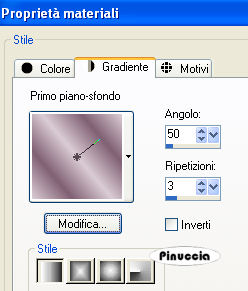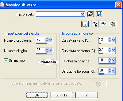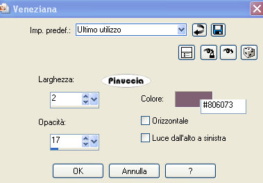 qui puoi trovare qualche risposta ai tuoi dubbi. Se l'argomento che ti interessa non è presente, ti prego di segnalarmelo. Per tradurre questo tutorial ho usato PSP X, ma può essere eseguito anche con le altre versioni di PSP. Occorrente: Materiale: qui Filtri: Xero - Porcelain qui Metti la maschera nella cartella Maschere. Apri il font e minimizzalo nella tua area di lavoro. Lo troverai nella lista dei font disponibili, quando ti servirà. Imposta il colore di primo piano con #daccd4, e il colore di sfondo con #806073 (o scegli due colori dal tube). 1. Apri una nuova immagine trasparente 750 x 550 pixels, e riempila con il colore chiaro.Effetti>Effetti di trama>Veneziana, con i seguenti settaggi e con il colore scuro di sfondo. ![]() 2. Apri il tube con la gondola "Anny Design Gondels Venetie" e vai a Modifica>Copia. Torna al tuo lavoro e vai a Modifica>Incolla come nuovo livello. Sposta la gondola nell'angolo in basso a destra.Abbassa l'opacità di questo livello al 35%. 3. Apri il tube Pascale_121208_Misted_IceRose e vai a Modifica>Copia. Torna al tuo lavoro e vai a Modifica>Incolla come nuovo livello. Sposta il tube in alto quasi al centro dell'immagine:(più tardi, se necessario, potrai spostarlo ancora per sistemarlo meglio): ![]() Abbassa l'opacità di questo livello al 40%. 4. Livelli>Nuovo livello raster. Riempi il livello con il colore scuro.Livelli>Carica/Salva maschera>Carica maschera da disco. Cerca e carica la maschera Claire_masque_gigantesque1: ![]() Livelli>Unisci>Unisci gruppo. Abbassa l'opacità di questo livello al 50%. Sposta questo livello contro il bordo a destra.![]() 5. Apri il tube italy-venice-p-06-3 e vai a Modifica>Copia. Torna al tuo lavoro e vai a Modifica>Incolla come nuovo livello. Immagine>Ridimensiona, al 110%, tutti i livelli non selezionato. Livelli>Duplica. Livelli>Unisci>Unisci giù. Sposta il tube contro il bordo a sinistra.6. Apri il tube Anny_Design_Venetiaans_Mask Regola>Tonalità e saturazione>Viraggio: ![]() Modifica>Copia. Torna al tuo lavoro e vai a Modifica>Incolla come nuovo livello. Immagine>Ruota per gradi - 30 gradi a destra. ![]() Regola>Messa a fuoco>Metti a fuoco. Immagine>Ridimensiona, 2 volte all'80%, tutti i livelli non selezionato. Sposta la maschera nell'angolo in alto a destra.Abbassa l'opacità di questo livello al 90%. 7. Livelli>Nuovo livello raster. Apri il tube del nastro "sexy tattoo ribbon line". Regola>Tonalità e saturazione>Viraggio, con i settaggi precedenti. Modifica>Copia. Torna al tuo lavoro e vai a Modifica>Incolla come nuovo livello. Immagine>Ruota per gradi - 90 gradi a destra: ![]() Sposta il nastro in basso, sopra il bordo.Livelli>Duplica. Sposta il duplicato a destra, in modo che non si noti la giuntura tra i due livelli.Per non far oscillare il tube nello spostamento, usa le frecce della tastiera. per l'uso delle frecce abbinato allo strumento Spostamento vedi qui Livelli>Unisci>Unisci giù. Effetti>Effetti 3D>Sfalsa ombra: ![]() Nella paletta dei livelli sposta questo livello sotto il tube della donna. ![]() 8. Livelli>Nuovo livello raster. Attiva lo strumento Testo , scegli un font o usa quello fornito con il materiale,e scrivi un testo sull'immagine. Effetti>Effetti 3D>Sfalsa ombra: ![]() Ripeti l'Effetto Sfalsa ombra, cambiando verticale e orizzontale con -1. 9. Controlla che tutti i tubes siano al posto giusto. Livelli>Unisci>Unisci tutto. Immagine>Aggiungi bordatura, 2 pixels, simmetriche, con il colore scuro. Effetti>Plugins>Xero - Porcelain, con i seguenti settaggi: ![]() Immagine>Ridimensiona, a 675 pixels di larghezza, tutti i livelli selezionato. Regola>Messa a fuoco>Metti a fuoco, e metti da parte l'immagine per il momento. 10. Apri una nuova immagine trasparente 750 x 550 pixels. Passa il colore di primo piano a Gradiente di primo piano/sfondo, con i seguenti settaggi: ![]() Riempi l'immagine trasparente con questo gradiente.Effetti>Effetti di trama>Mosaico di vetro: ![]() Effetti>Plugins>Xero - Porcelain, con i settaggi precedenti. 11. Attiva la prima immagine che hai messo da parte e vai a Modifica>Copia. Torna alla seconda immagine e vai a Modifica>Incolla come nuovo livello. Effetti>Effetti 3D>Sfalsa ombra: ![]() Ripeti l'Effetto Sfalsa ombra, cambiando verticale e orizzontale con -5. 12. Livelli>Unisci>Unisci tutto. Immagine>Aggiungi bordatura, 2 pixels, simmetriche, con il colore scuro. Hai finito. Puoi salvare in formato jpg. Se hai problemi o dubbi, o trovi un link non funzionante, o anche soltanto per un saluto, scrivimi. 1 Febbraio 2009 |