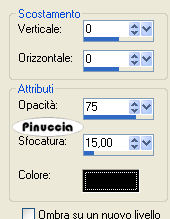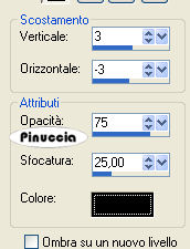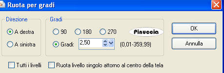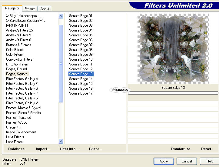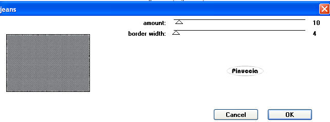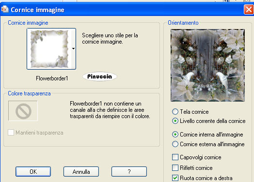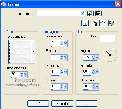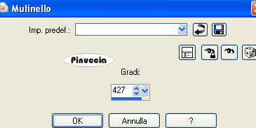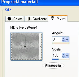 qui puoi trovare qualche risposta ai tuoi dubbi. Se l'argomento che ti interessa non è presente, ti prego di segnalarmelo. Per tradurre questo tutorial ho usato PSP X, ma può essere eseguito anche con le altre versioni di PSP. Occorrente: Materiale qui Filtri: Filters Unlimited qui Penta.com - Jeans qui L&K Zitah qui Animation Shop qui ![]() Metti A.D.Achtergron nella cartella Maschere. Metti il motivo MD-Silverpattern-1 nella cartella Motivi. Metti Flowerborder1 nella cartella Cornici-immagine. Apri il font e minimizzalo insieme al resto del materiale, tranne "candle klein" che ti servirà in Animation Shop. Imposta il colore di primo piano con #d9d8dd, e il colore di sfondo con #7b7d89. 1. Apri una nuova immagine trasparente 800 x 550 pixels, e riempila con il colore scuro.2. Effetti>Effetti di trama>Trama - seleziona la trama Tela semplice, con i seguenti settaggi. ![]() 3. Immagine>Aggiungi bordatura, 3 pixels, simmetriche, con un colore qualsiasi contrastante con quelli del tutorial. Seleziona questo bordo con la bacchetta magica ![]() Passa il colore di primo piano a Motivi e seleziona il motivo MD-Silverpattern1. ![]() Riempi la selezione con questo motivo.Effetti>Plugins>Penta.com - Jeans: ![]() Ripeti l'Effetto Jeans ancora una volta. Effetti>Effetti di bordo>Aumenta di più. Selezione>Deseleziona. 4. Livelli>Duplica. Immagine>Ridimensiona, all'85%, tutti i livelli non selezionato. Effetti>Effetti di distorsione>Mulinello. ![]() Effetti>Effetti 3D>Sfalsa ombra. ![]() 5. Livelli>Duplica - 2 volte. Attiva il livello inferiore. Immagine>Ruota per gradi - 5 gradi a destra. ![]() Attiva il livello della prima copia. Immagine>Ruota per gradi - 2,50 gradi a destra. ![]() Attiva il livello superiore. Livelli>Unisci>Unisci giù. Ancora Livelli>Unisci>Unisci giù. Metti da parte l'immagine per il momento. 6. Apri l'immagine "Achtergrond". Elimina il livello del watermark. Immagine>Cornice-immagine - seleziona Flowerborder con i seguenti settaggi. ![]() 7. Livelli>Duplica. Abbassa l'opacità di questo livello al 50%. Livelli>Unisci>Unisci giù. Immagine>Ridimensiona, al 105%, tutti i livelli non selezionato. Regola>Messa a fuoco>Metti a fuoco. Livelli>Unisci>Unisci giù. Effetti>Plugins>Filters Unlimited 2.0 - Edges Square - Square Edges 13. ![]() 8. Modifica>Copia. Attiva il primo lavoro che hai messo da parte e vai a Modifica>Incolla come nuovo livello. Immagine>Ridimensiona, all'84%, tutti i livelli non selezionato. Effetti>Effetti 3D>Sfalsa ombra, con i settaggi precedenti. Livelli>Duplica - 2 volte. Attiva il livello inferiore (l'originale). Immagine>Ruota per gradi - 5 gradi a destra. Attiva il livello della prima copia. Immagine>Ruota per gradi - 2,5 gradi a destra. Attiva il livello superiore. Livelli>Unisci>Unisci giù - 2 volte. Sposta l'immagine a destra (vedi il mio esempio). 9. Apri A.D.Witte Kerstman e vai a Modifica>copia. Torna al tuo lavoro e vai a Modifica>Incolla come nuovo livello. Immagine>Rifletti. Immagine>Ridimensiona, al 115%, tutti i livelli non selezionato. Regola>Messa a fuoco>Metti a fuoco - 2 volte. Effetti>Effetti 3D>Sfalsa ombra, con i setaggi precedenti. Sposta il tube a sinistra.10. Apri il tube LLD-CandlesSilver. Le candele sono in due livelli separati. Copia i livelli uno alla volta. Sul tuo lavoro Modifica>Incolla come nuovo livello. Posiziona le due candele correttamente.Attiva il livello superiore delle due candele. Livelli>Unisci>Unisci giù. Effetti>Effetti 3D>sfalsa ombra, con i settaggi precedenti. Regola>Messa a fuoco>Metti a fuoco. Sposta le candele sul bordo in basso a destra.11. Controlla che tutto sia al posto giusto. Livelli>Unisci>Unisci tutto. Immagine>Ridimensiona, a 600 pixels di larghezza, tutti i livelli selezionato. 12. Immagine>Dimensione tela. ![]() Livelli>Nuovo livello raster. Riempi il livello con il colore di sfondo.Effetti>Plugins>L & K - Zitah, con i settaggi standard. ![]() Livelli>Disponi>Porta sotto. Attiva il livello superiore. Effetti>Effetti 3D>Sfalsa ombra, con i settaggi precedenti. 13. Inverti i colori nella paletta dei materiali per avere il colore chiaro come colore di sfondo. Chiudi il colore di primo piano. Attiva lo strumento Testo , scegli un font, o usa quello fornito,e scrivi un testo sull'immagine. Immagine>Ruota per gradi - 90 gradi a destra, e posiziona il testo nella striscia chiara a destra. Livelli>Converti in livello raster. Effetti>Effetti 3D>sfalsa ombra. ![]() Ripeti l'Effetto Sfalsa ombra, con questi settaggi. ![]() 14. Apri Yoka-Misc-XMasBell011207-small e vai a Modifica>copia. Torna al tuo lavoro e vai a Modifica>Incolla come nuovo livello. Immagine>Ridimensiona, al 75%, tutti i livelli non selezionato. Immagine>Ruota per gradi - 45 gradi a destra. ![]() Sposta il tube nell'angolo in alto a destra.Effetti>Effetti 3D>sfalsa ombra, con i settaggi precedenti. 15. Livelli>Unisci>Unisci tutto. Immagine>Aggiungi bordatura, 3 pixels, simmetriche, con un colore contrastante. Seleziona questo bordo con la bacchetta magica ![]() e riempilo con il motivo argento.Effetti>Plugins>Penta.com - Jeans, con i settaggi precedenti - 2 volte. Effetti>Effetti di bordo>Aumenta di più. Selezione>Deseleziona. 16. Aggiungi il tuo nome e/o il tuo watermark su un nuovo livello. Livelli>Unisci>Unisci tutto. Immagine>Ridimensiona, a 700 pixels di larghezza. Regola>Messa a fuoco>Metti a fuoco. 17. Modifica>Copia. Apri Animation Shop e vai a Modifica>Incolla>Incolla come nuova animazione. Modifica>Duplica e ripeti finchè non avrai 4 fotogrammi. Puoi anche usare sulla barra degli strumenti le icone corrispondenti, cliccando prima sull'icona copia e poi 3 volte su Incolla dopo. ![]() Clicca sul primo fotogramma per selezionarlo e vai a Modifica>Seleziona tutto. Apri "candle klein", anche questo composto da 4 fotogrammi. Modifica>Seleziona tutto. Modifica>Copia. Torna al tuo lavoro e vai a Modifica>Incolla>Incolla nel fotogramma selezionato. Posiziona la fiammella sulla prima candela e, quando sei certo di aver trovato la posiz