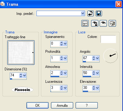 Effetti>Effetti di trama>Trama - seleziona la trama Tratteggio fine, con i seguenti settaggi.