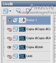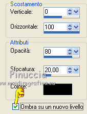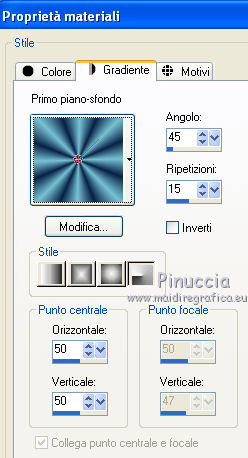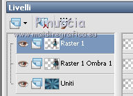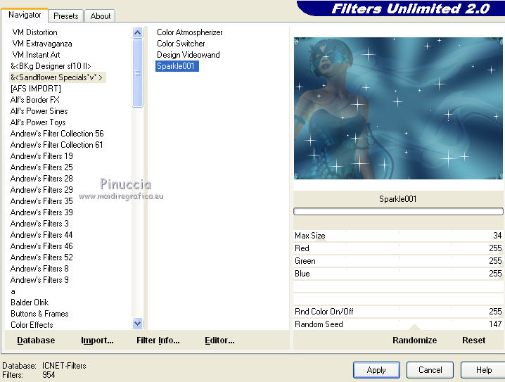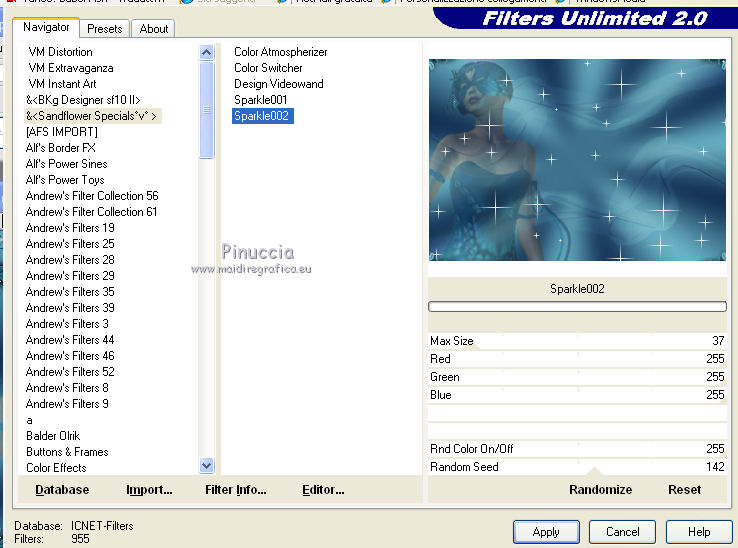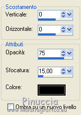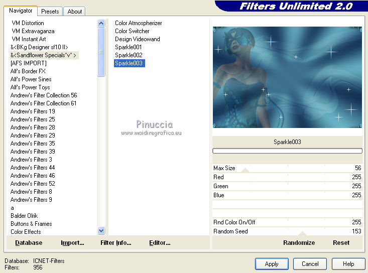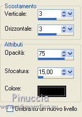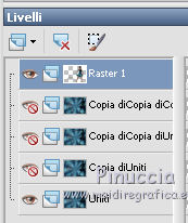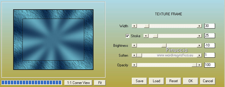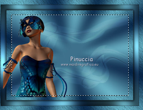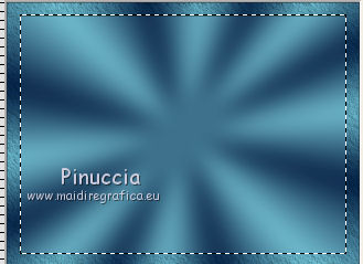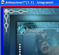 qui puoi trovare qualche risposta ai tuoi dubbi. Se l'argomento che ti interessa non è presente, ti prego di segnalarmelo. Per tradurre questo tutorial ho usato PSP X, ma può essere eseguito anche con le altre versioni di PSP. Occorrente: Materiale qui Filtri: Graphics Plus - Cross Shadow qui AAA Frames - Texture frames qui Filters Unlimited 2.0 qui Sandflower qui I filtri Sandflower si usano importandoli in Filters Unlimited (come fare vedi qui) Animation Shop qui ![]() Imposta il colore di primo piano con #75c2d3, e il colore di sfondo con #092144. 1. Apri una nuova immagine trasparente 800 x 600 pixels. Passa il colore di primo piano a Gradiente, stile radiale: ![]() Riempi l'immagine trasparente con il gradiente.Regola>Sfocatura>Sfocatura gaussiana - raggio 25. ![]() 3. Effetti>Plugins>AAA Frames - Texture Frames: ![]() 4. Duplica il tuo lavoro usando sulla tastiera la combinazione di tasti maiuscola+D e metti da parte questa immagine. 5. Continua sull'originale. Attiva lo strumento Selezione , rettangolo,e seleziona l'interno del bordo. ![]() Effetti>Plugins>Graphics Plus - Cross Shadow, con i settaggi standard. ![]() Selezione>Modifica>Contrai - 30 pixels. Mantieni selezionato. 6. Livelli>Nuovo livello raster. Attiva l'immagine che hai messo da parte prima e vai a Modifica>Copia. Torna al tuo lavoro e vai a Modifica>Incolla nella selezione. Selezione>Deseleziona. Effetti>Effetti 3D>Sfalsa ombra. ![]() Ripeti l'Effetto Sfalsa ombra, cambiando verticale e orizzontale con -3. 7. Apri il tube "smok-colombe" e vai a Modifica>copia. Torna al tuo lavoro e vai a Modifica>Incolla come nuovo livello. Immagine>Ruota per gradi - 45 gradi a destra. ![]() Immagine>Ridimensiona, all'80%, tutti i livelli non selezionato. Sposta l'immagine in basso al centro,e cancella le linee che escono dalla cornice.![]() cambia la modalità di miscelatura di questo livello in Sovrapponi. 8. Livelli>Duplica. Immagine>Rifletti. Immagine>Capovolgi. Livelli>Unisci>Unisci giù, e abbassa l'opacità di questo livello al 40%. 9. Apri il tube "springangel-frauen". Seleziona la parte superiore del tube.![]() Modifica>Copia. Selezione>Deseleziona e minimizza il tube che ti servirà ancora. Torna al tuo lavoro e vai a Modifica>Incolla come nuovo livello. Immagine>Ridimensiona, al 170%, tutti i livelli non selezionato. Sposta il tube a sinistra, come nel mio esempio.Seleziona la cornice interna.![]() Selezione>Inverti. Premi sulla tastiera il tasto CANC. Selezione>Deseleziona. Abbassa l'opacità di questo livello al 35%. 10. Apri il tube "diamonds" e vai a Modifica>Copia. Torna al tuo lavoro e vai a Modifica>Incolla come nuovo livello. Spostalo in alto sul bordo.Effetti>Effetti 3D>Sfalsa ombra: ![]() Ripeti l'Effetto Sfalsa ombra con questi settaggi: ![]() Livelli>Duplica. Immagine>Capovolgi. Livelli>Unisci>Unisci giù. 11. Modifica>Incolla come nuovo livello (il tube è ancora in memoria). Immagine>Ruota per gradi - 90 gradi a sinistra. ![]() Spostalo nel bordo a sinistra.Ripeti i due Effetti Sfalsa ombra, come al punto 10. Livelli>Duplica. Immagine>Rifletti. Livelli>Unisci>Unisci giù. Ripeti Livelli>Unisci>Unisci giù. 11. Apri il tube "plumesgris" e vai a Modifica>Copia. Torna al tuo lavoro e vai a Modifica>Incolla come nuovo livello. Regola>Tonalità e saturazione>Viraggio. ![]() Immagine>Ridimensiona, 2 volte al 70%, tutti i livelli non selezionato. Sposta la piuma nell'angolo in alto a sinistra (vedi il mio esempio).Regola>Messa a fuoco>Metti a fuoco. Effetti 3D>Sfalsa ombra: ![]() Livelli>Duplica. Immagine>Rifletti. Livelli>Unisci>Unisci giù. Livelli>Duplica. Immagine>Capovolgi. Livelli>Unisci>Unisci giù. 13. Apri "corner1" e vai a Modifica>Copia. Torna al tuo lavoro e vai a Modifica>Incolla come nuovo livello. Immagine>Ridimensiona, all'85%, tutti i livelli non selezionato. Spostalo nell'angolo in alto a sinistra.Regola>Messa a fuoco>Metti a fuoco. Effetti>Effetti 3D>Sfalsa ombra: ![]() Livelli>Duplica. Immagine>Rifletti. Livelli>Unisci>Unisci giù. Livelli>Duplica. Immagine>Capovolgi. Livelli>Unisci>Unisci giù. Livelli>Unisci>Unisci visibile. 14. Attiva il tube della donna e vai a Modifica>Copia. Torna al tuo lavoro e vai a Modifica>Incolla come nuovo livello. Immagine>Ridimensiona, al 95%, tutti i livelli non selezionato. Regola>Messa a fuoco>Metti a fuoco. Sposta il tube a destra.Effetti>Effetti 3D>Sfalsa ombra, ombra su nuovo livello selezionato. ![]() Attiva il livello del tube. 15. Apri il file di testo "tekst" e vai a Modifica>Copia. Torna al tuo lavoro e vai a Modifica>Incolla come nuovo livello. Posiziona correttamente il testo.Livelli>Unisci>Unisci giù. Aggiungi il tuo nome e/o il tuo watermark su un nuovo livello. Livelli>Unisci>Unisci giù. Se tutto è andato bene, questa dovrebbe essere la tua paletta dei livelli, con il livello del tube unito con il testo e il watermark, il livello dell'ombra e il livello inferiore Uniti. ![]() Chiudi il livello del tube. Livelli>Unisci>Unisci visibile. Attiva lo strumento Selezione , rettangolo e seleziona l'interno dei bordi, come nell'esempio.![]() Livelli>Duplica - 3 volte e rimani posizionato sul livello della terza copia. Effetti>Plugins>Filters Unlimited 2.0 - Sandflower specials "v" - Sparkle001, con i settaggi standard. ![]() Attiva il livello sottostante. Effetti>Plugins>Filters Unlimited 2.0 - Sandflower specials "v" - Sparkle 002, con i settaggi standard. ![]() Attiva il livello sottostante. Effetti>Plugins>Filters Unlimited 2.0 - Sandflower specials "v" - Sparkle003, con i settaggi standard. ![]() Attiva il livello inferiore. Ripeti Effetti>Plugins>Filters Unlimited 2.0 - Sandflower specials "v" - Sparkle002, con i settaggi standard. Selezione>Deseleziona. Chiudi i livelli delle copie. ![]() Modifica>Copia Unione. Apri Animation Shop e vai a Modifica>Incolla>Incolla come nuova animazione. Torna in PSP. Chiudi il livello base e apri il livello della prima copia. ![]() Modifica>Copia Unione. Torna in Animation Shop e vai a Modifica>Incolla>Incolla do