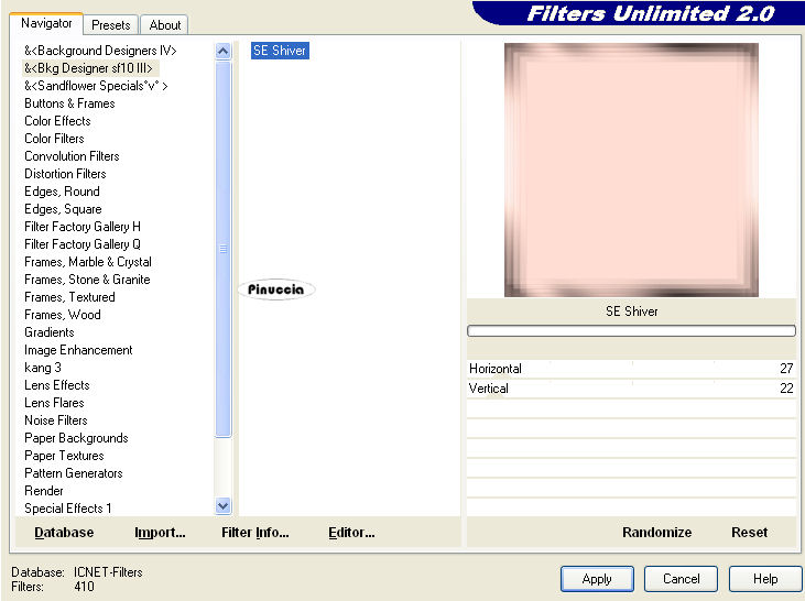 Effetti>Plugins>Filters Unlimited 2.0 - &<Background Designers sf10III> - SE Shiver, con i settaggi standard.