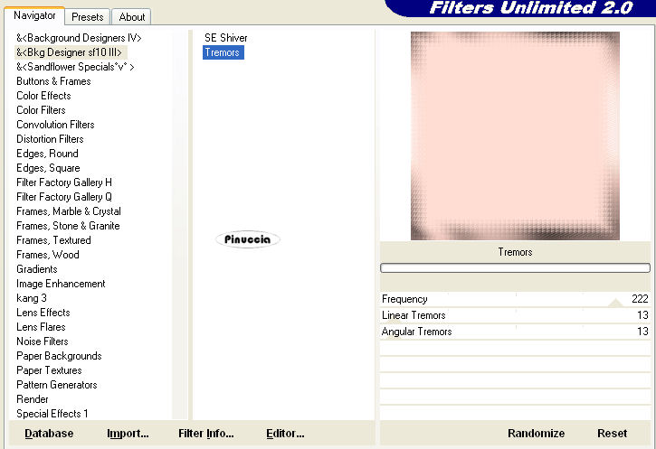 Effetti>Plugins>FIlters Unlimited 2.0 - &<Background Designers sf10III> - Tremors, con i settaggi standard.