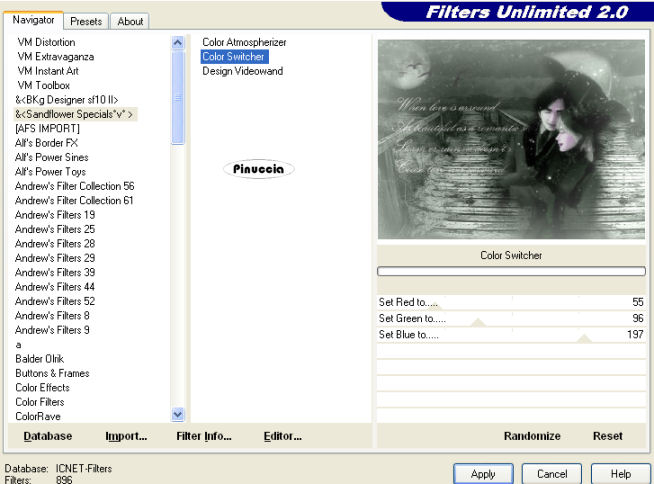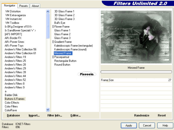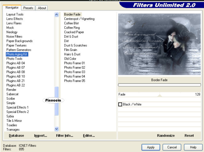 qui puoi trovare qualche risposta ai tuoi dubbi. Se l'argomento che ti interessa non è presente, ti prego di segnalarmelo. Per tradurre questo tutorial ho usato PSP X, ma può essere eseguito anche con le altre versioni di PSP. Occorrente: Materiale qui Filtri: Filters Unlimited qui Photo Aging Kit qui Sandflower Special qui i filtri Photo Aging Kit e Sandflower si usano importandoli in Filters Unlimited (come fare vedi qui) Animation Shop qui se non vuoi sentire la musica premi il tasto ESC Imposta il colore di primo piano con #101928. 1. Apri una nuova immagine trasparente 800 x 600 pixels, e riempila con il colore di primo piano.2. Livelli>nuovo livello raster. Selezione>Seleziona tutto. Apri il tube con il mare "zee" e vai a Modifica>copia. Torna al tuo lavoro e vai a Modifica>Incolla nella selezione. Selezione>Deseleziona. Cambia la modalità di miscelatura di questo livello in Luminanza (esistente), e abbassa l'opacità al 30%. ![]() 3. Apri il tube kts_39v_7copie e vai a Modifica>copia. Torna al tuo lavoro e vai a Modifica>Incolla come nuovo livello. Sposta il tube in basso a sinistra.Cambia la modalità di miscelatura di questo livello in Luminanza (esistente). Livelli>Duplica. Immagine>Rifletti. Sposta il tube tutto a destra in modo che si sovrapponga con l'origine soltanto all'inizio.![]() 4. Apri il tube dws-art_27-8-4-08 e vai a Modifica>Copia. Torna al tuo lavoro e vai a Modifica>Incolla come nuovo livello. Sposta il tube nell'angolo in alto a sinistra.Cambia la modalità di miscelatura di questo livello in Luminanza (esistente), e abbassa l'opacità al 50%. 5. Apri sissy-vogels e vai a Modifica>copia. Torna al tuo lavoro e vai a Modifica>Incolla come nuovo livello. Sposta gli uccelli sulla luna.6. Apri Beautiful_lies_by_ellaine e vai a Modifica>copia. Torna al tuo lavoro e vai a Modifica>Incolla come nuovo livello. se stai usando un altro tube, cambia la modalità di miscelatura del tuo tube in Luminanza (esistente). Immagine>Ridimensiona, 2 volte all'80%, tutti i livelli non selezionato. Sposta il tube a destra.7. Apri il tube con il testo e vai a Modifica>copia. Torna al tuo lavoro e vai a Modifica>Incolla come nuovo livello. Spostalo a sinistra, non troppo vicino al bordo, perchè più tardi avrai una cornice di quasi 30 pixels.![]() Livelli>Unisci>Unisci visibile. 8. Effetti>Plugins>Filters Unlimited - Photo Aging Kit - Border Fade. ![]() Effetti>Plugins>Filters Unlimited - Sandflower Specials - Color switcher con i settaggi standard. ![]() Effetti>Plugins>Filters Unlimited - Button and Frames - Mirror Framed. ![]() 9. Selezione>Seleziona tutto. Selezione>Modifica>Contrai - 29 pixels. Modifica>Copia. Livelli>Nuovo livello raster. Modifica>Incolla nella selezione. Effetti>Effetti 3D>Sfalsa ombra. ![]() Ripeti l'Effetto Sfalsa ombra, cambiando verticale e orizzontale con -3. Selezione>Deseleziona. 10. Livelli>Unisci>Unisci tutto. Immagine>Aggiungi bordatura, 2 pixels, simmetriche, con il colore #262e26. Aggiungi il tuo nome e/o il tuo watermark su un nuovo livello. Livelli>Unisci>Unisci tutto. Regola>Messa a fuoco>Metti a fuoco. 11. Selezione>Seleziona tutto. Selezione>Modifica>Contrai - 31 pixels. Mantieni selezionato. Livelli>Duplica - 3 volte e avrai 4 livelli. ![]() Attiva il livello superiore. Apri Regentubes e vai a Modifica>copia. Torna al tuo lavoro e vai a Modifica>Incolla nella selezione. Attiva il livello sottostante. Apri Regen 2 e vai a Modifica>copia. Torna al tuo lavoro e vai a Modifica>Incolla nella selezione. Attiva il livello sottostante (il secondo dal basso). Apri Regen 3 e vai a Modifica>copia. Torna al tuo lavoro e vai a Modifica>Incolla nella selezione. Attiva il livello inferiore. Apri Regen 4 e vai a Modifica>copia. Torna al tuo lavoro e vai a Modifica>Incolla nella selezione. Selezione>Deseleziona. Se vuoi, ridimensiona l'immagine. Salva il lavoro in formato pspimage. ![]() 13. Apri Animation Shop e apri l'immagine che hai appena salvato. Modifica>Seleziona tutto. Animazione>Proprietà fotogramma e imposta la velocità a 13. Controlla il risultato cliccando su Visualizza e salva in formato gif.![]() Se hai problemi o dubbi, o trovi un link non funzionante, o anche soltanto per un saluto, scrivimi. 16 Novembre 2009 |